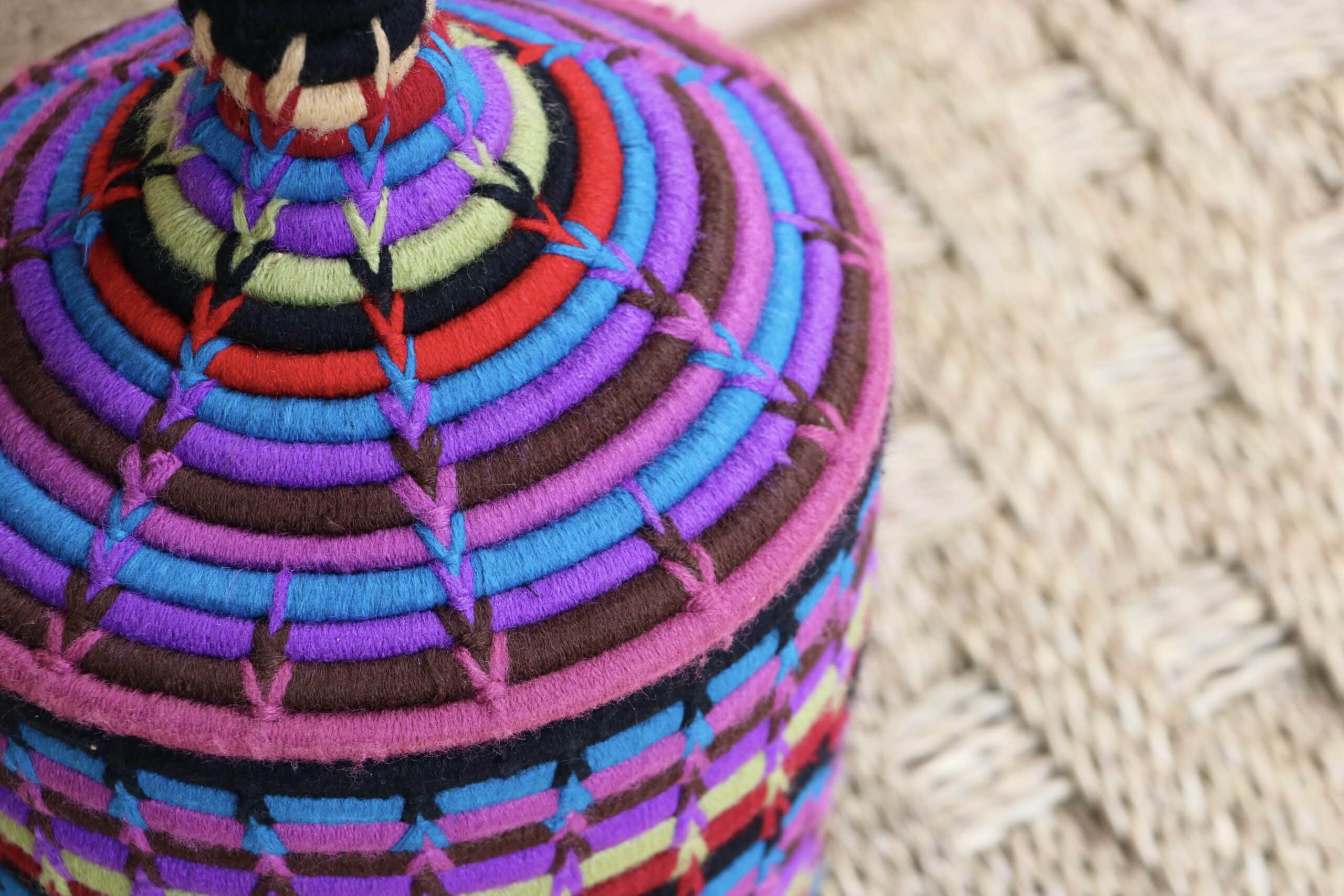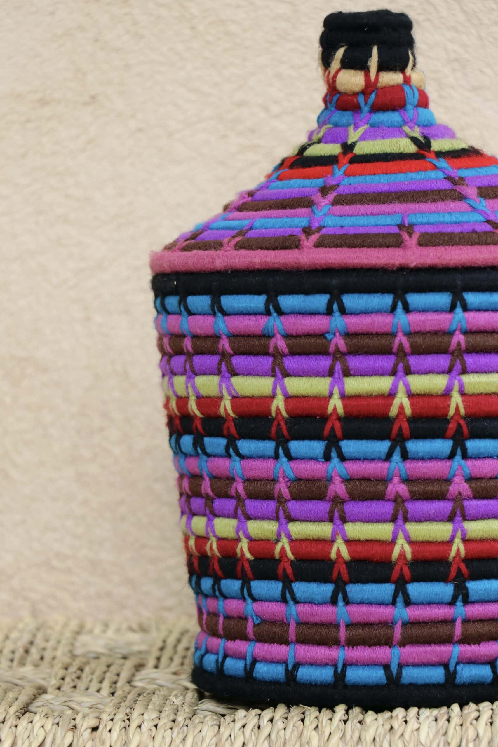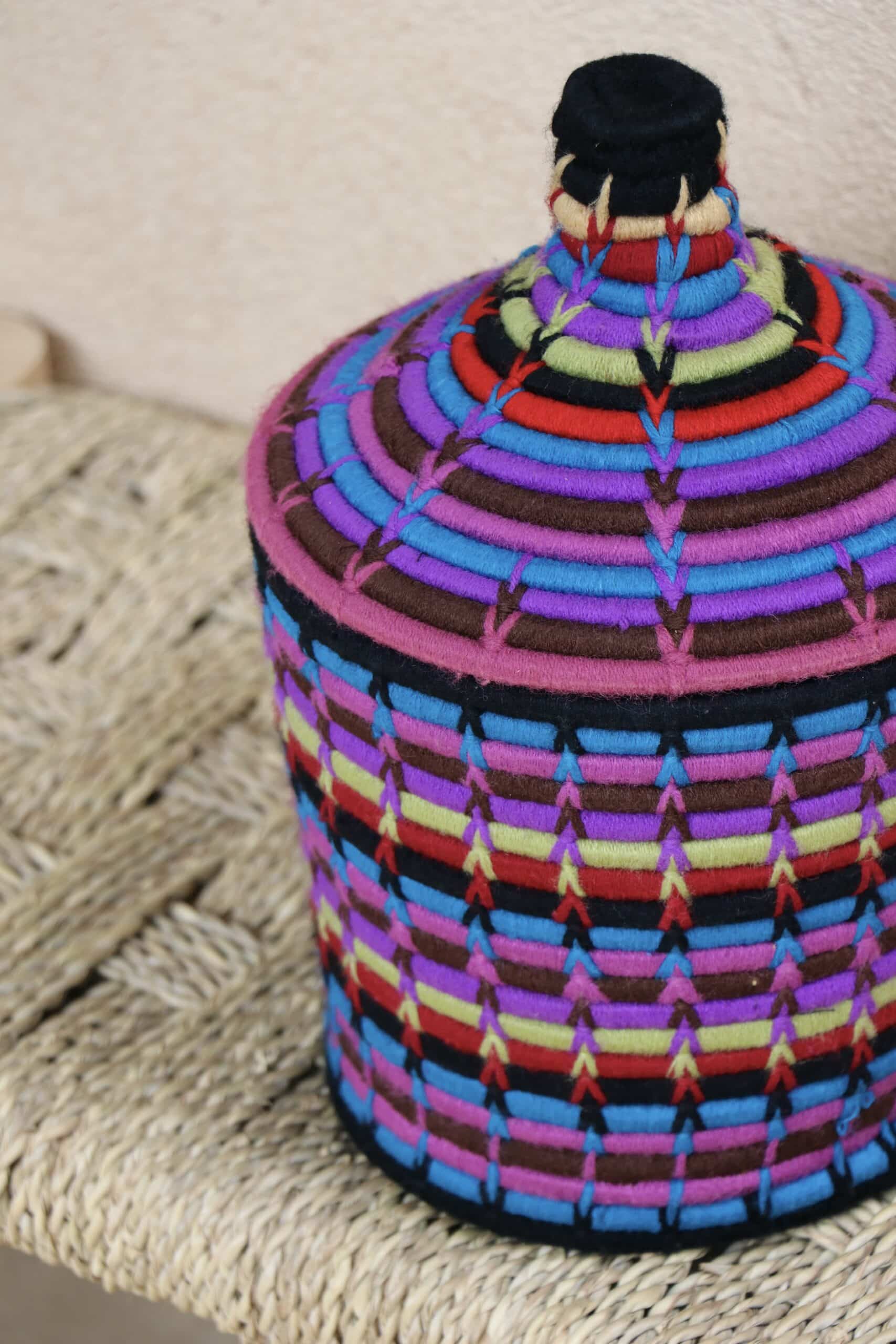Parfaites pour pimper son intérieur de façon authentique tout en étant pratiques pour le rangement de petits objets, les corbeilles berbères sont fabriquées de fibres végétales pour former une base : cette fibre est appelée alfa, une plante vivace et robuste qui est originaire de l’ouest du bassin méditerranéen. Ces fibres végétales sont ensuite décorées en tissant à la main du fil de laine, de coton ou acrylique (souvent issue du recyclage) pour les couleurs fluo.