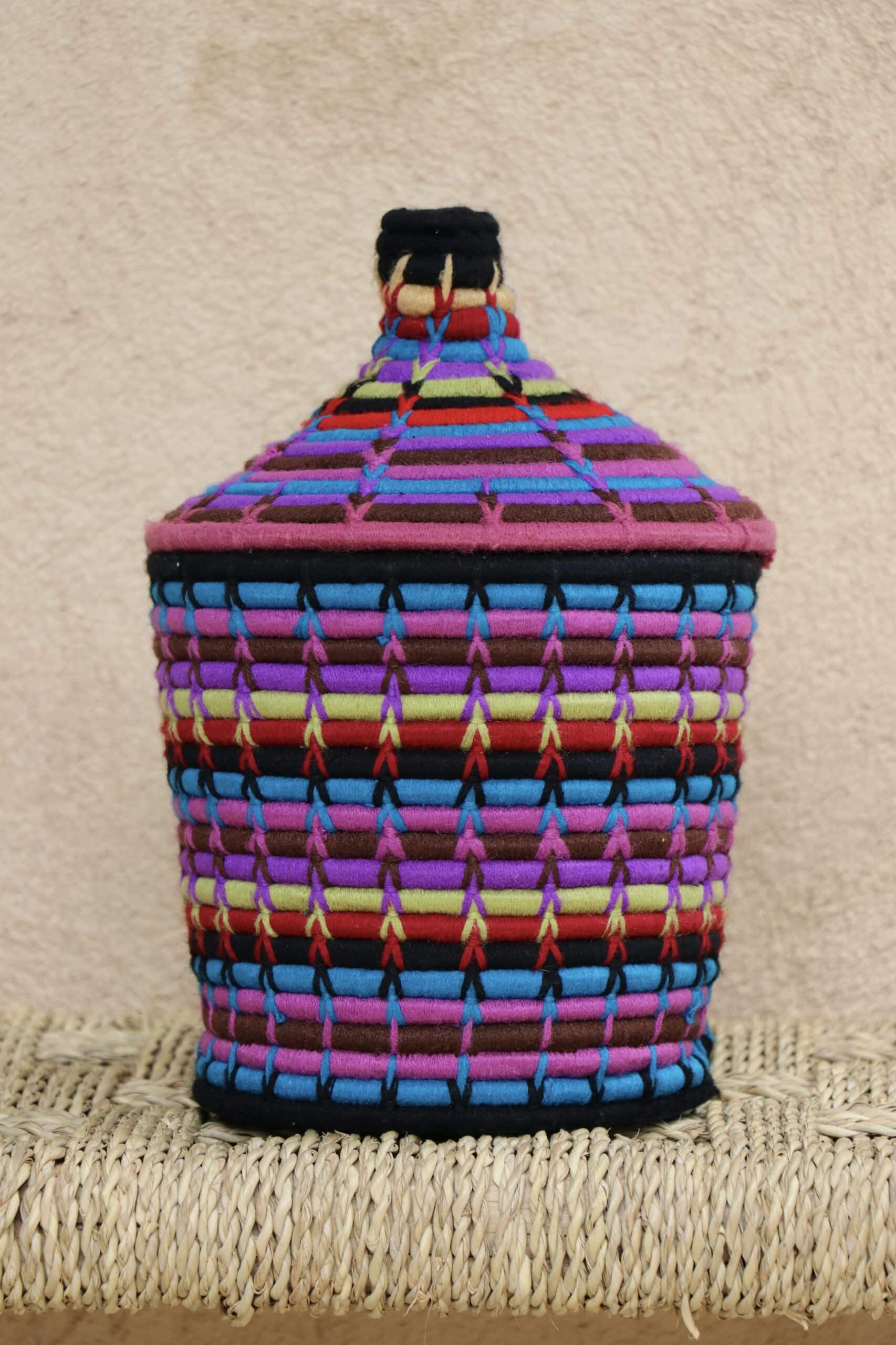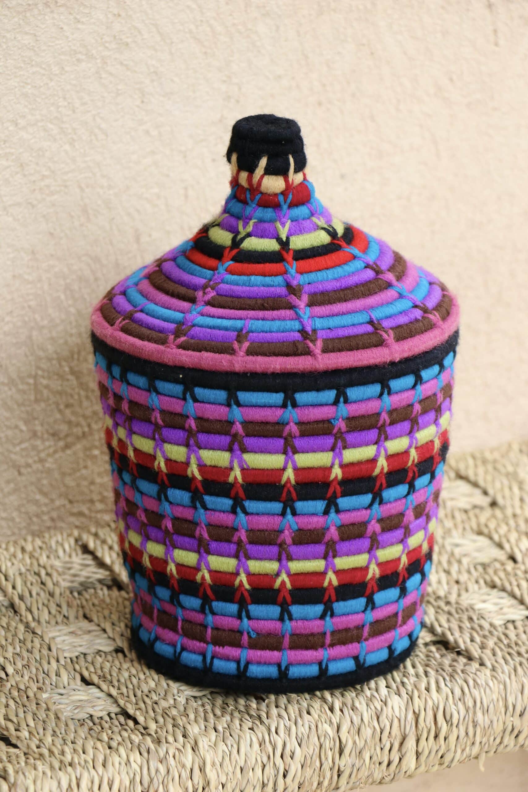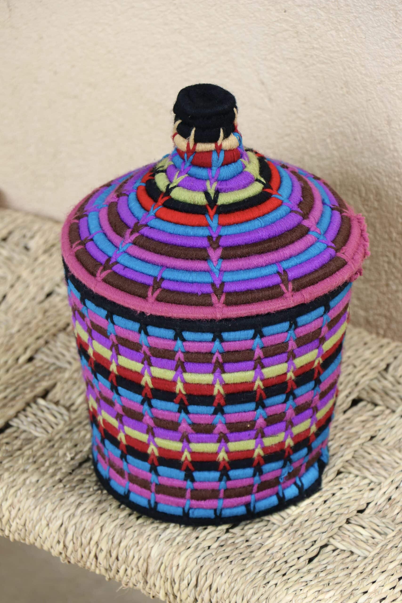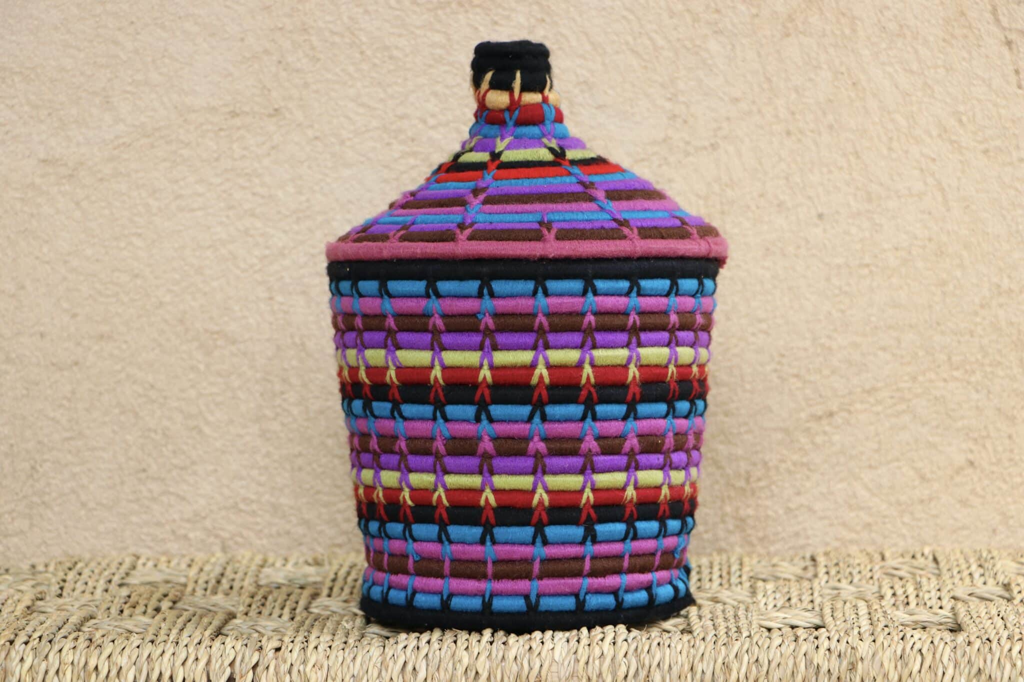 Parfaites pour pimper son intérieur de façon authentique tout en étant pratiques pour le rangement de petits objets, les corbeilles berbères sont fabriquées de fibres végétales pour former une base : cette fibre est appelée alfa, une plante vivace et robuste qui est originaire de l’ouest du bassin méditerranéen. Ces fibres végétales sont ensuite décorées en tissant à la main du fil de laine, de coton ou acrylique (souvent issue du recyclage) pour les couleurs fluo.