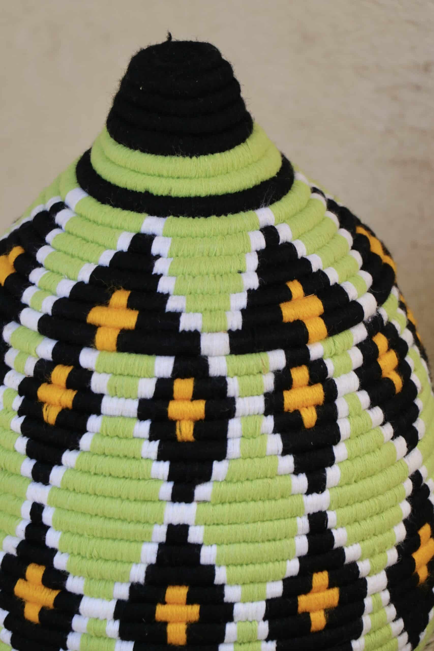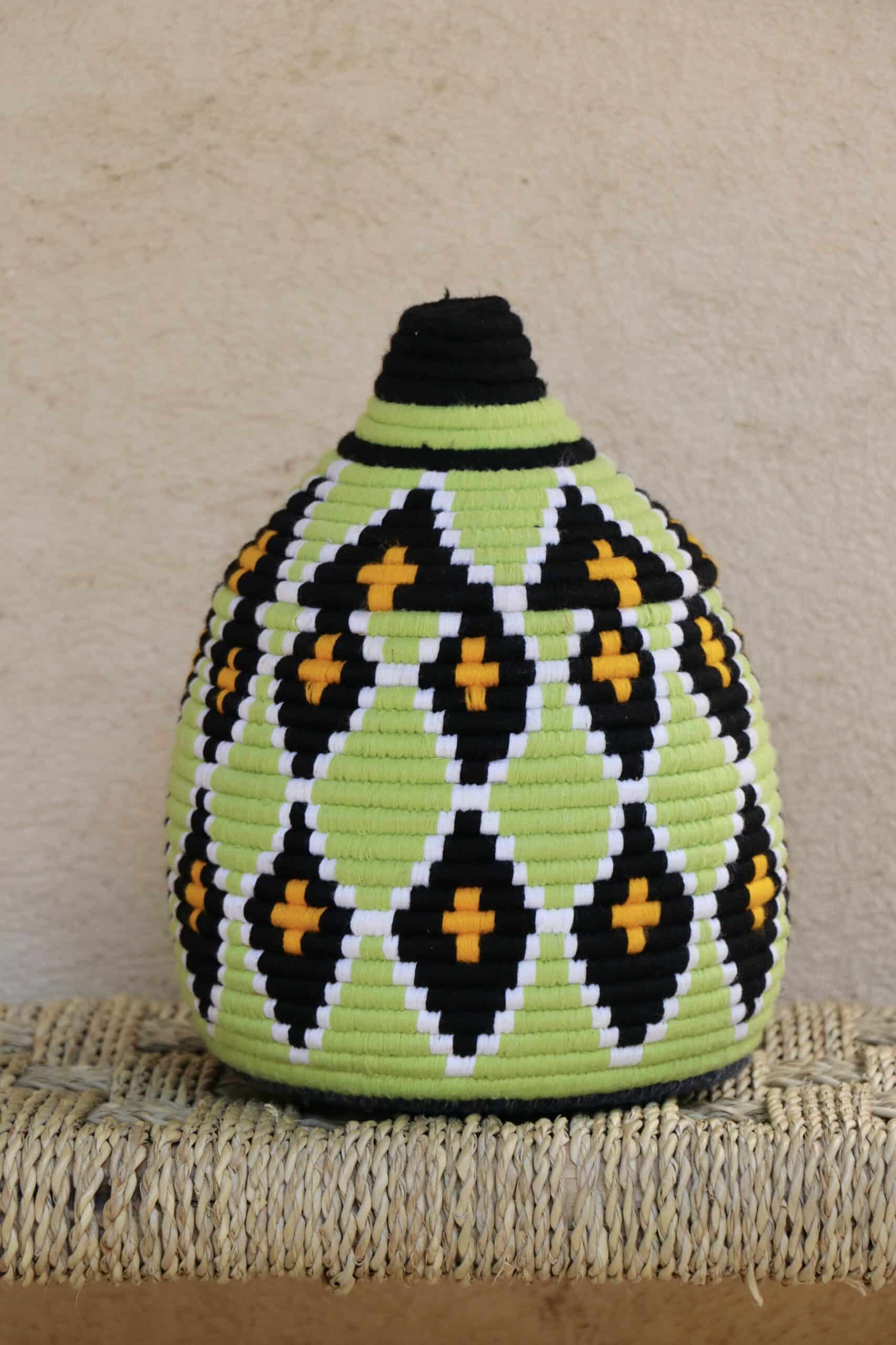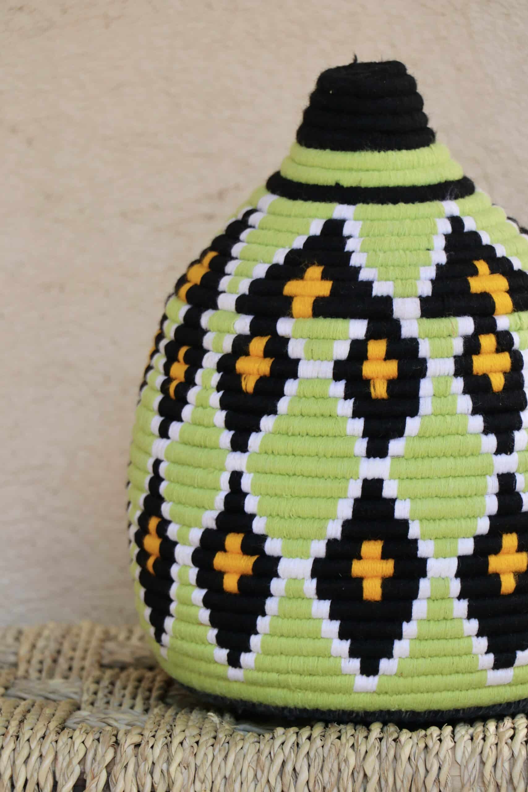 Parfaites pour pimper son intérieur de façon authentique tout en étant pratiques pour le rangement de petits objets, les corbeilles berbères sont fabriquées de fibres végétales pour former une base : cette fibre est appelée alfa, une plante vivace et robuste qui est originaire de l’ouest du bassin méditerranéen. Ces fibres végétales sont ensuite décorées en tissant à la main du fil de laine, de coton ou acrylique (souvent issue du recyclage) pour les couleurs fluo.