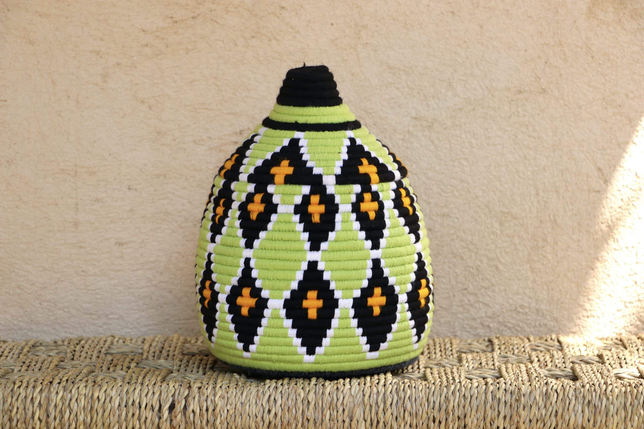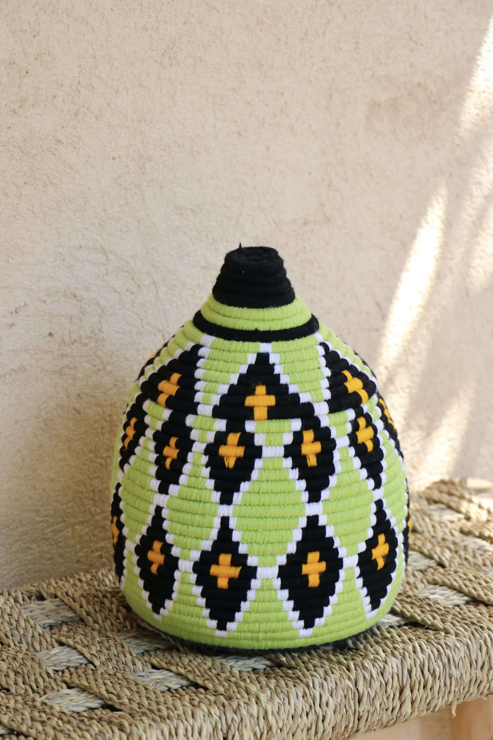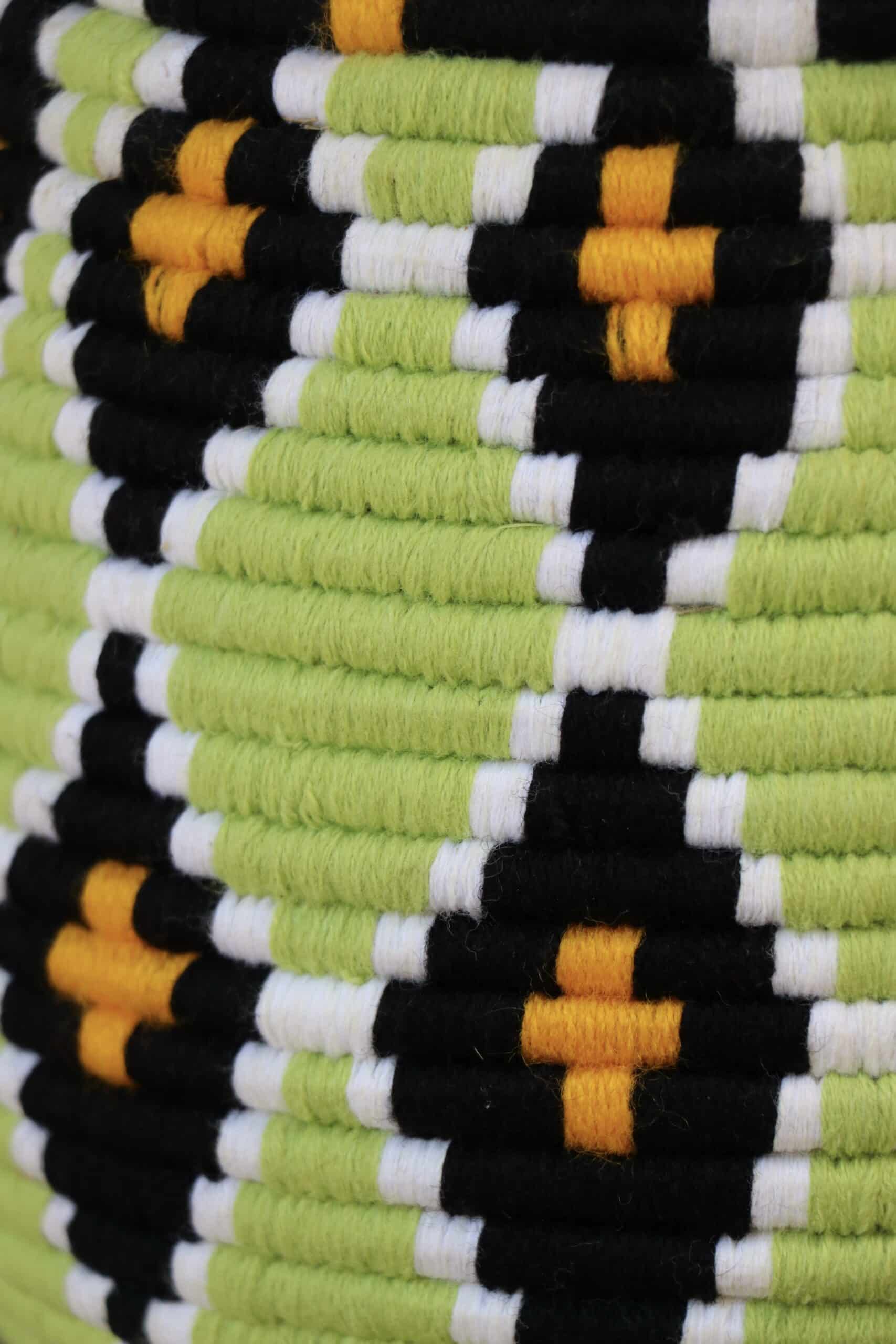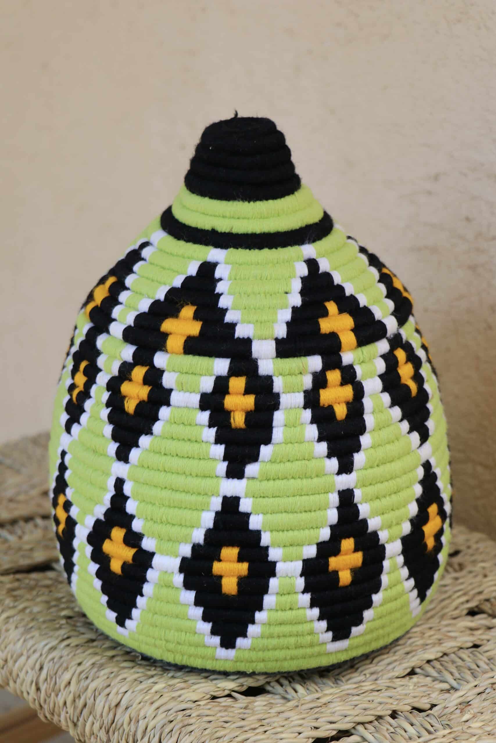 Parfaites pour pimper son intérieur de façon authentique tout en étant pratiques pour le rangement de petits objets, les corbeilles berbères sont fabriquées de fibres végétales pour former une base : cette fibre est appelée alfa, une plante vivace et robuste qui est originaire de l’ouest du bassin méditerranéen. Ces fibres végétales sont ensuite décorées en tissant à la main du fil de laine, de coton ou acrylique (souvent issue du recyclage) pour les couleurs fluo.