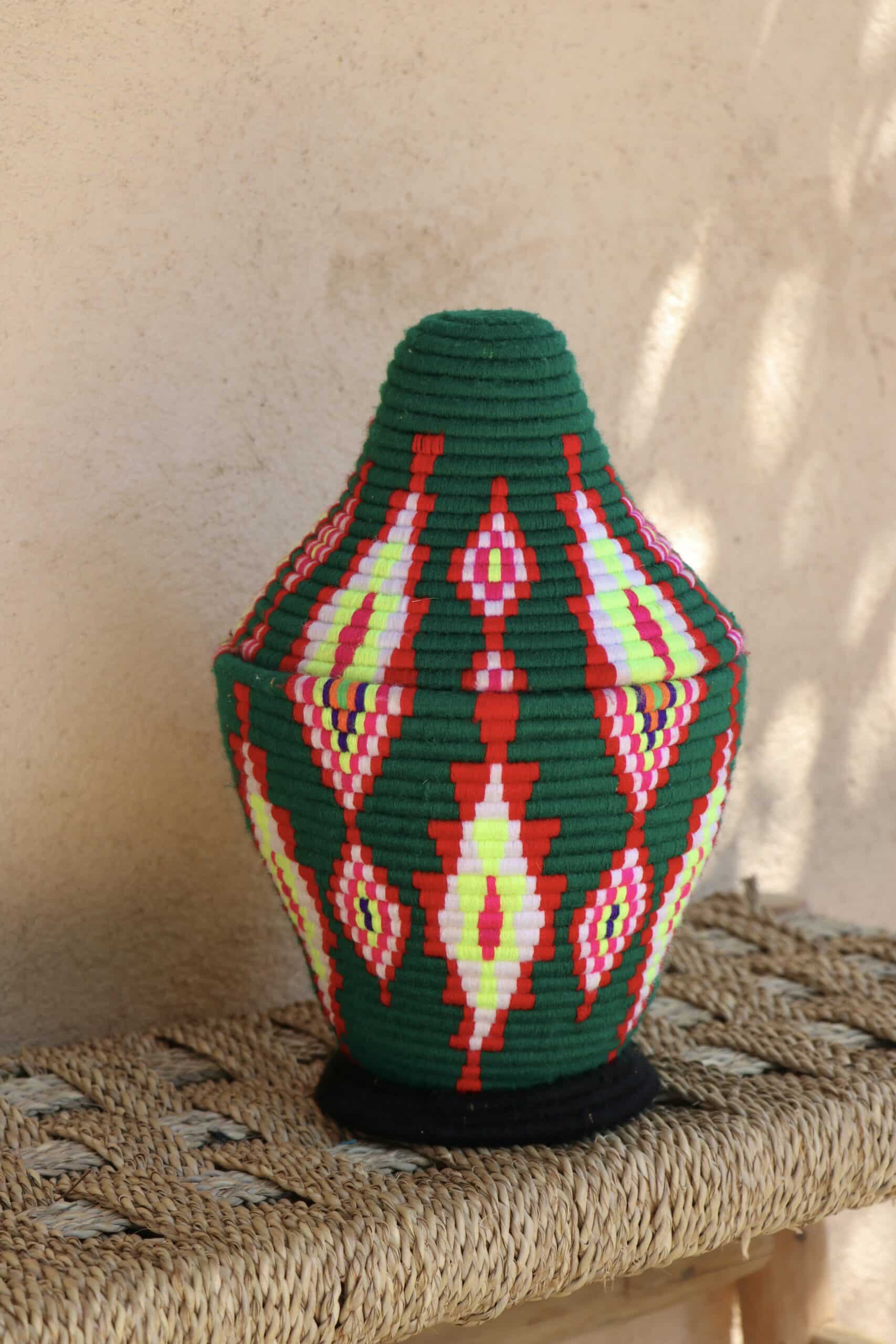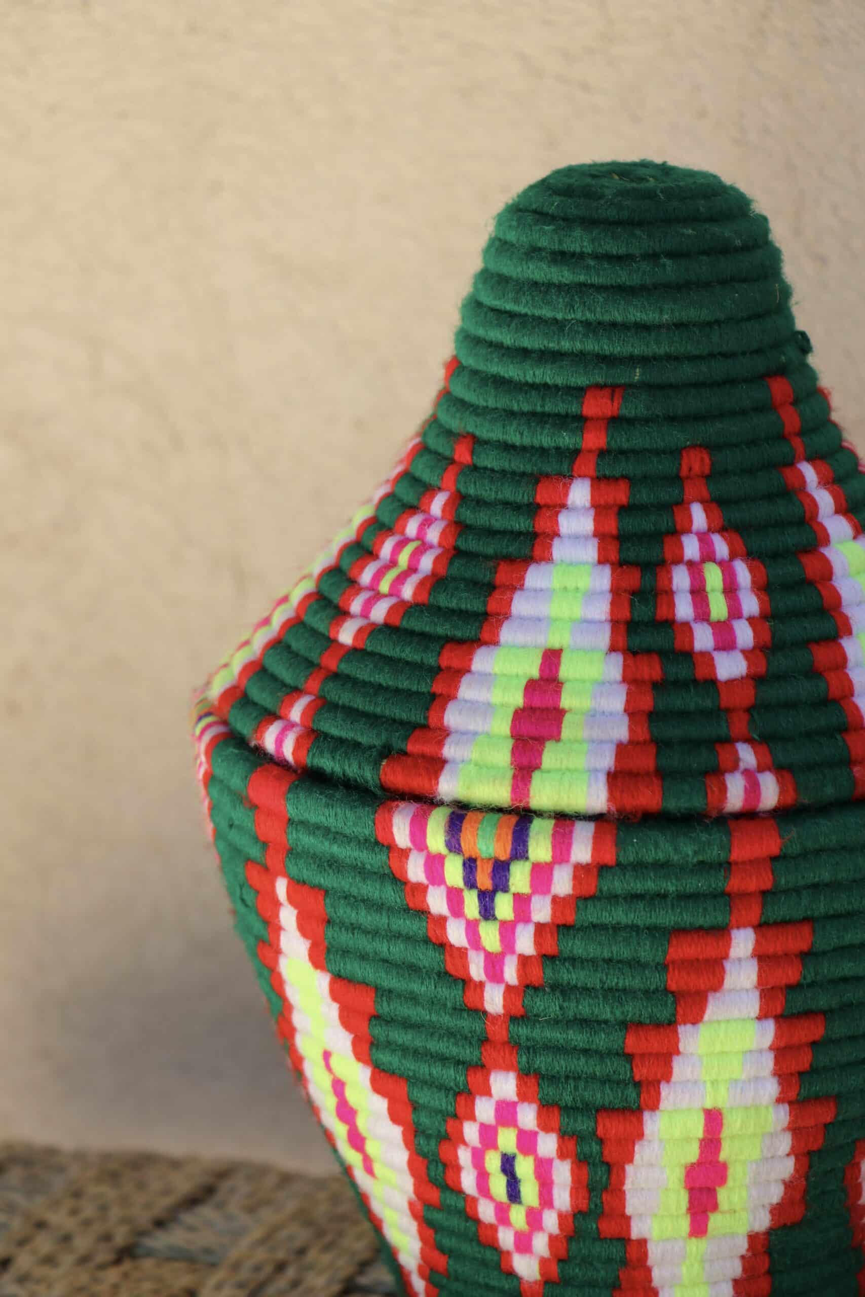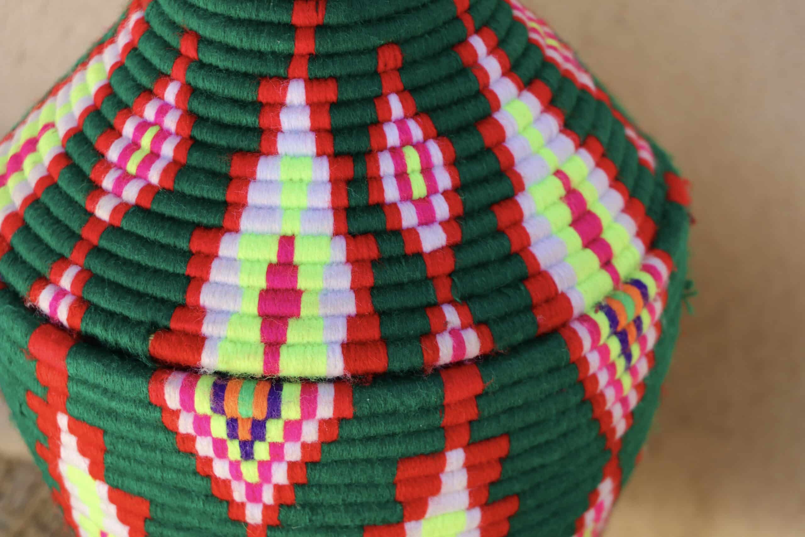 Parfaites pour pimper son intérieur de façon authentique tout en étant pratiques pour le rangement de petits objets, les corbeilles berbères sont fabriquées de fibres végétales pour former une base : cette fibre est appelée alfa, une plante vivace et robuste qui est originaire de l’ouest du bassin méditerranéen. Ces fibres végétales sont ensuite décorées en tissant à la main du fil de laine, de coton ou acrylique (souvent issue du recyclage) pour les couleurs fluo.