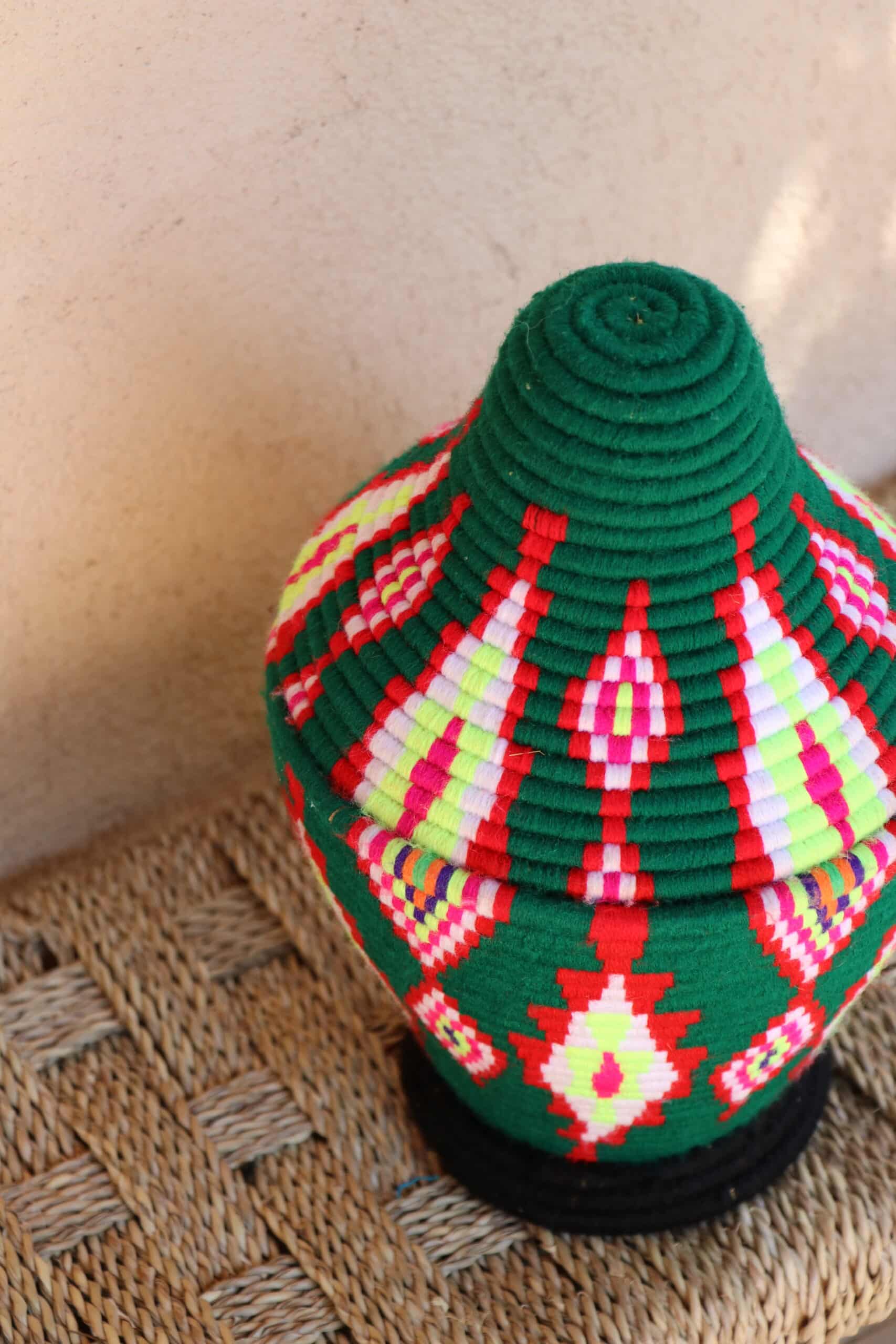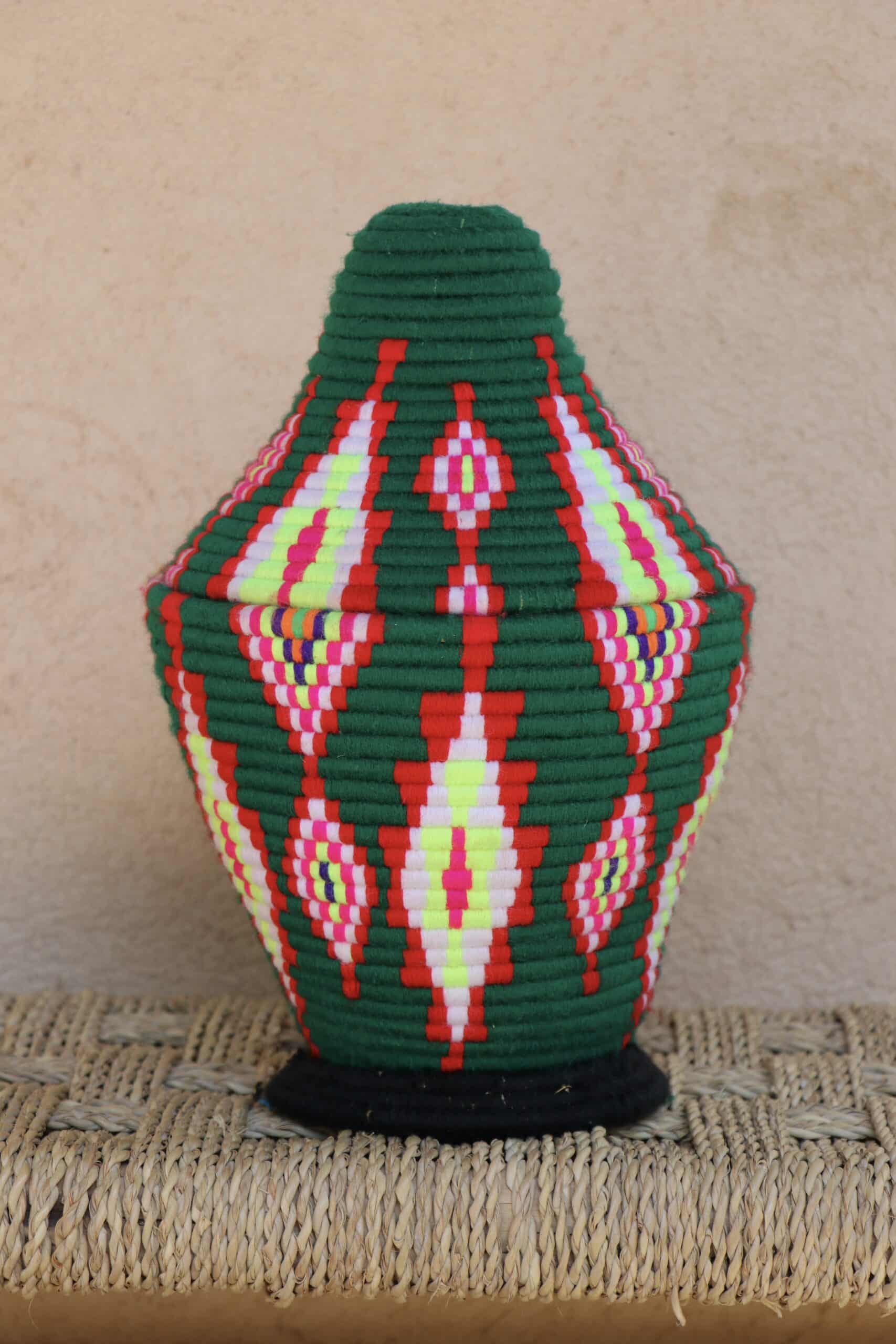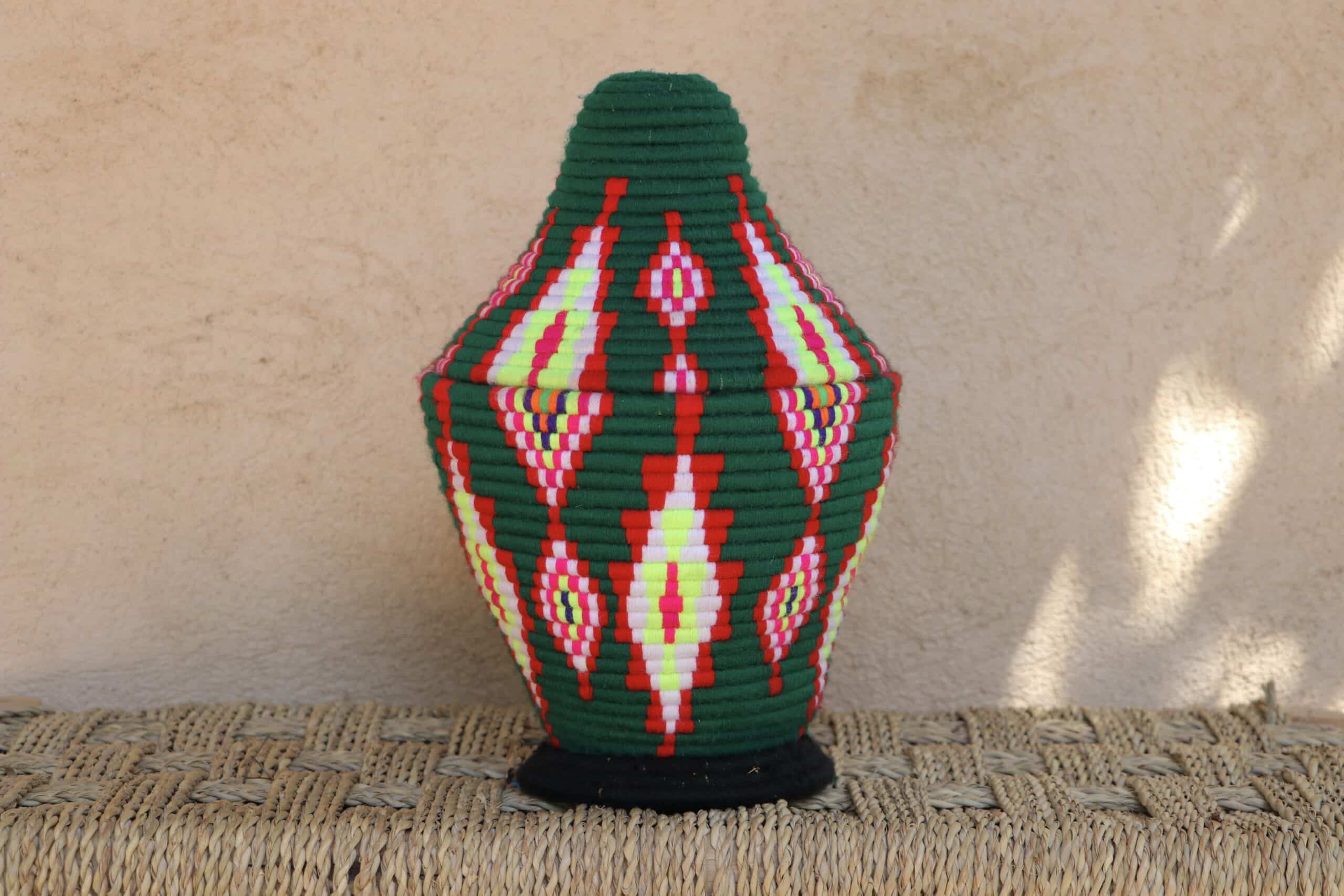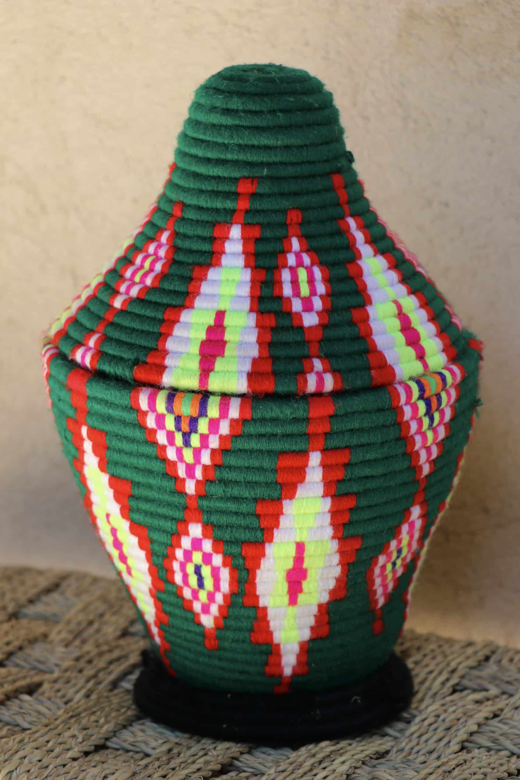 Parfaites pour pimper son intérieur de façon authentique tout en étant pratiques pour le rangement de petits objets, les corbeilles berbères sont fabriquées de fibres végétales pour former une base : cette fibre est appelée alfa, une plante vivace et robuste qui est originaire de l’ouest du bassin méditerranéen. Ces fibres végétales sont ensuite décorées en tissant à la main du fil de laine, de coton ou acrylique (souvent issue du recyclage) pour les couleurs fluo.