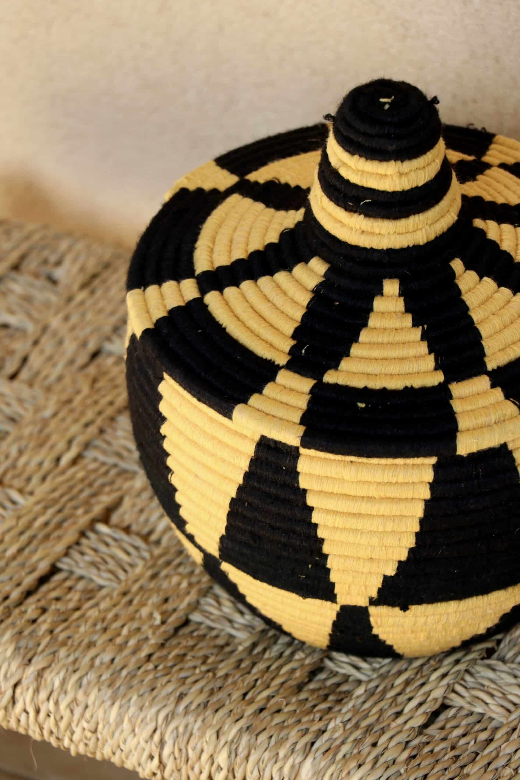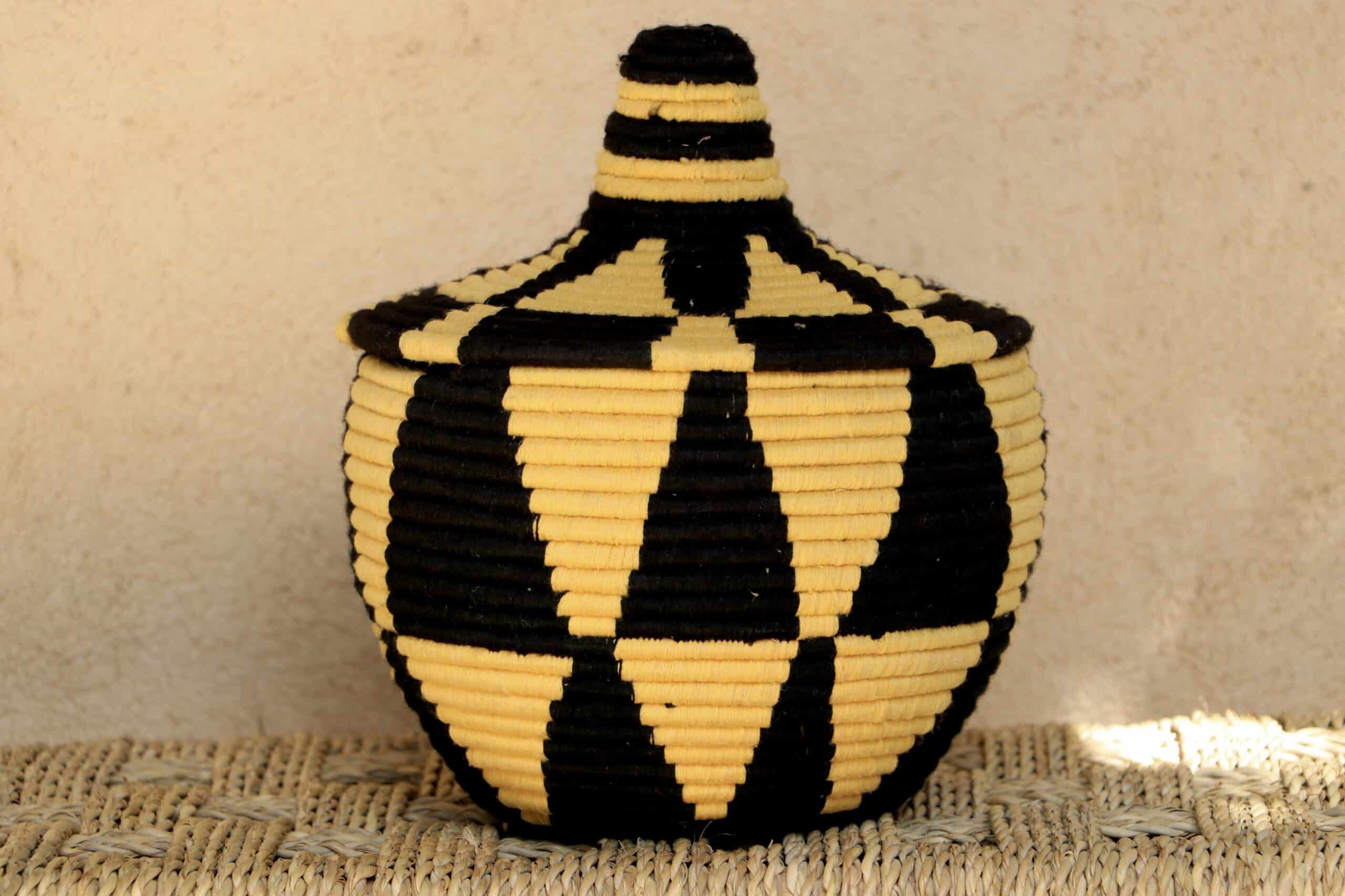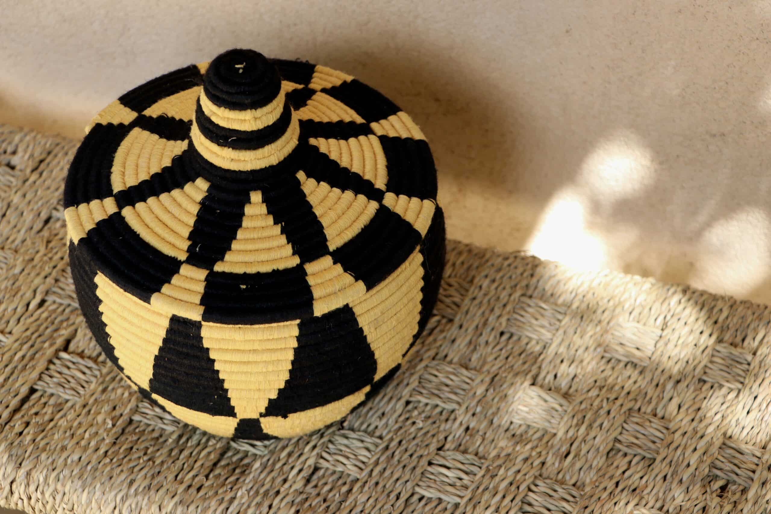 Parfaites pour pimper son intérieur de façon authentique tout en étant pratiques pour le rangement de petits objets, les corbeilles berbères sont fabriquées de fibres végétales pour former une base : cette fibre est appelée alfa, une plante vivace et robuste qui est originaire de l’ouest du bassin méditerranéen. Ces fibres végétales sont ensuite décorées en tissant à la main du fil de laine, de coton ou acrylique (souvent issue du recyclage) pour les couleurs fluo.