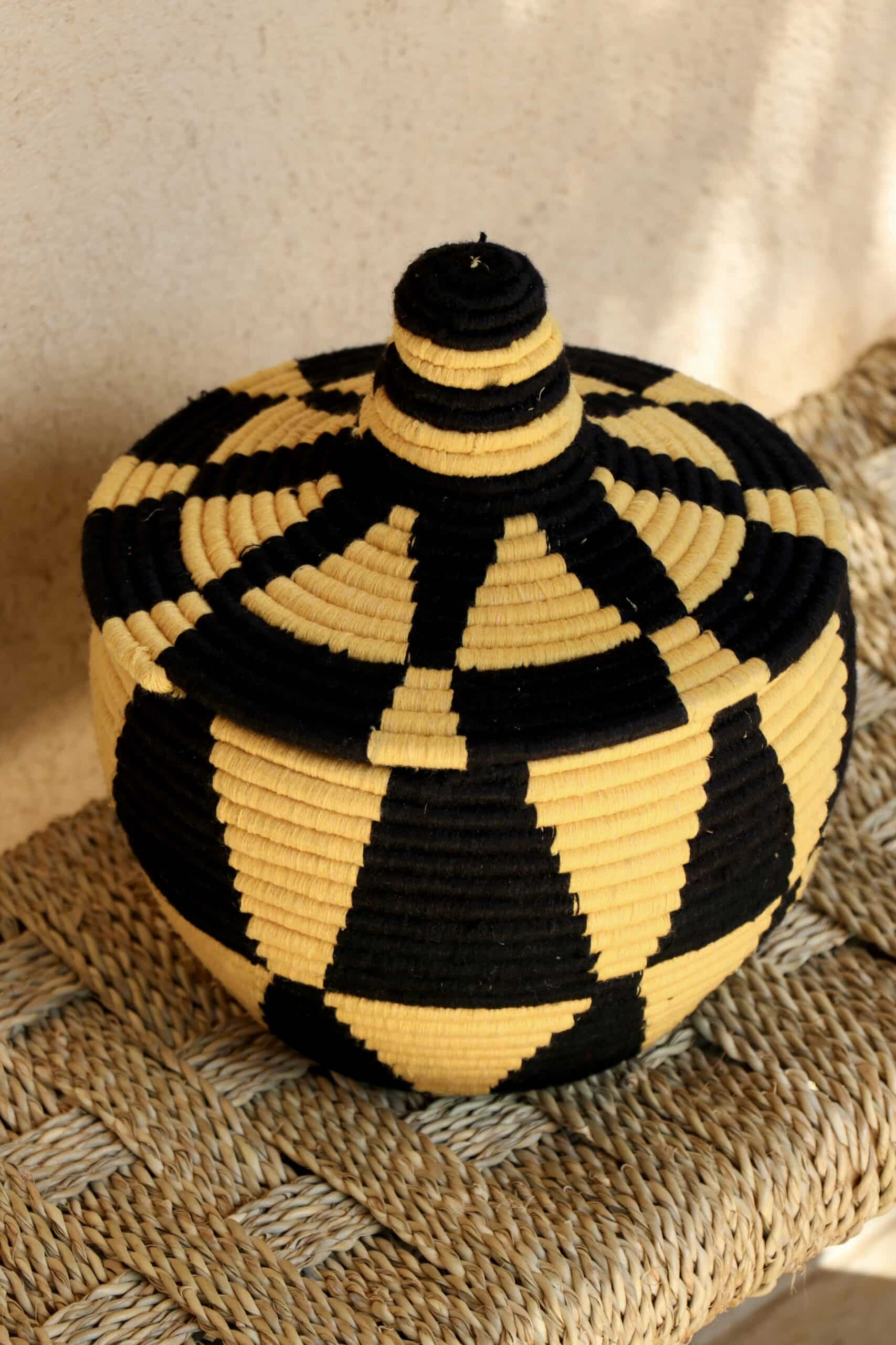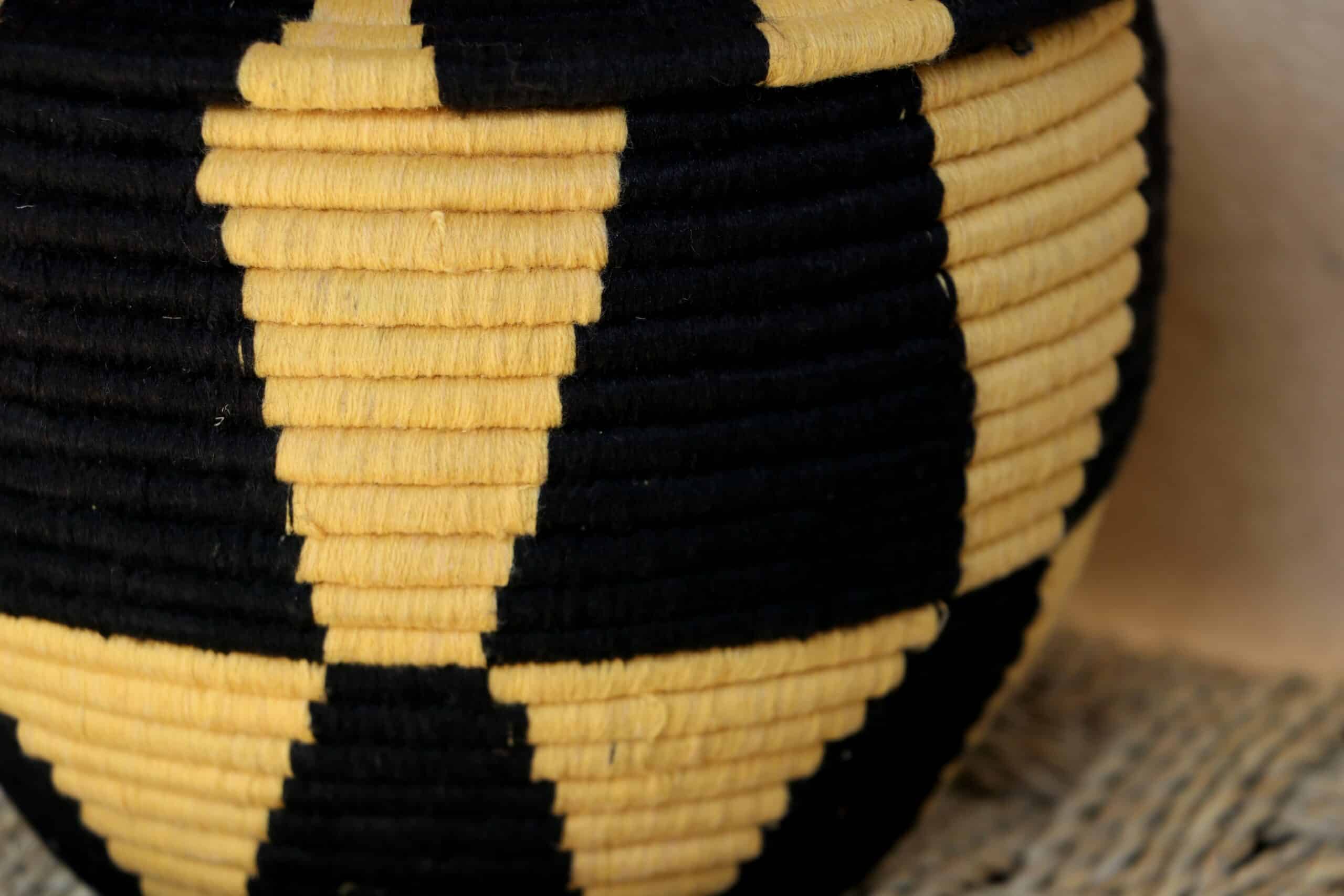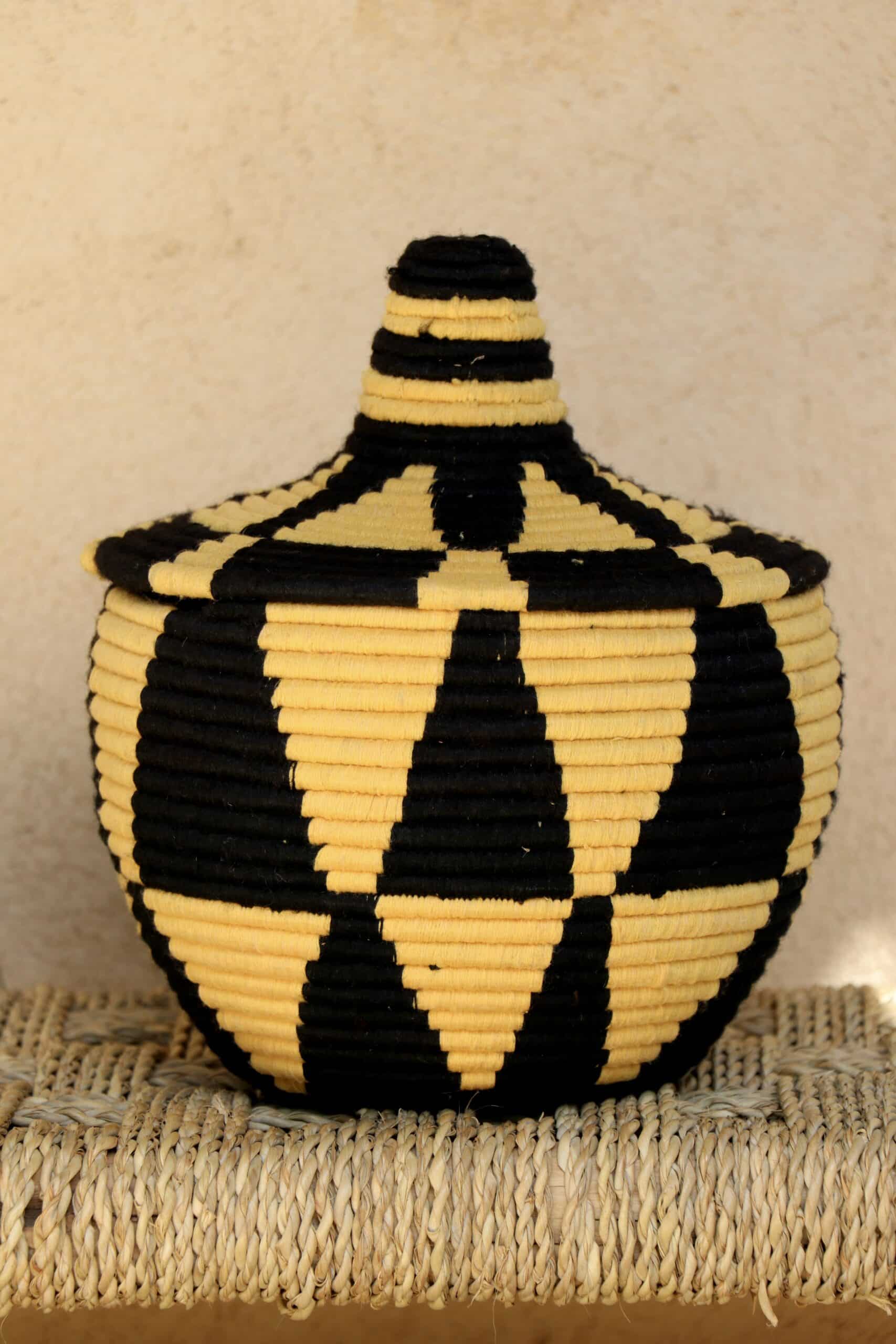 Parfaites pour pimper son intérieur de façon authentique tout en étant pratiques pour le rangement de petits objets, les corbeilles berbères sont fabriquées de fibres végétales pour former une base : cette fibre est appelée alfa, une plante vivace et robuste qui est originaire de l’ouest du bassin méditerranéen. Ces fibres végétales sont ensuite décorées en tissant à la main du fil de laine, de coton ou acrylique (souvent issue du recyclage) pour les couleurs fluo.