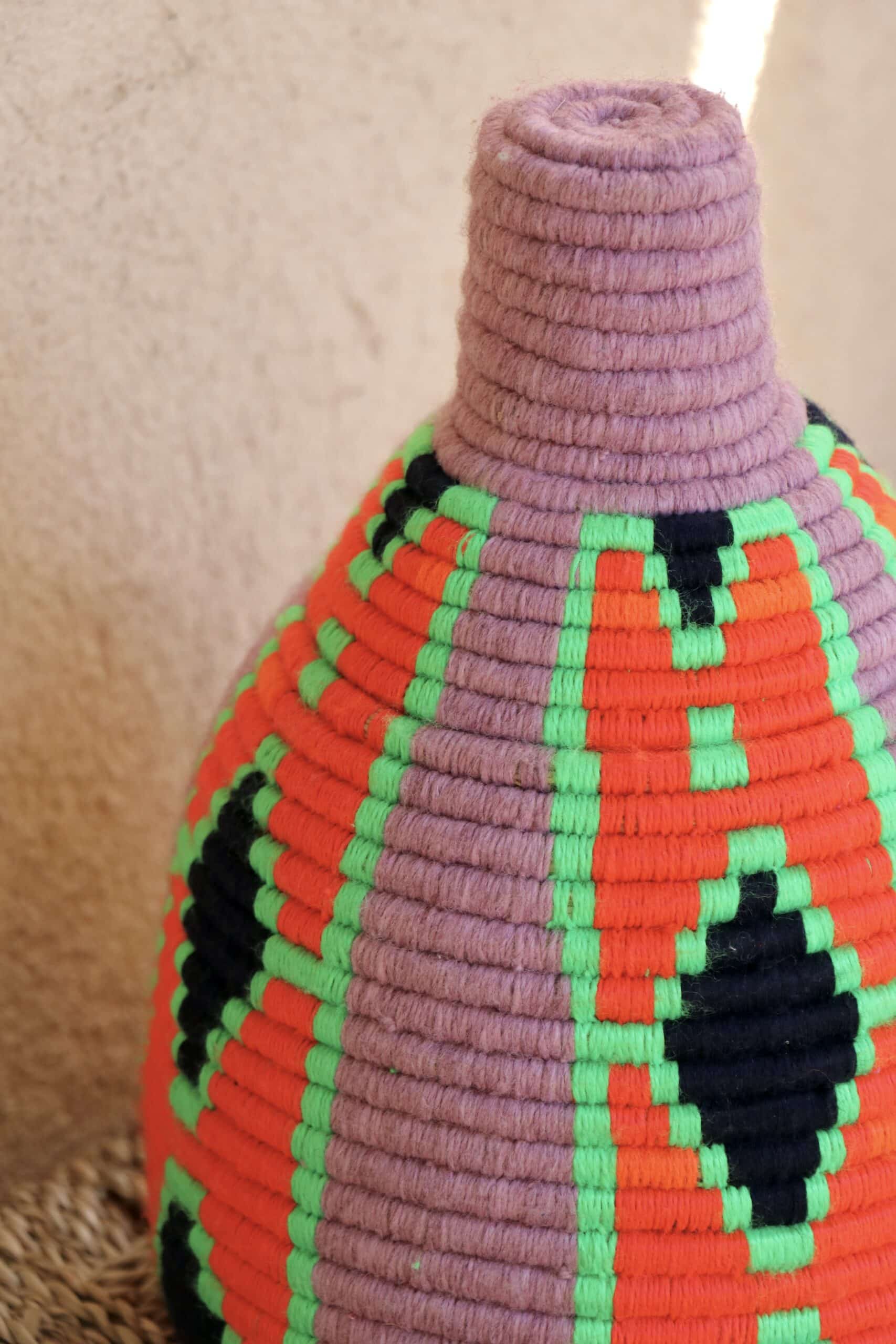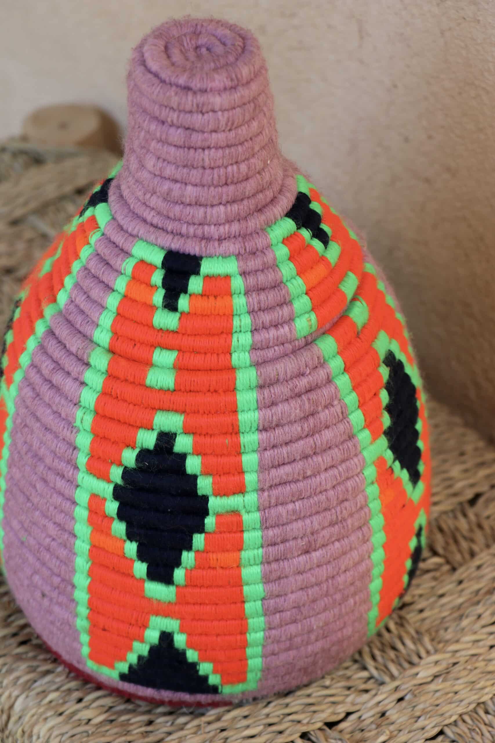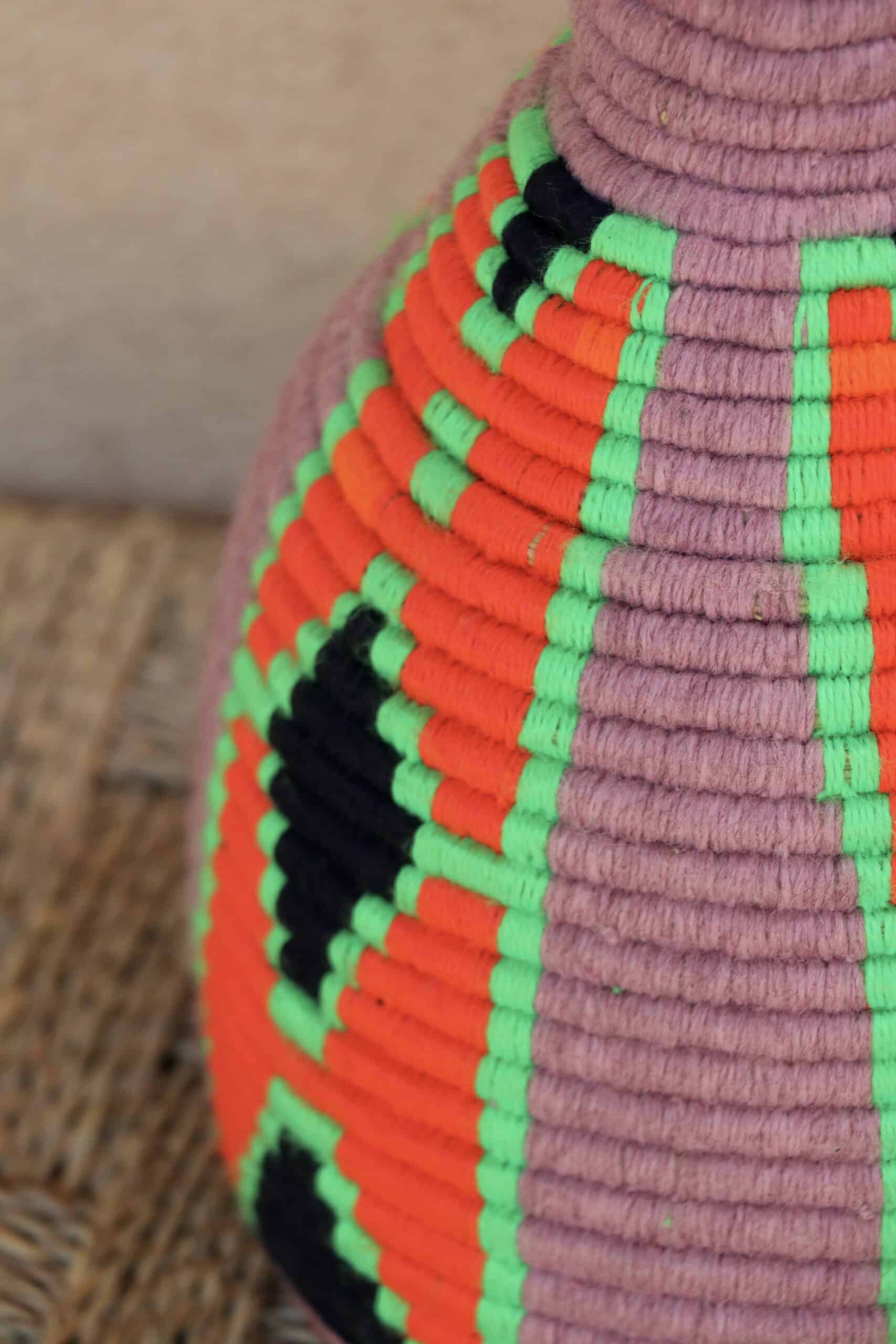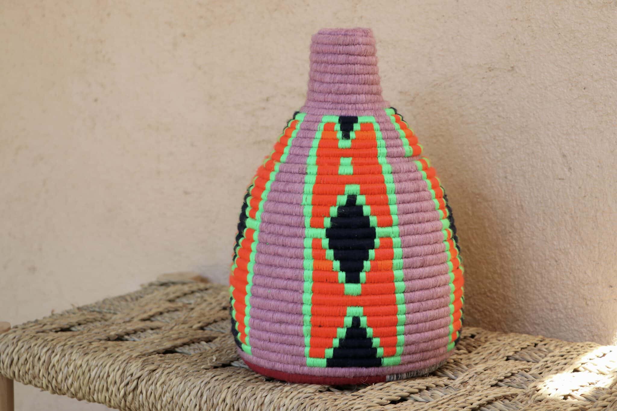 Parfaites pour pimper son intérieur de façon authentique tout en étant pratiques pour le rangement de petits objets, les corbeilles berbères sont fabriquées de fibres végétales pour former une base : cette fibre est appelée alfa, une plante vivace et robuste qui est originaire de l’ouest du bassin méditerranéen. Ces fibres végétales sont ensuite décorées en tissant à la main du fil de laine, de coton ou acrylique (souvent issue du recyclage) pour les couleurs fluo.