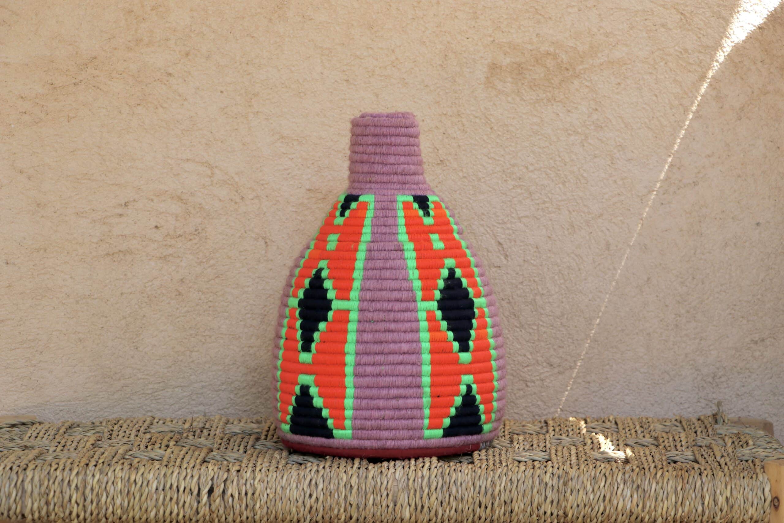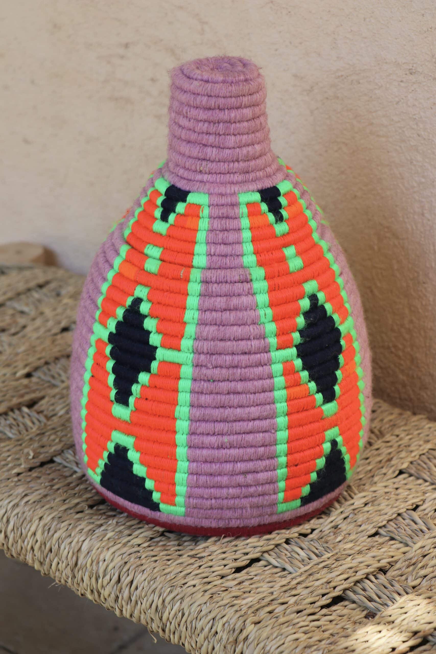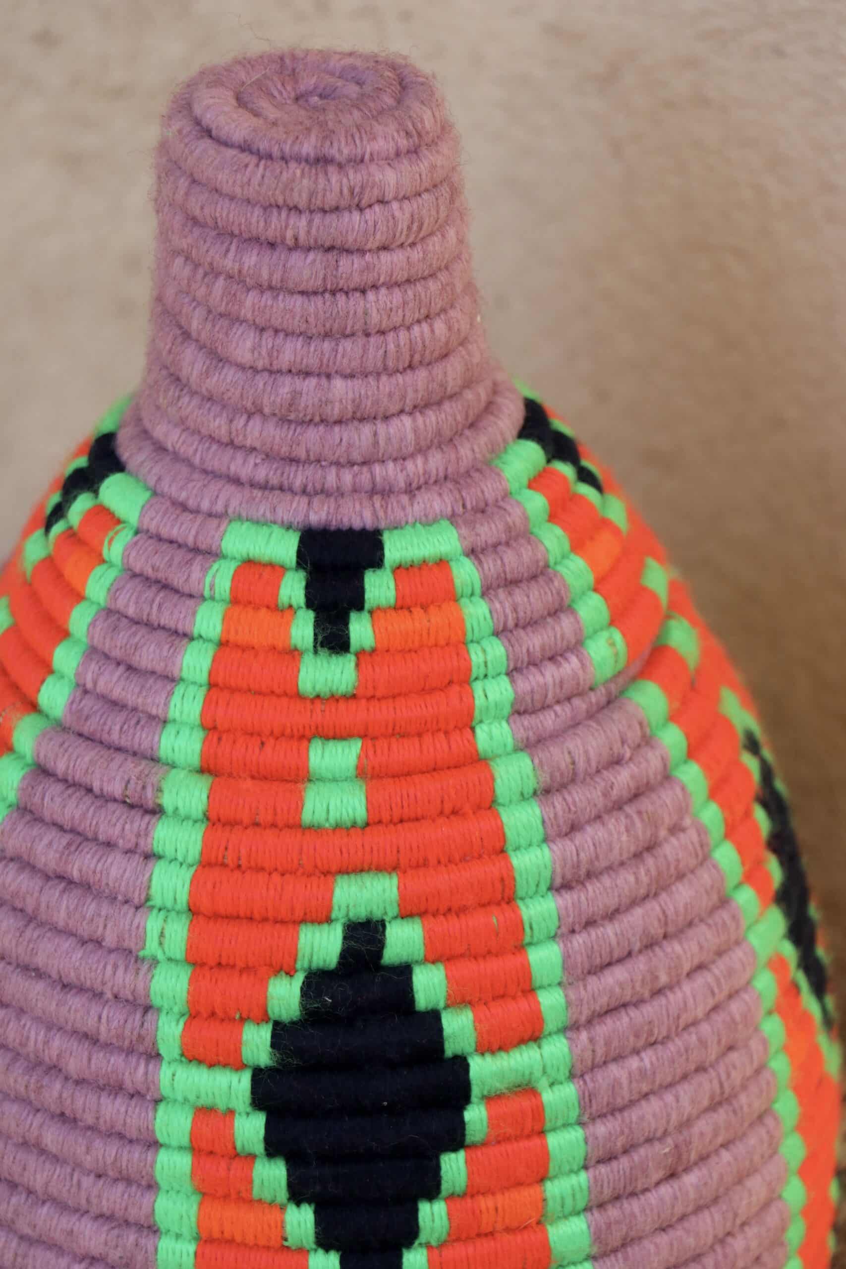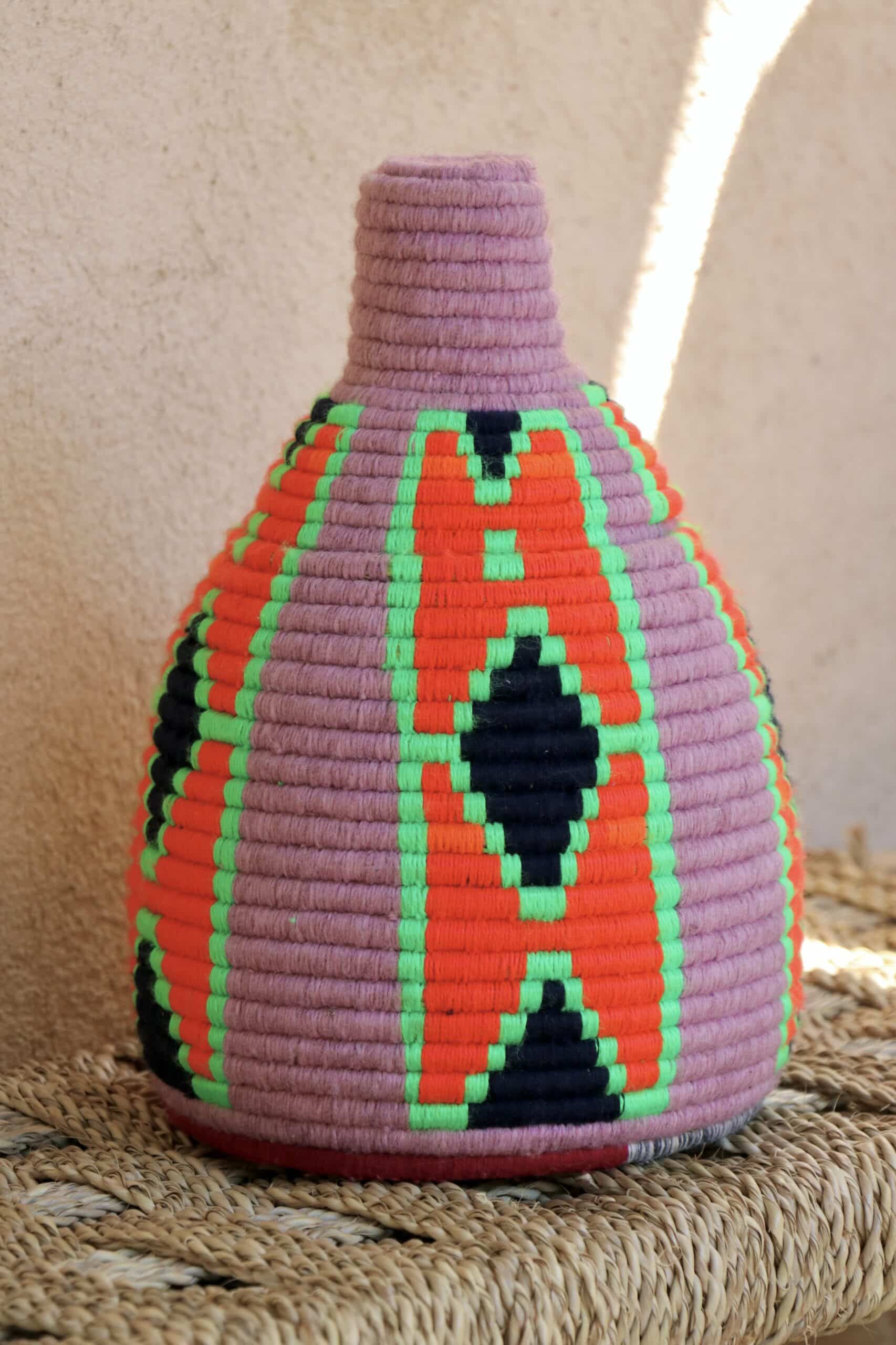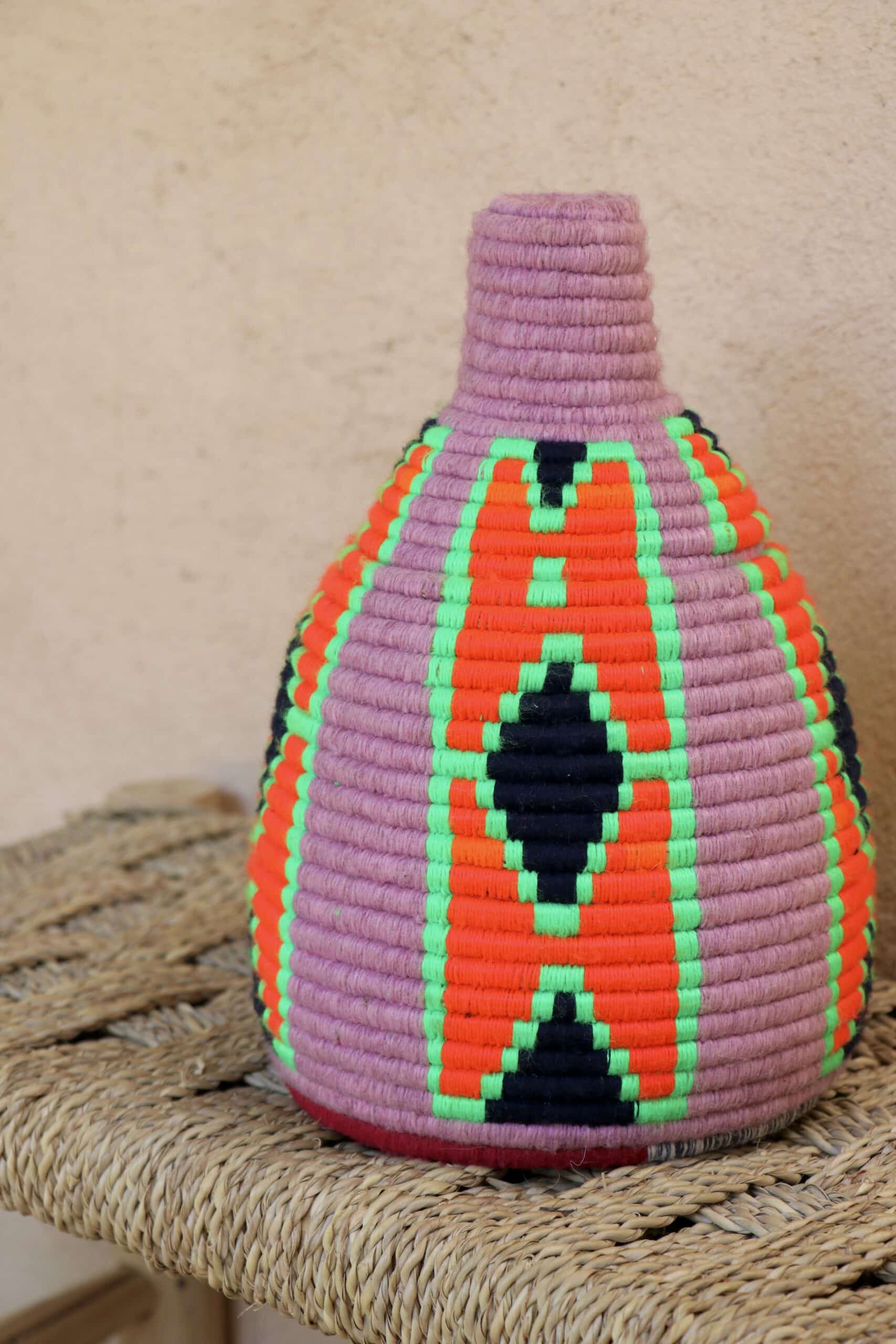 Parfaites pour pimper son intérieur de façon authentique tout en étant pratiques pour le rangement de petits objets, les corbeilles berbères sont fabriquées de fibres végétales pour former une base : cette fibre est appelée alfa, une plante vivace et robuste qui est originaire de l’ouest du bassin méditerranéen. Ces fibres végétales sont ensuite décorées en tissant à la main du fil de laine, de coton ou acrylique (souvent issue du recyclage) pour les couleurs fluo.