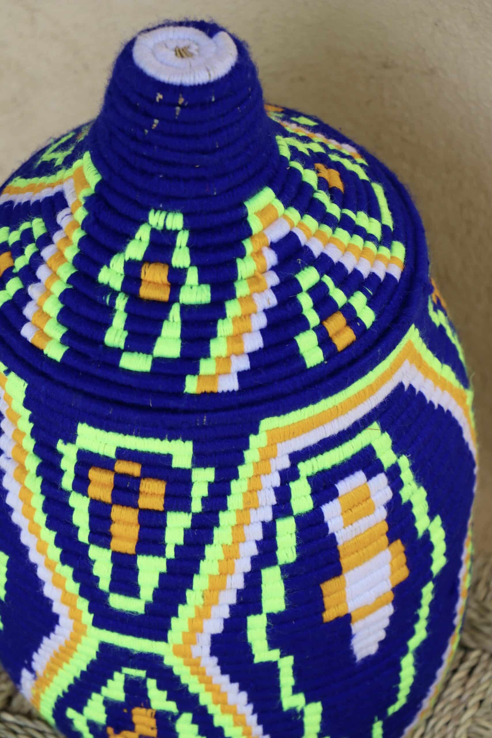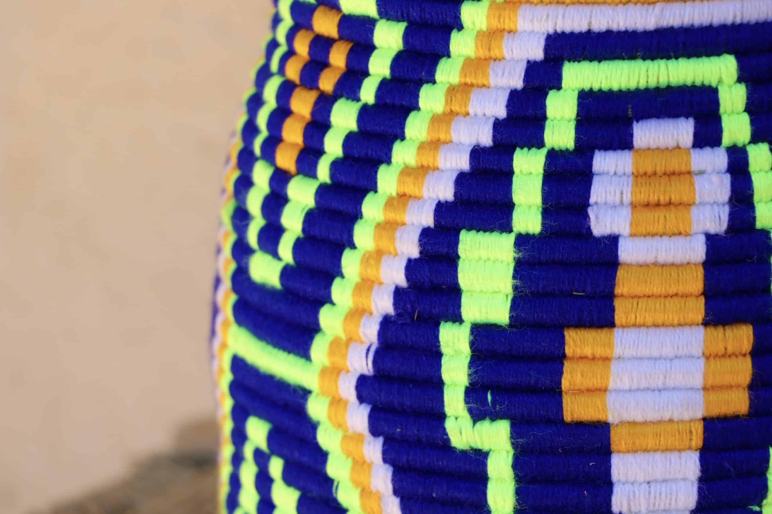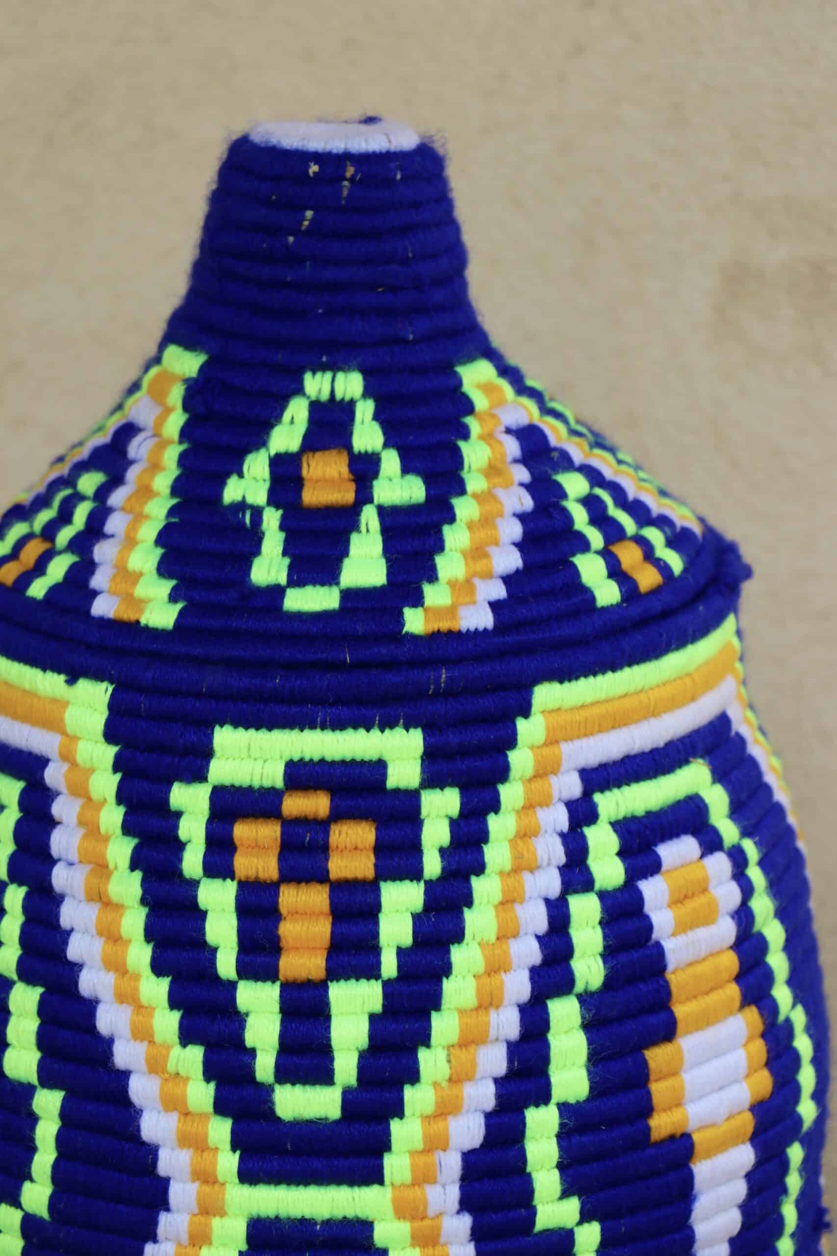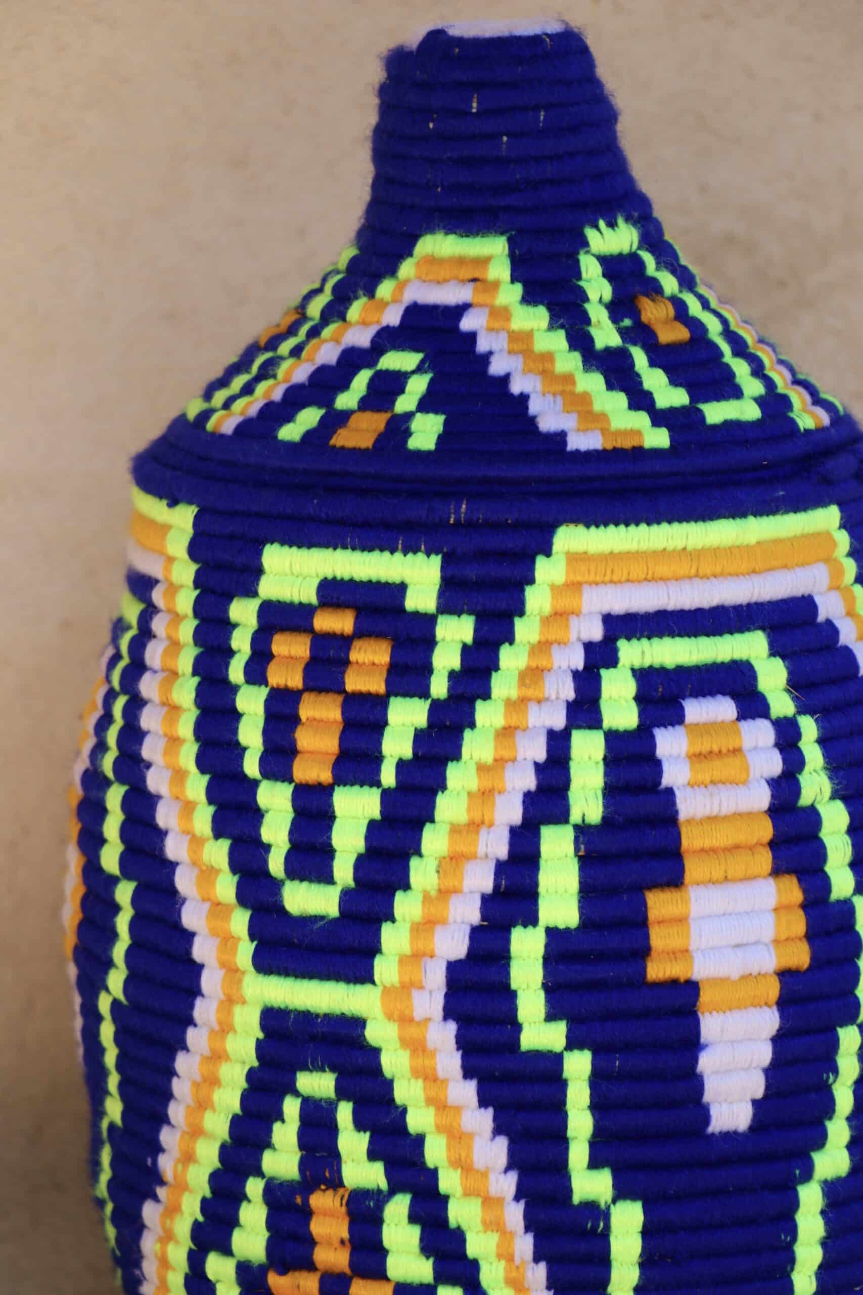 Parfaites pour pimper son intérieur de façon authentique tout en étant pratiques pour le rangement de petits objets, les corbeilles berbères sont fabriquées de fibres végétales pour former une base : cette fibre est appelée alfa, une plante vivace et robuste qui est originaire de l’ouest du bassin méditerranéen. Ces fibres végétales sont ensuite décorées en tissant à la main du fil de laine, de coton ou acrylique (souvent issue du recyclage) pour les couleurs fluo.