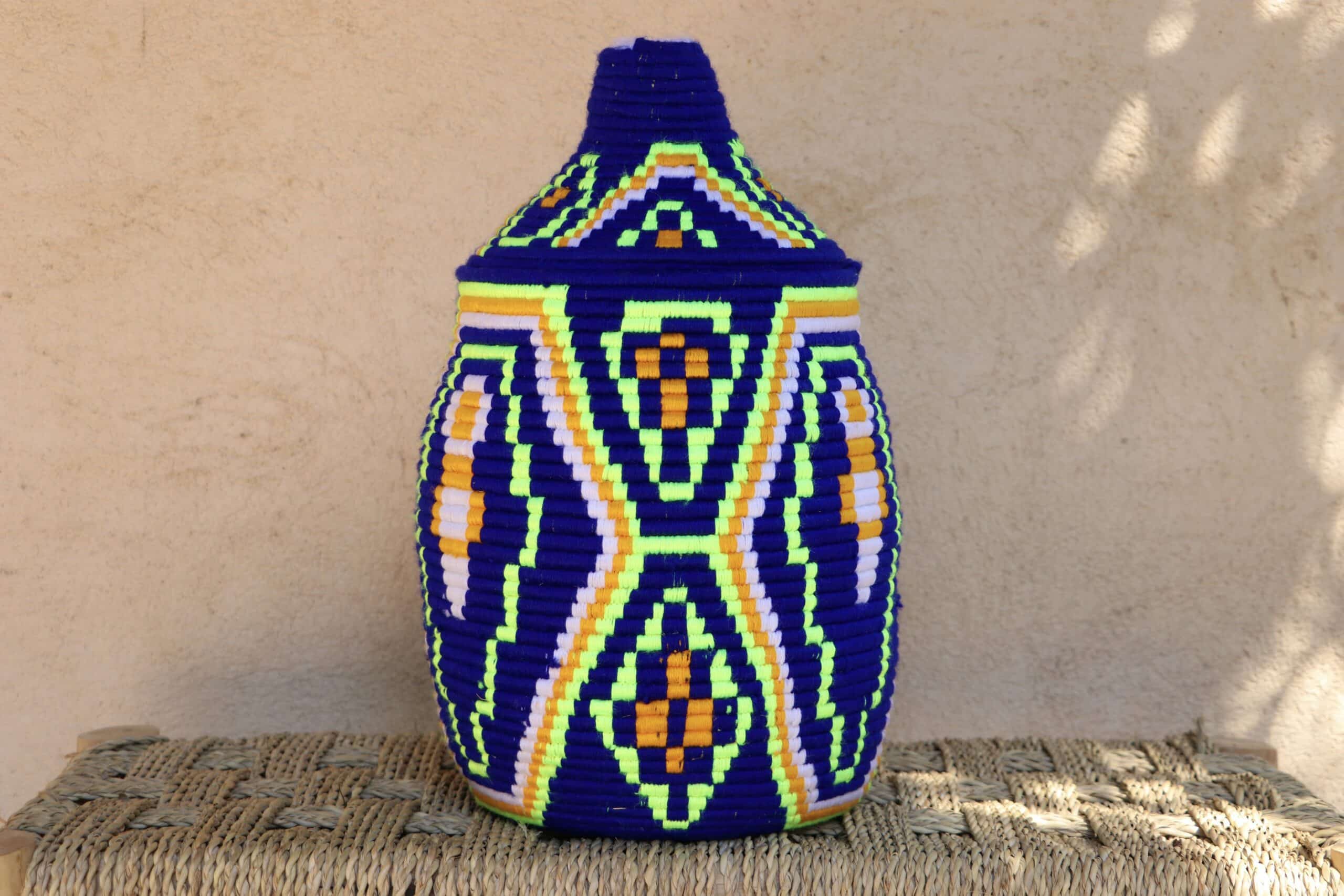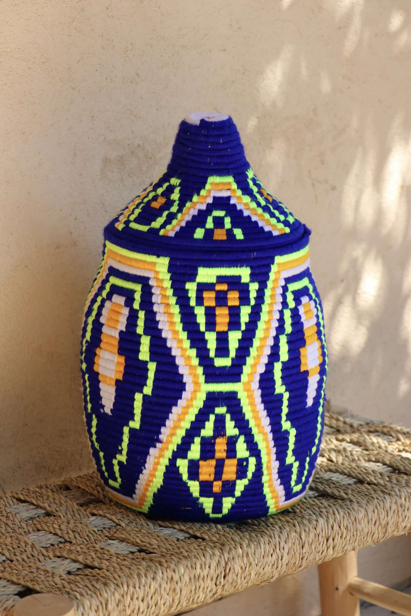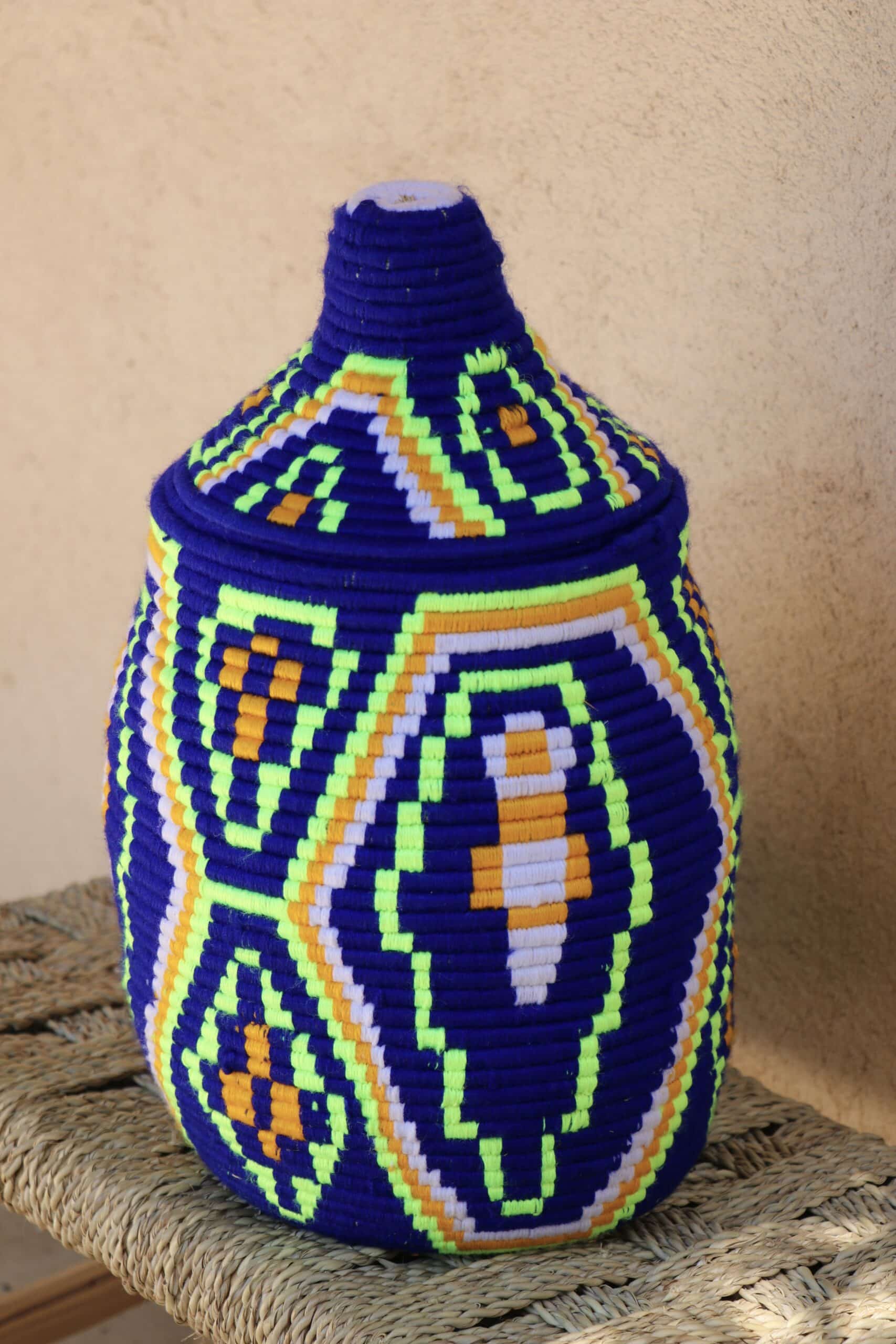 Parfaites pour pimper son intérieur de façon authentique tout en étant pratiques pour le rangement de petits objets, les corbeilles berbères sont fabriquées de fibres végétales pour former une base : cette fibre est appelée alfa, une plante vivace et robuste qui est originaire de l’ouest du bassin méditerranéen. Ces fibres végétales sont ensuite décorées en tissant à la main du fil de laine, de coton ou acrylique (souvent issue du recyclage) pour les couleurs fluo.