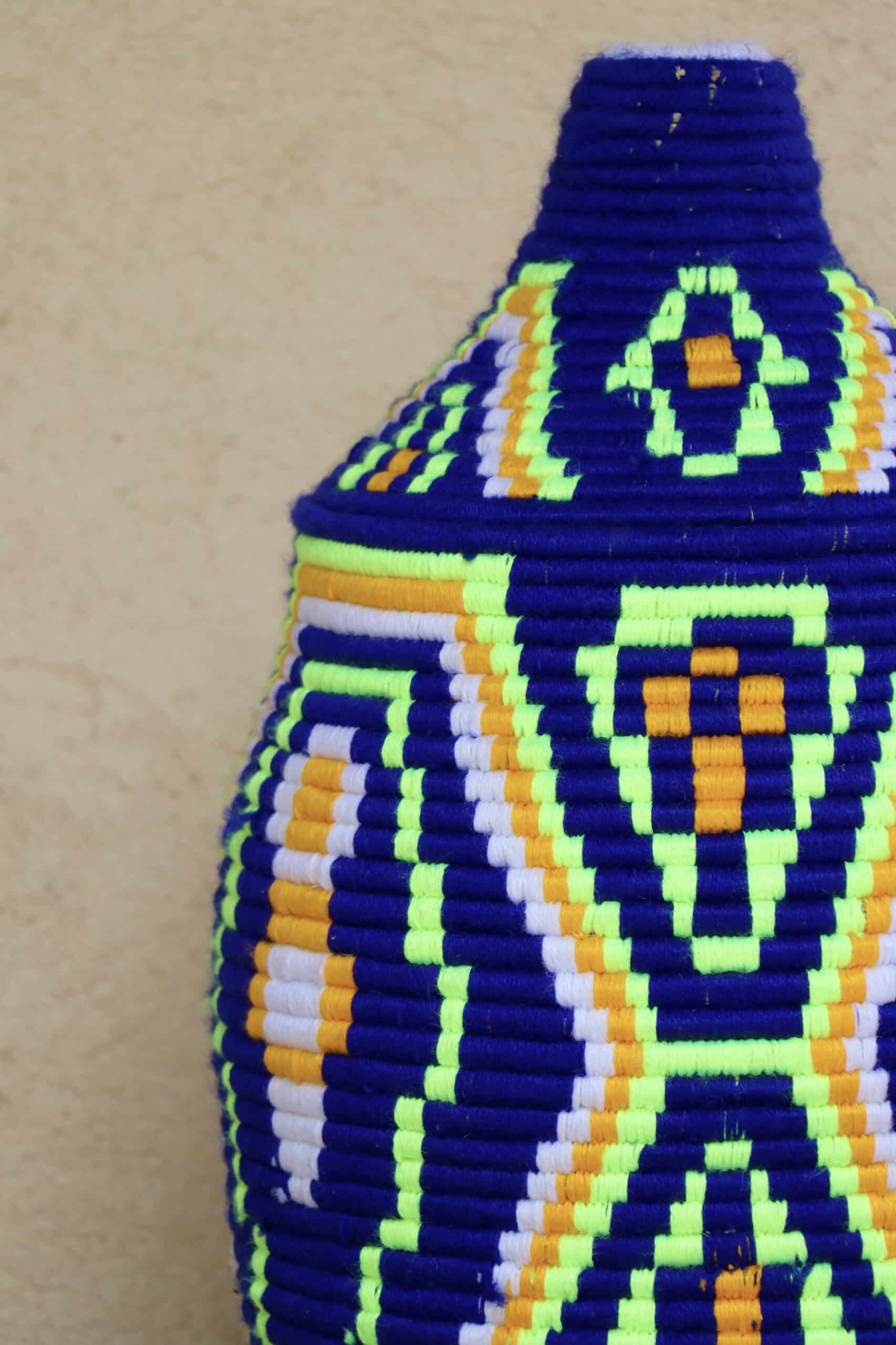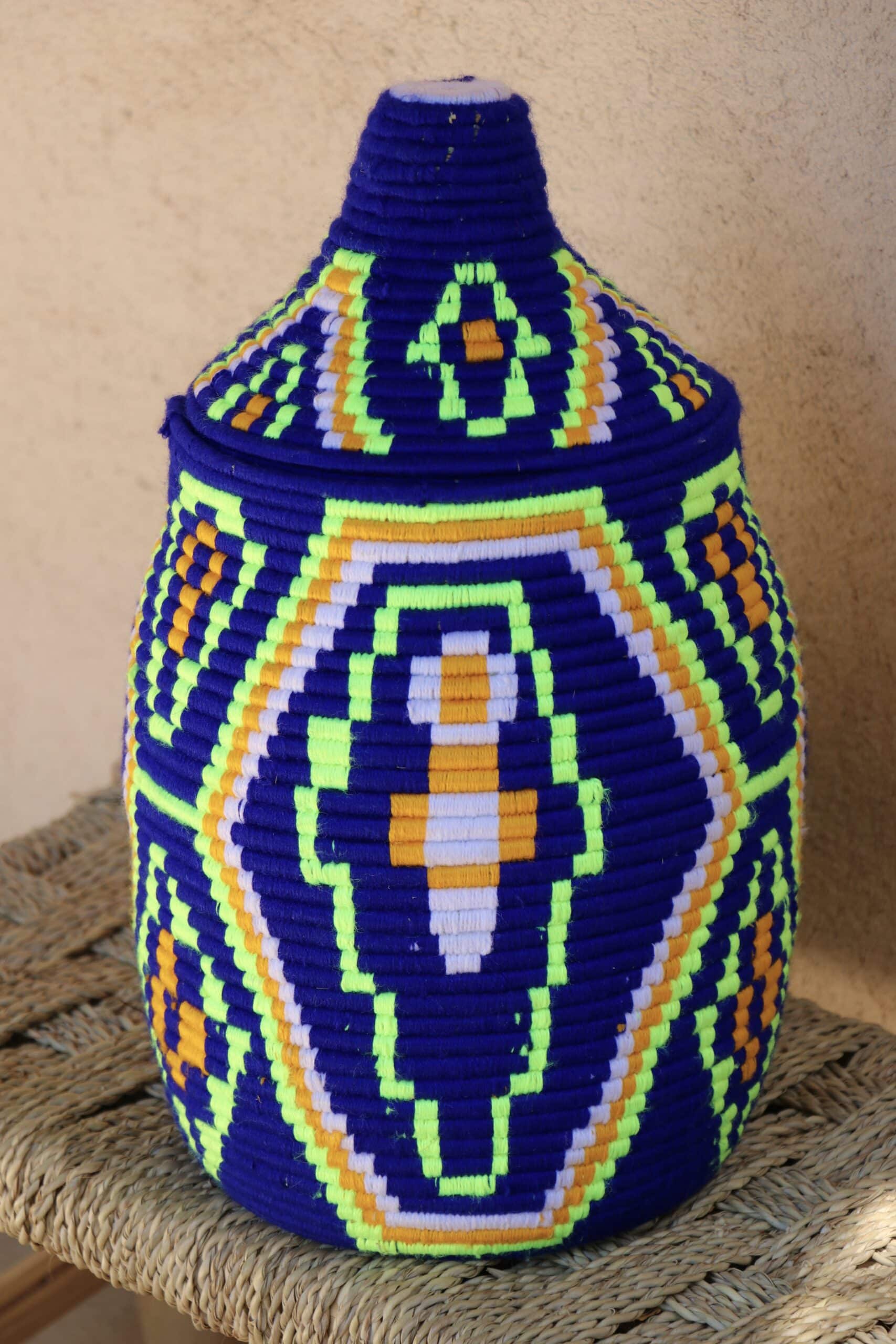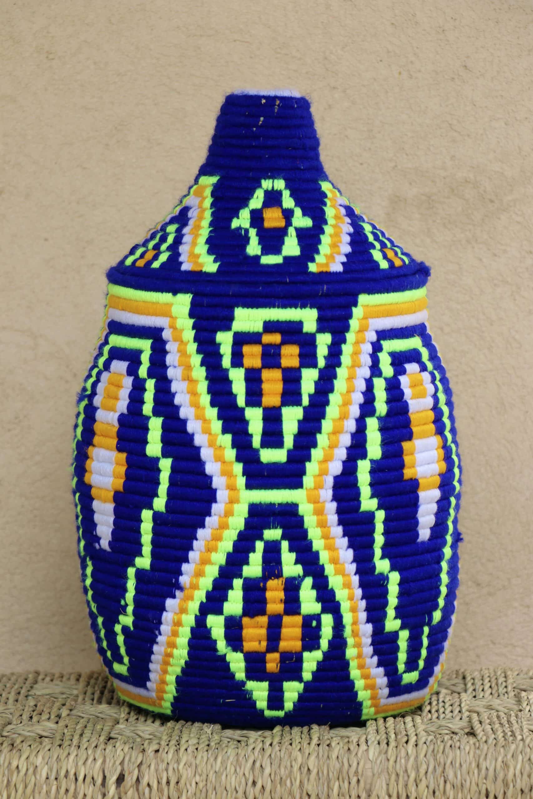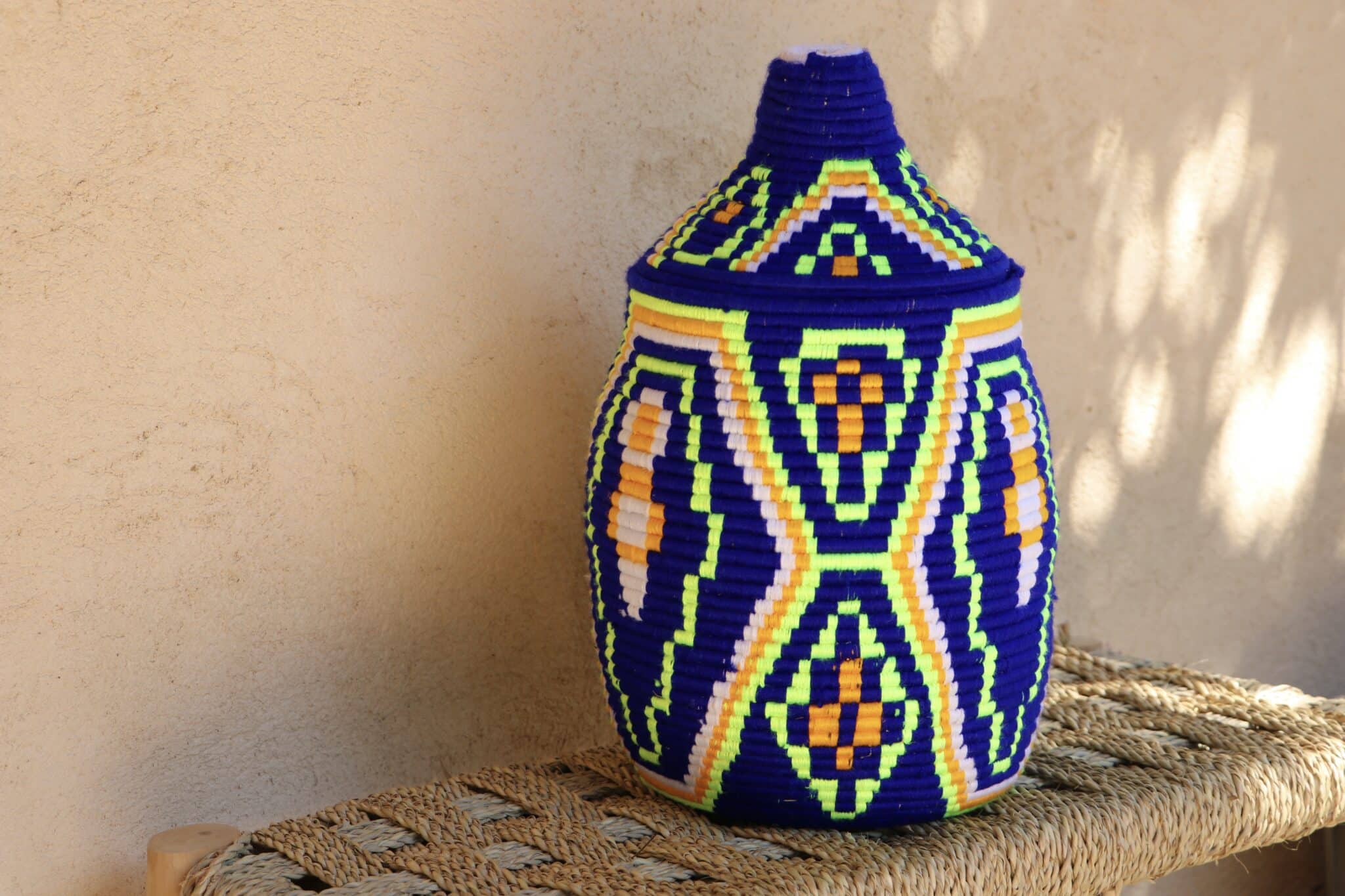Parfaites pour pimper son intérieur de façon authentique tout en étant pratiques pour le rangement de petits objets, les corbeilles berbères sont fabriquées de fibres végétales pour former une base : cette fibre est appelée alfa, une plante vivace et robuste qui est originaire de l’ouest du bassin méditerranéen. Ces fibres végétales sont ensuite décorées en tissant à la main du fil de laine, de coton ou acrylique (souvent issue du recyclage) pour les couleurs fluo.