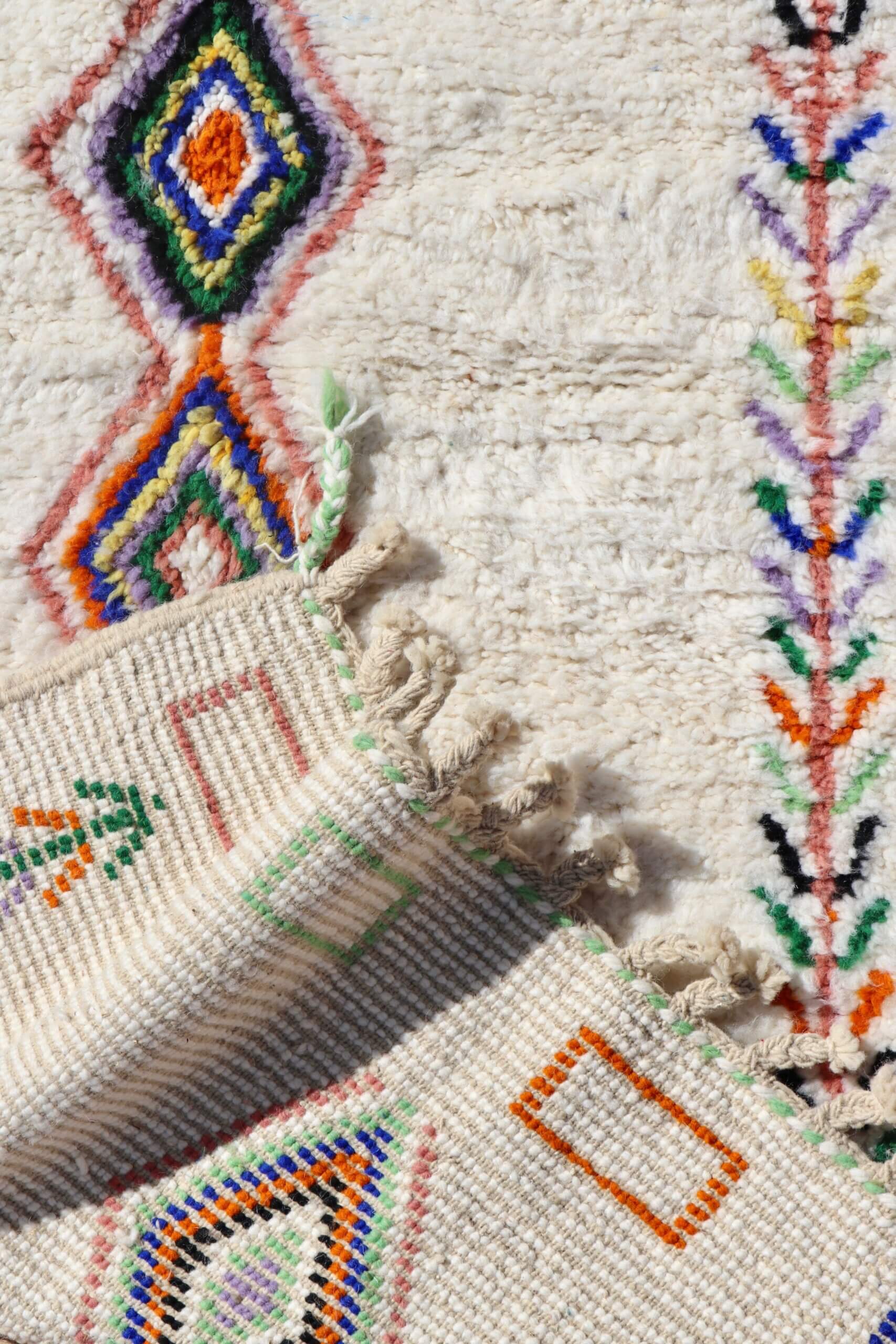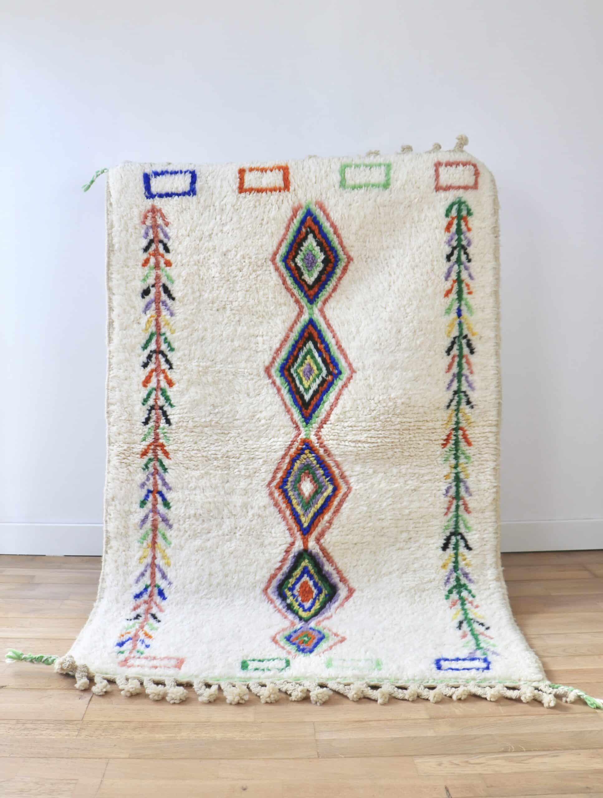 Tapis Azilal N°17, 170x105cm, blanc et polychrome, 100% laine de mouton non teintée et teintée naturellement, poids 3,8 kg.