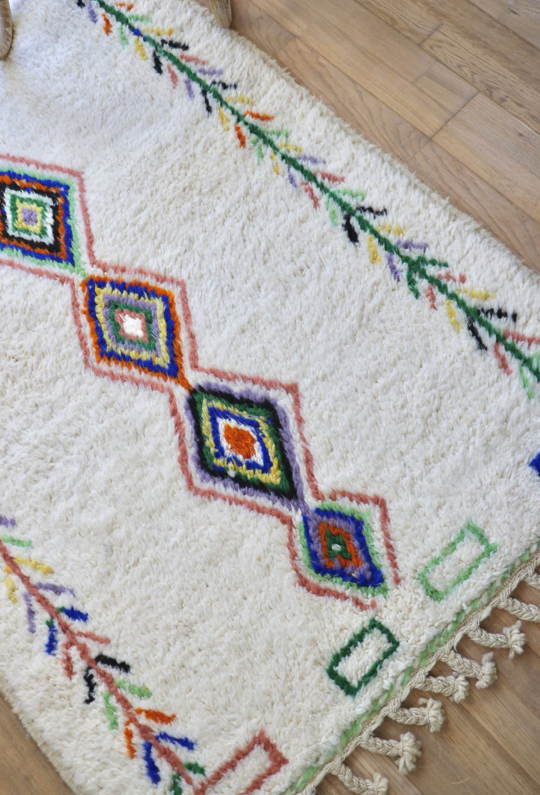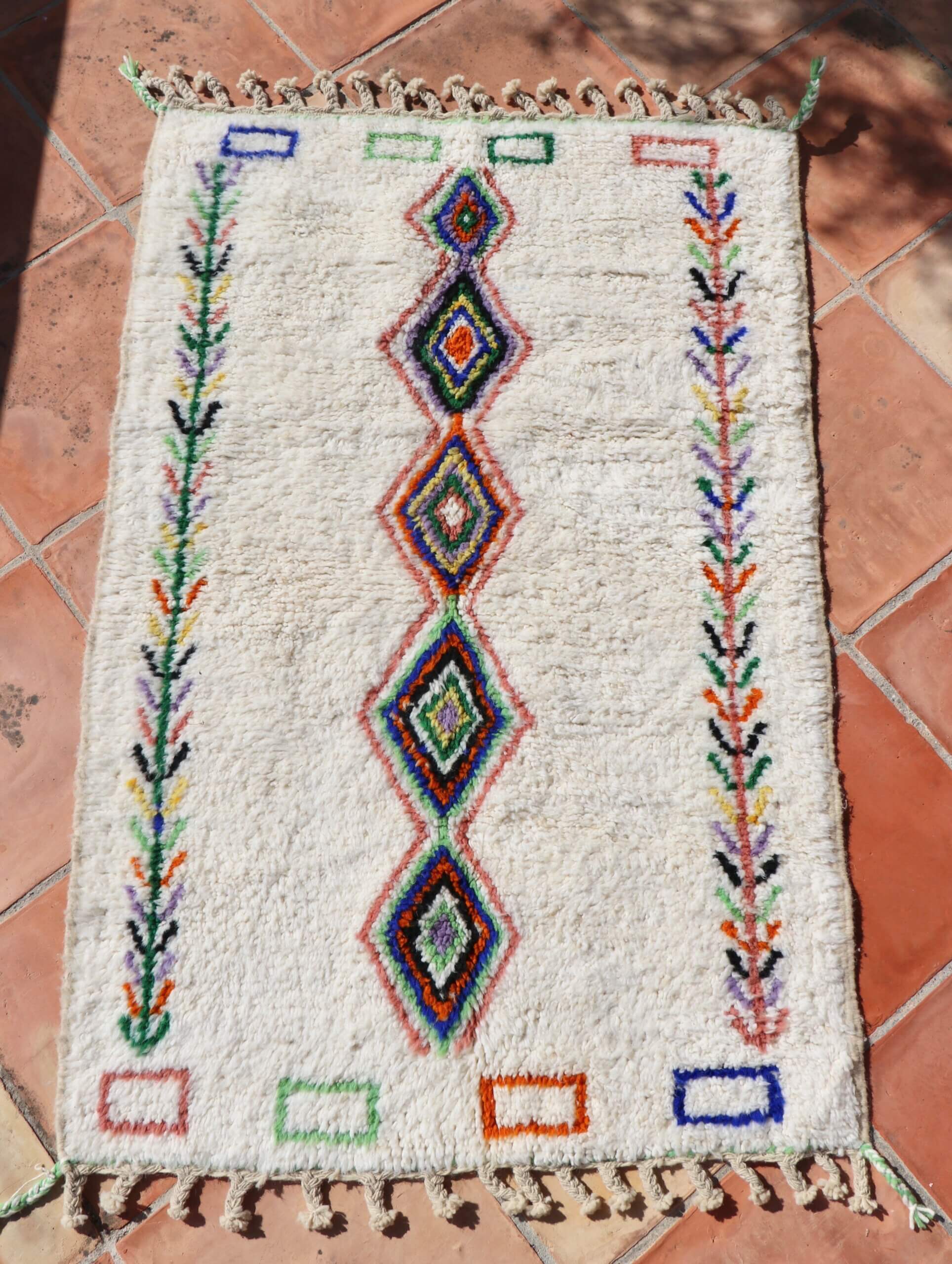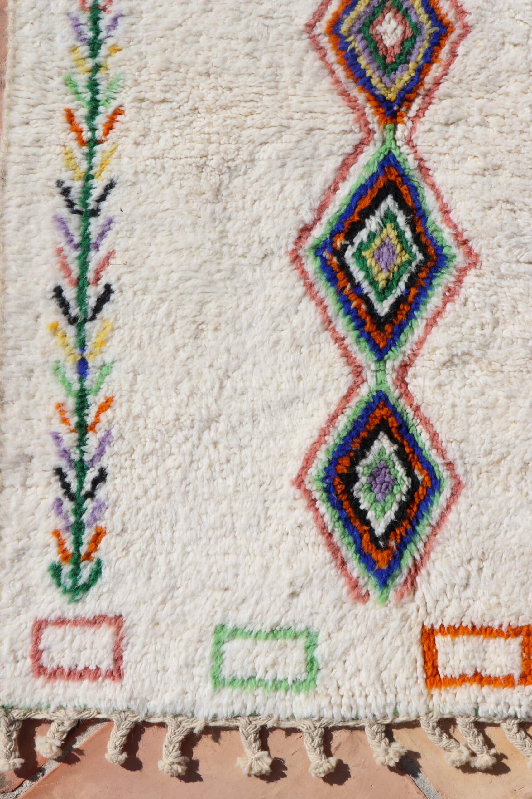 Ce type de tapis a la particularité d’avoir un décor composé de motifs à couleurs vives ou fluos, sur fond de nuances de blanc ou crème. Ils sont fabriqués en laine de mouton, avec pour certains tapis l’utilisation de laine mélangée à du coton ou des fibres synthétiques pour plus de créativité ainsi que pour bénéficier de couleurs qui ne peuvent pas être créées à partir de teintures naturelles, mais aussi lorsque la laine se fait rare ou que certaines familles ne peuvent pas s’en offrir. Les tapis Azilal peuvent être confectionnés avec une chaîne de fond en coton que l’on retrouve dans les franges. Les noeuds de tissage sont moins serrés et tassés que leurs cousins Beni Ouarain ou M’rirt mais le moelleux et la douceur de la laine reste un pur bonheur.