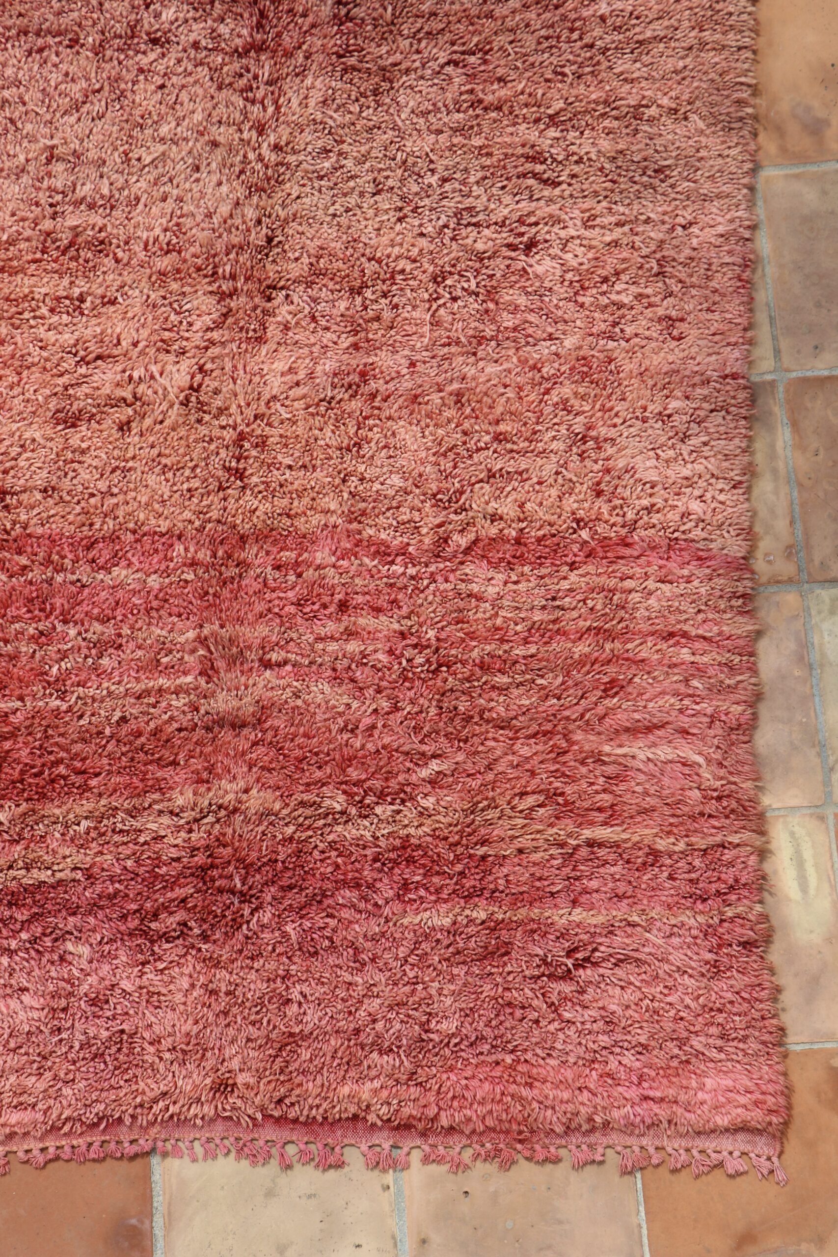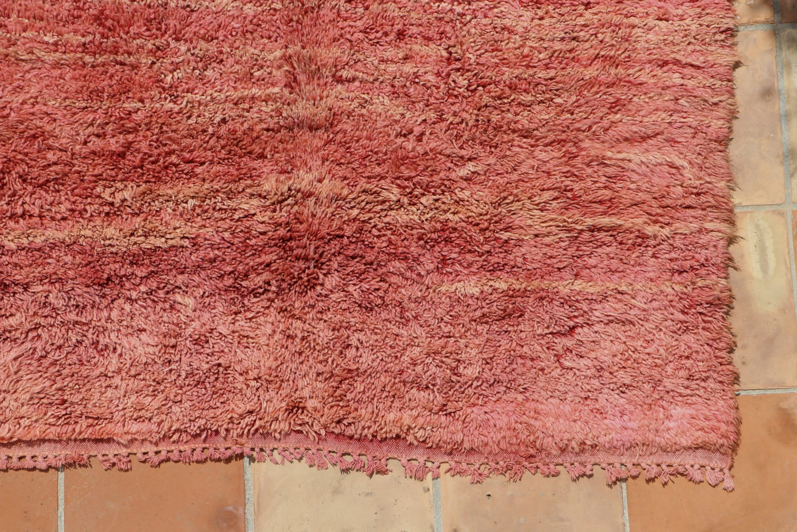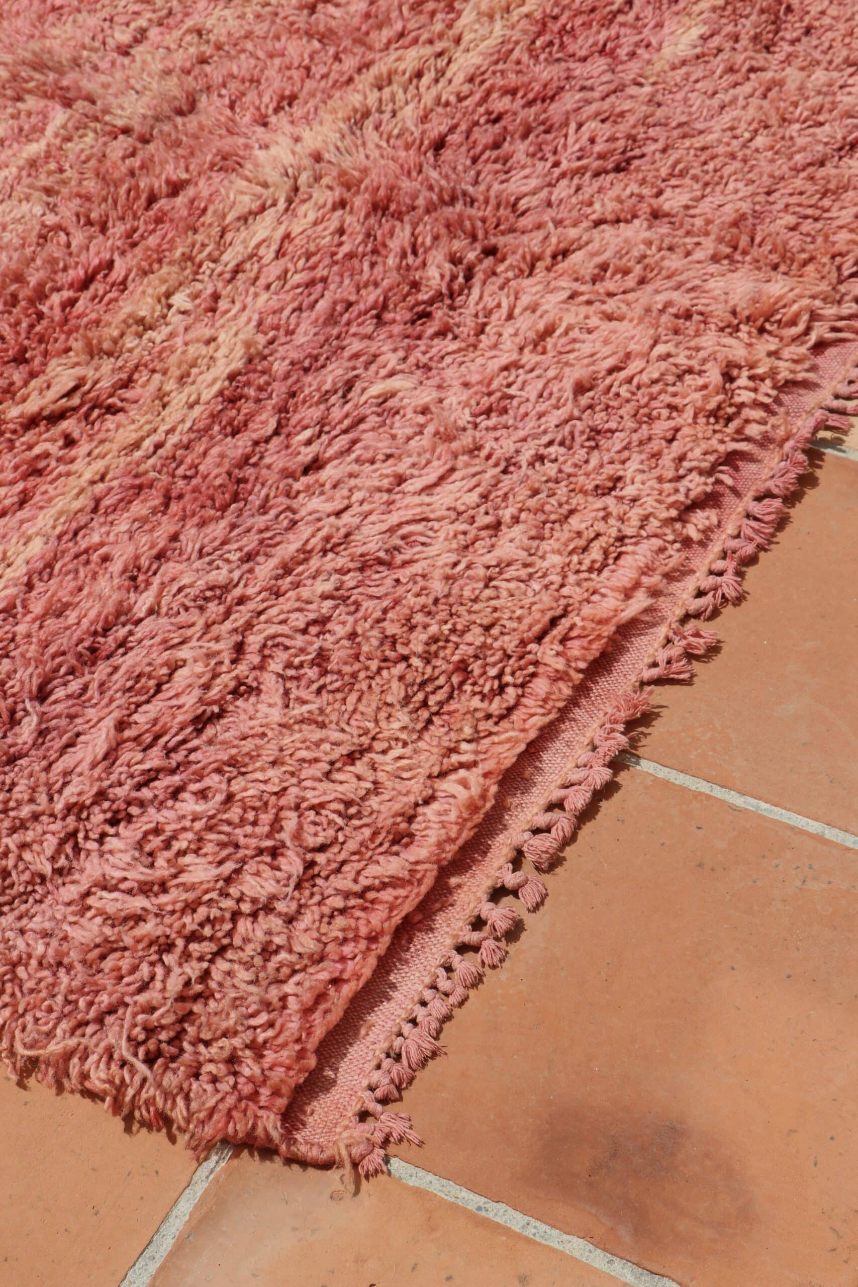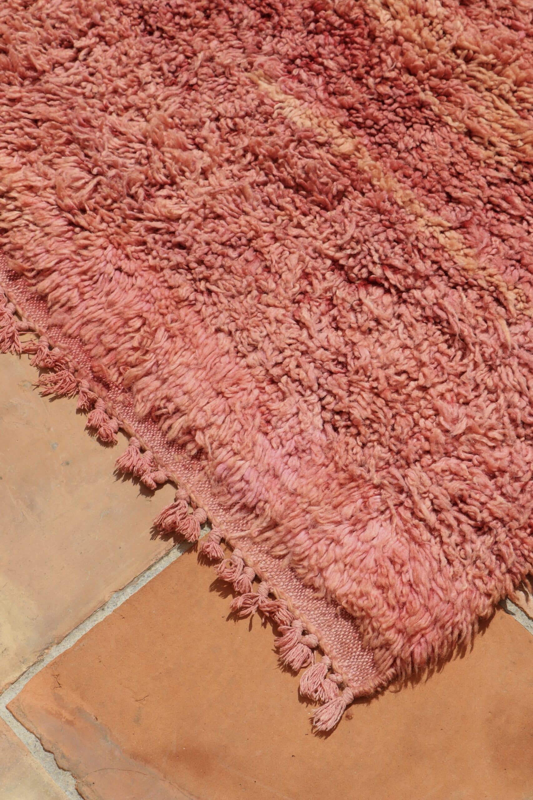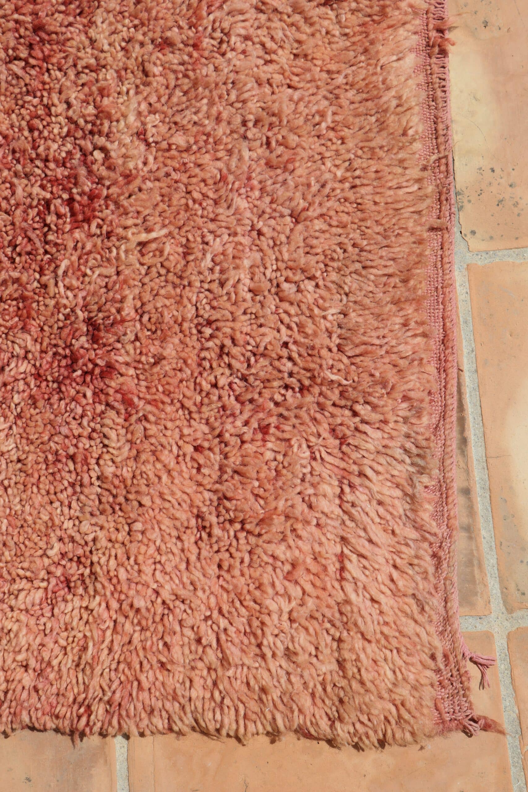 Tapis Beni M’rirt ancien n°33 de 313x200cm aux différentes nuances de rose, en laine de mouton teintée naturellement et coton (chaîne de fond que l’on retrouve dans les franges), poids 17,8kg.