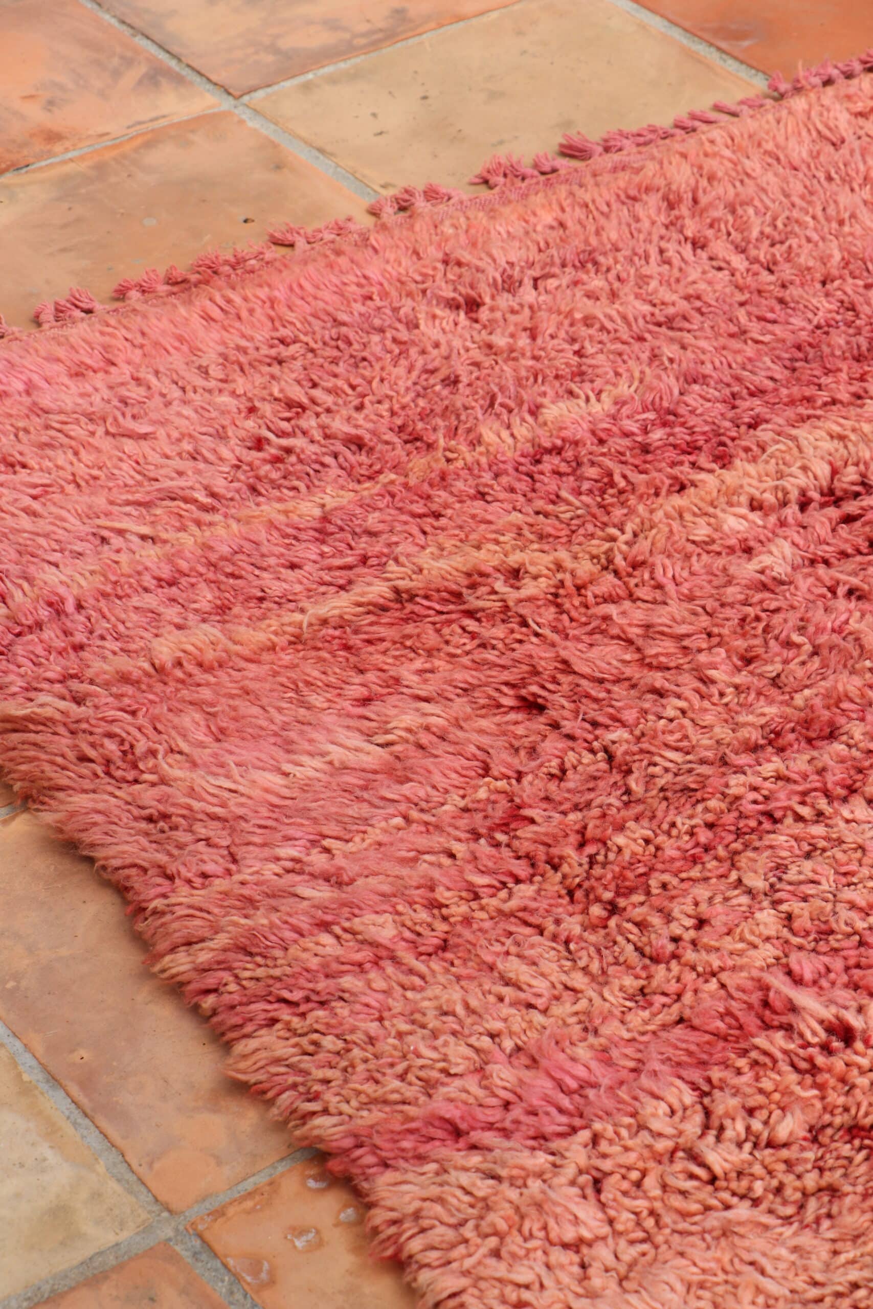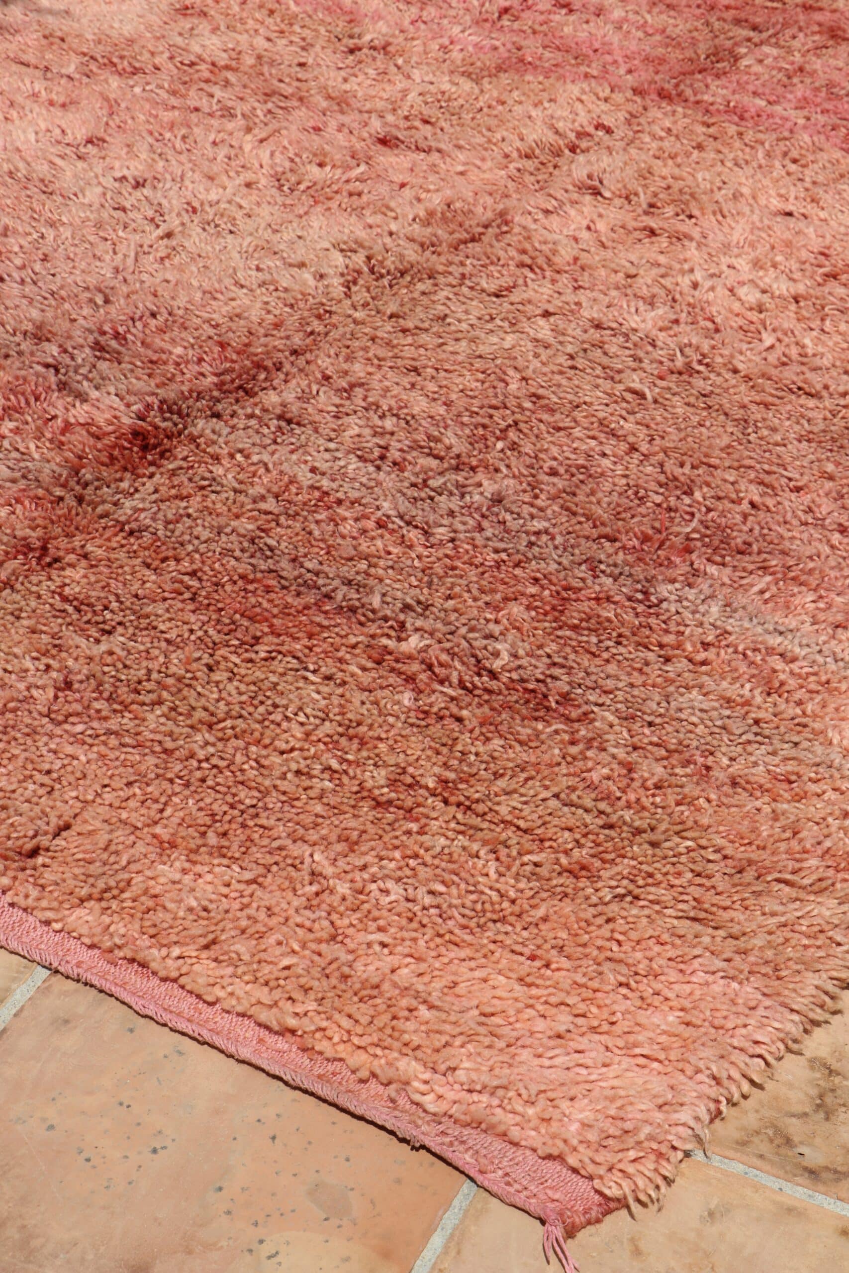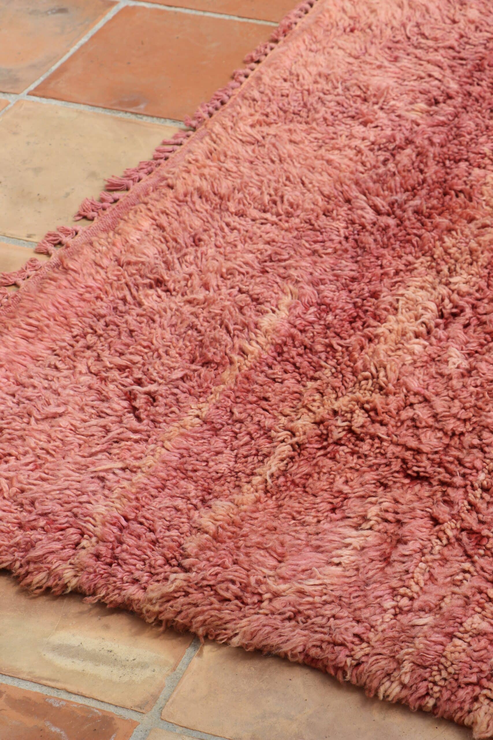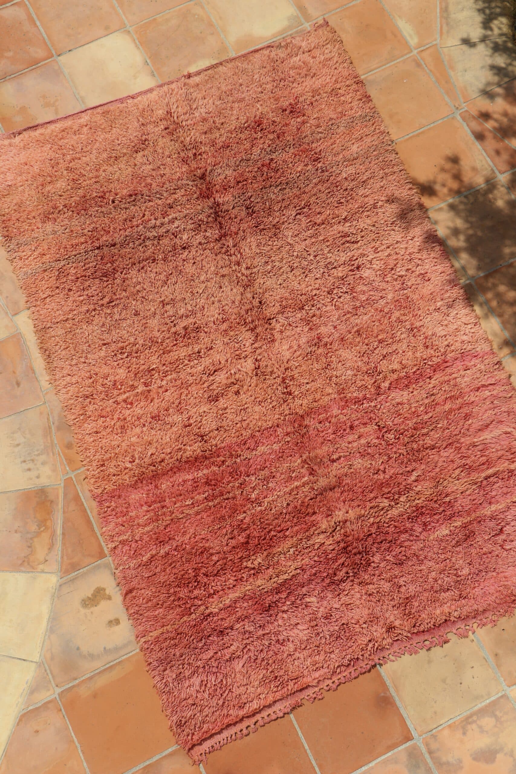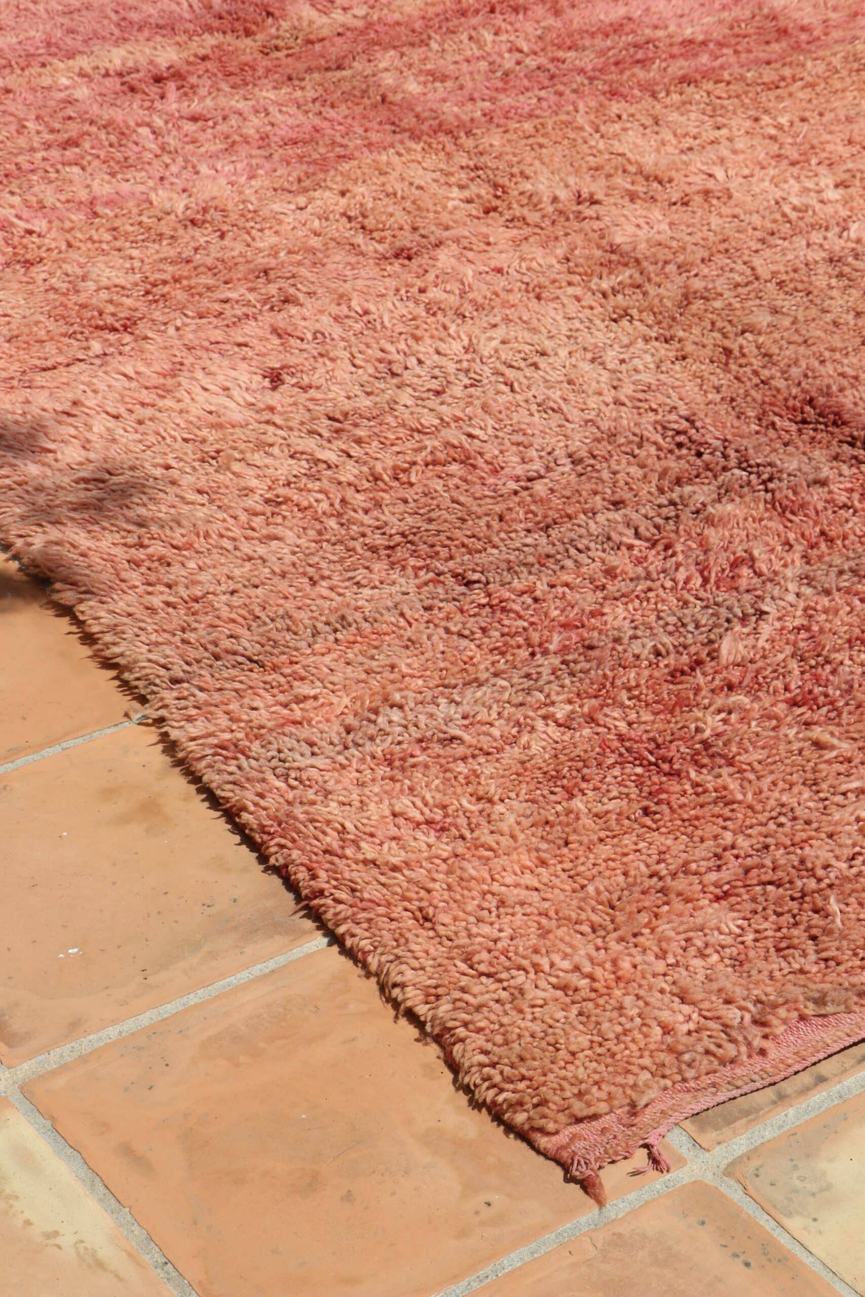Tapis Beni M’rirt ancien n°33 de 313x200cm aux différentes nuances de rose, en laine de mouton teintée naturellement et coton (chaîne de fond que l’on retrouve dans les franges), poids 17,8kg.