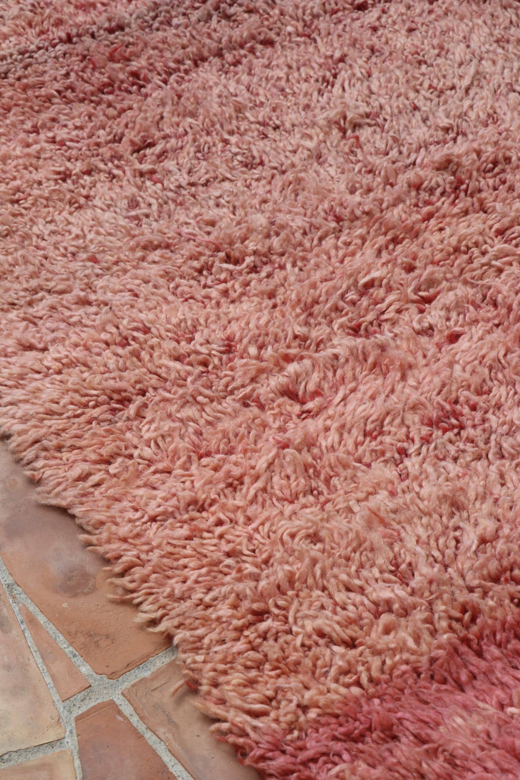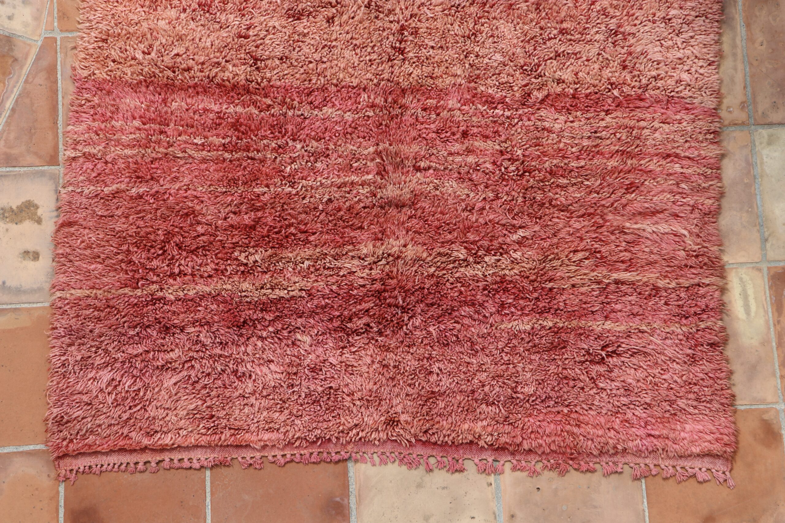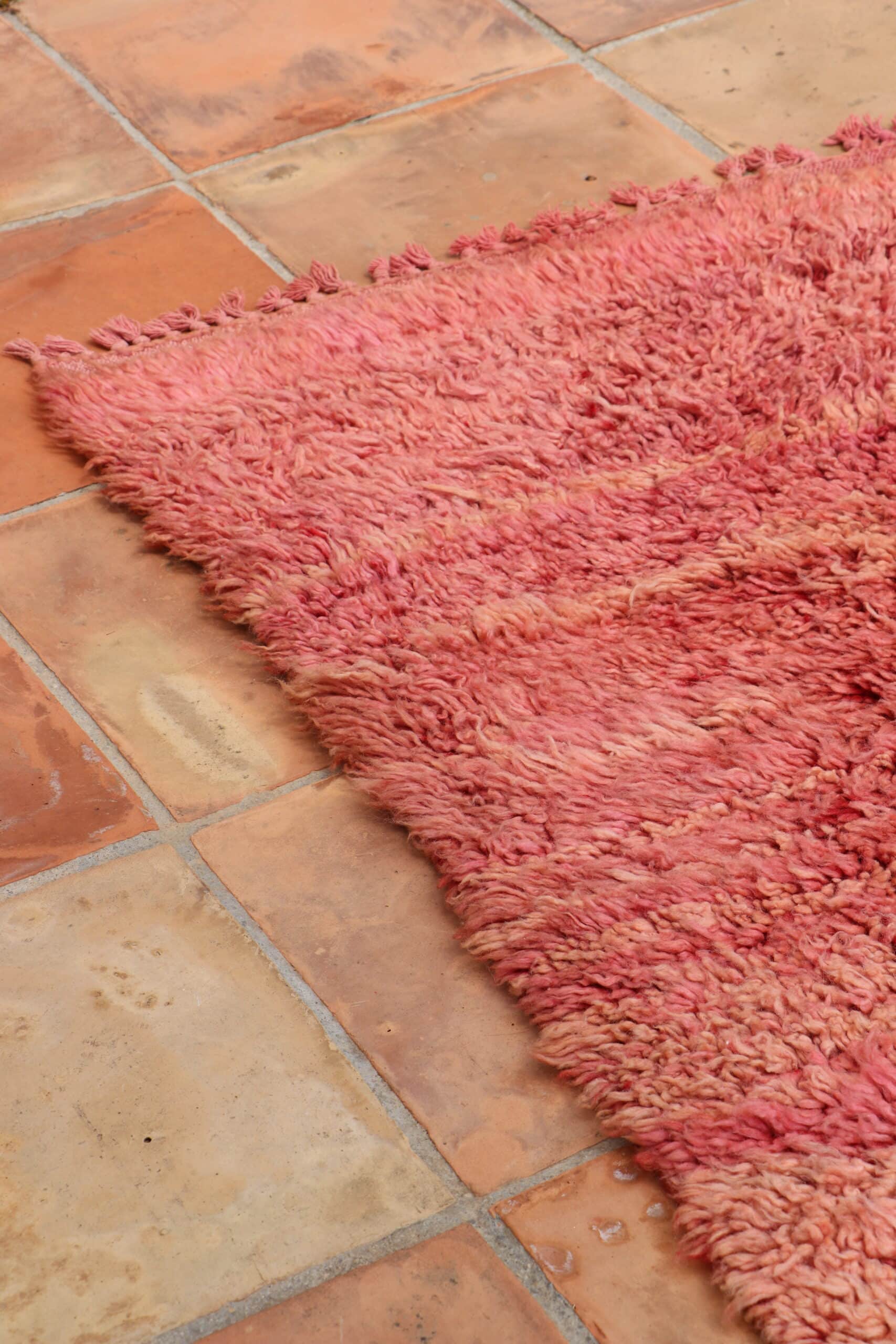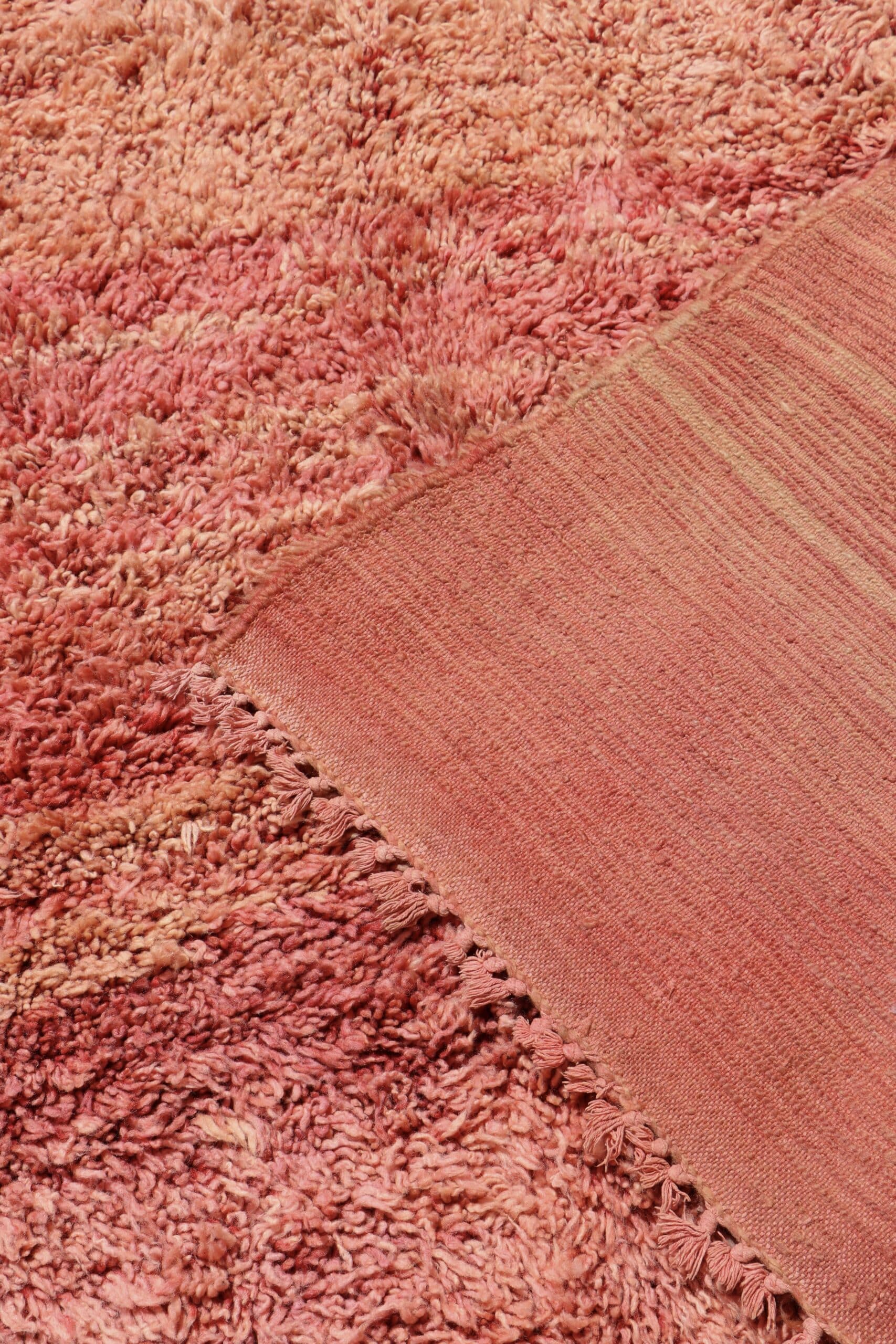 Tapis Beni M’rirt ancien n°33 de 313x200cm aux différentes nuances de rose, en laine de mouton teintée naturellement et coton (chaîne de fond que l’on retrouve dans les franges), poids 17,8kg.