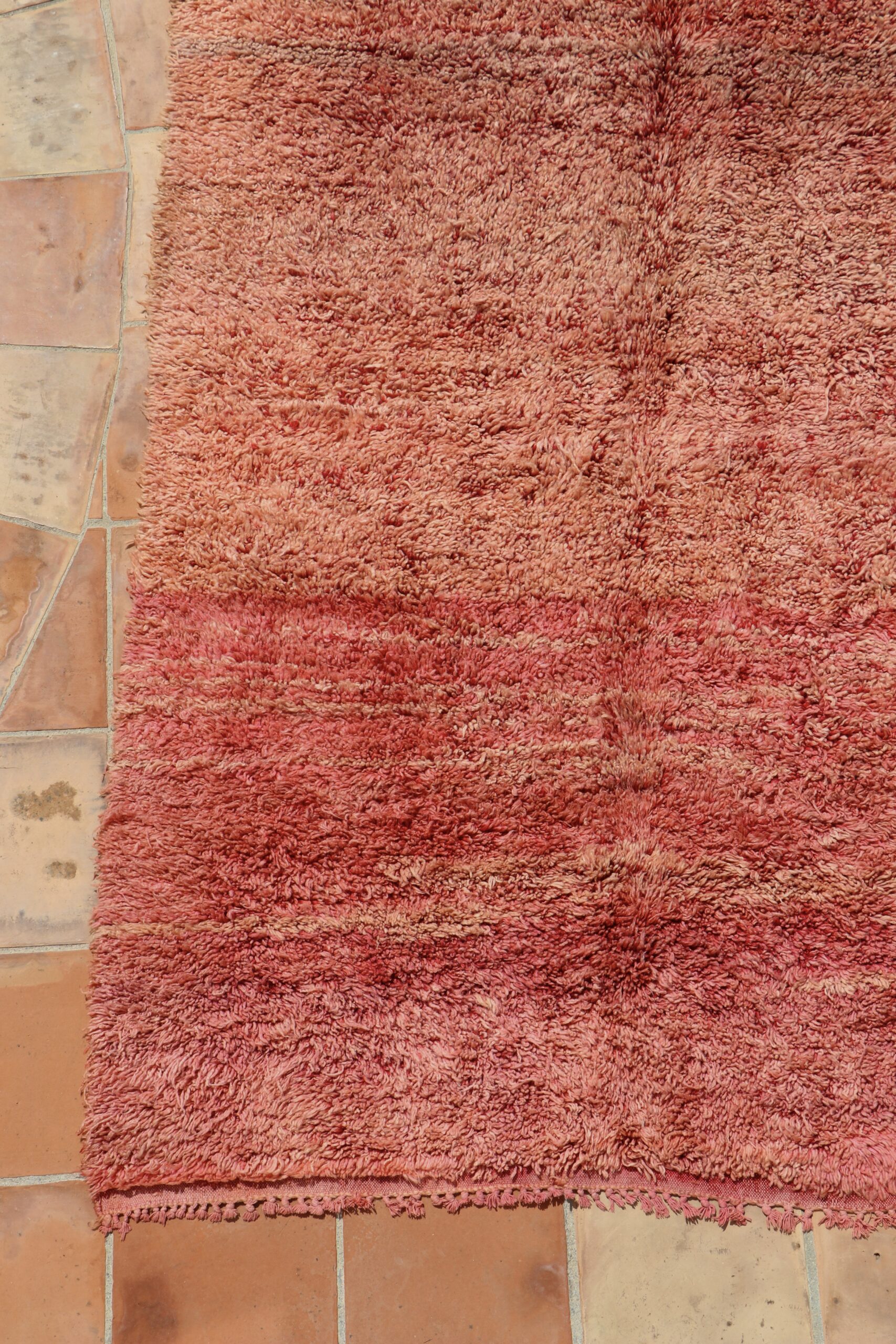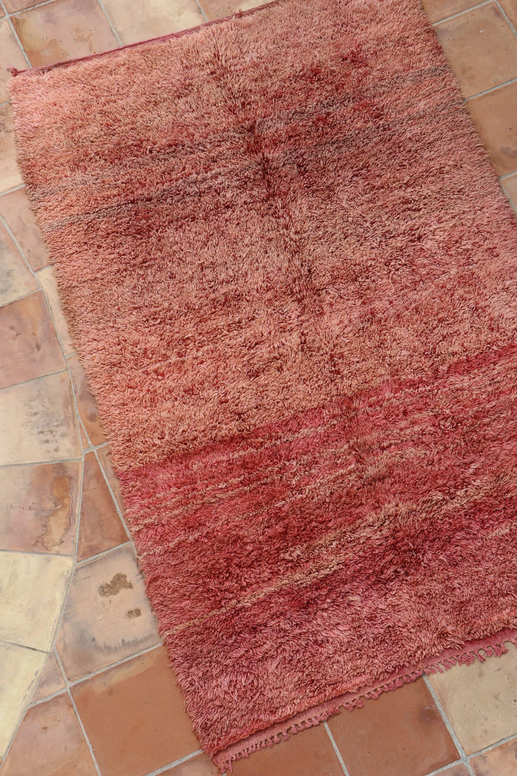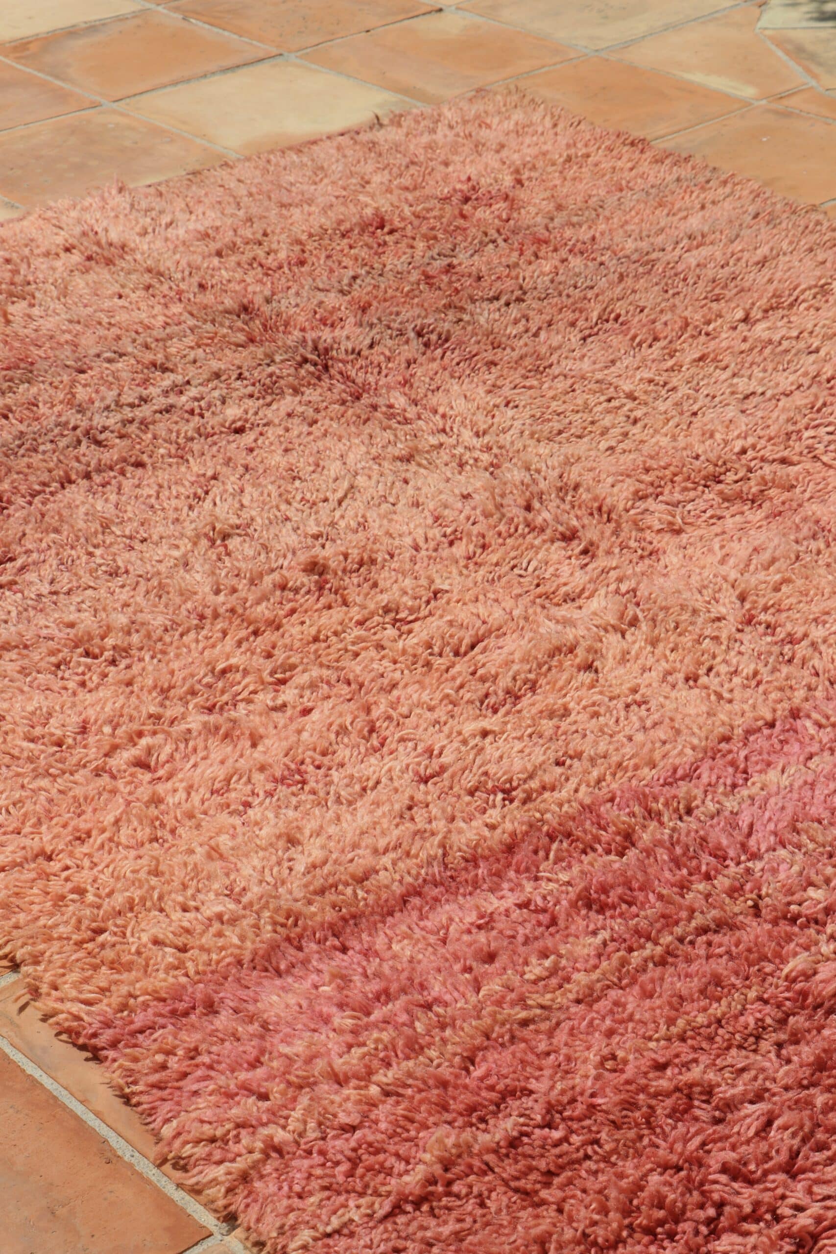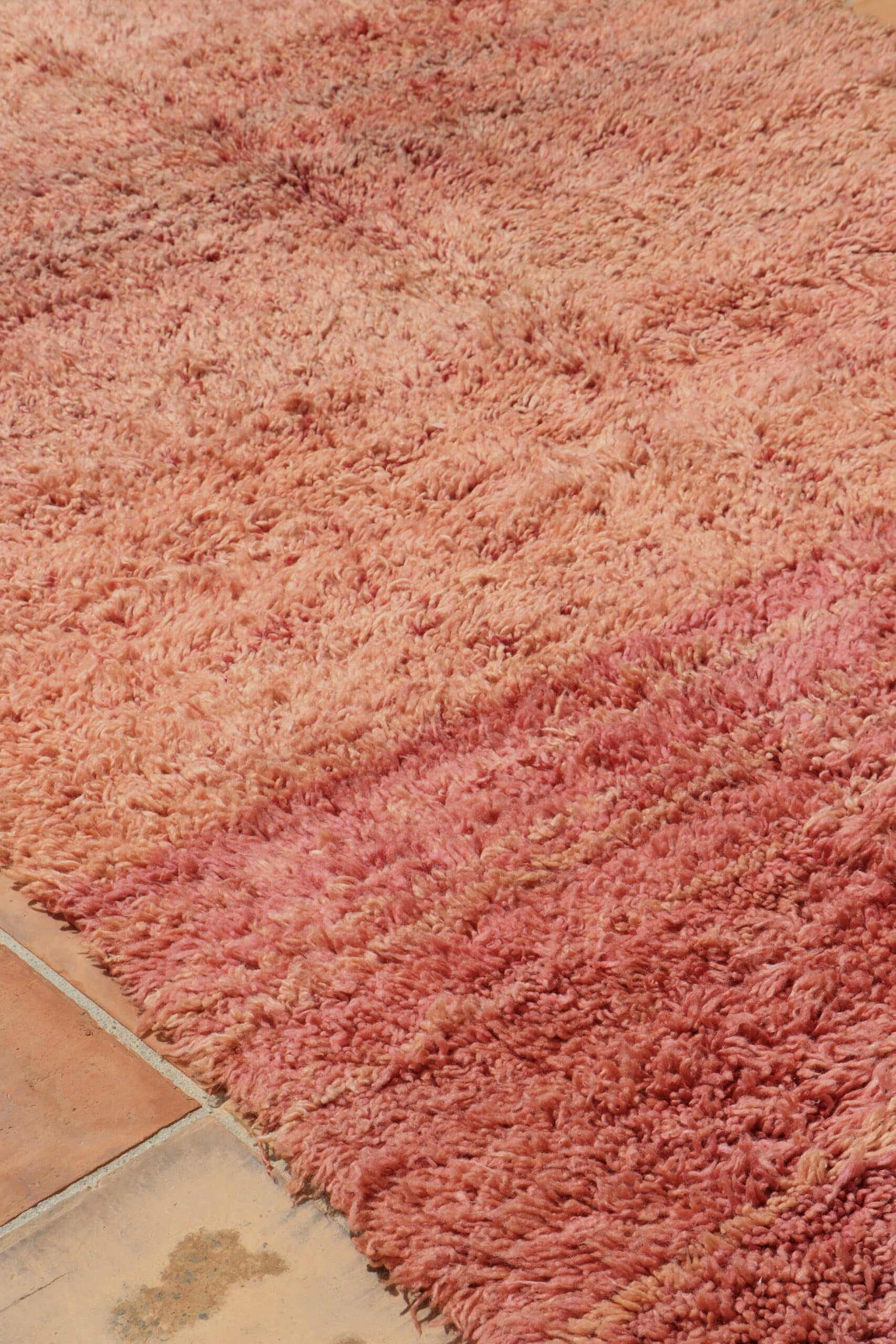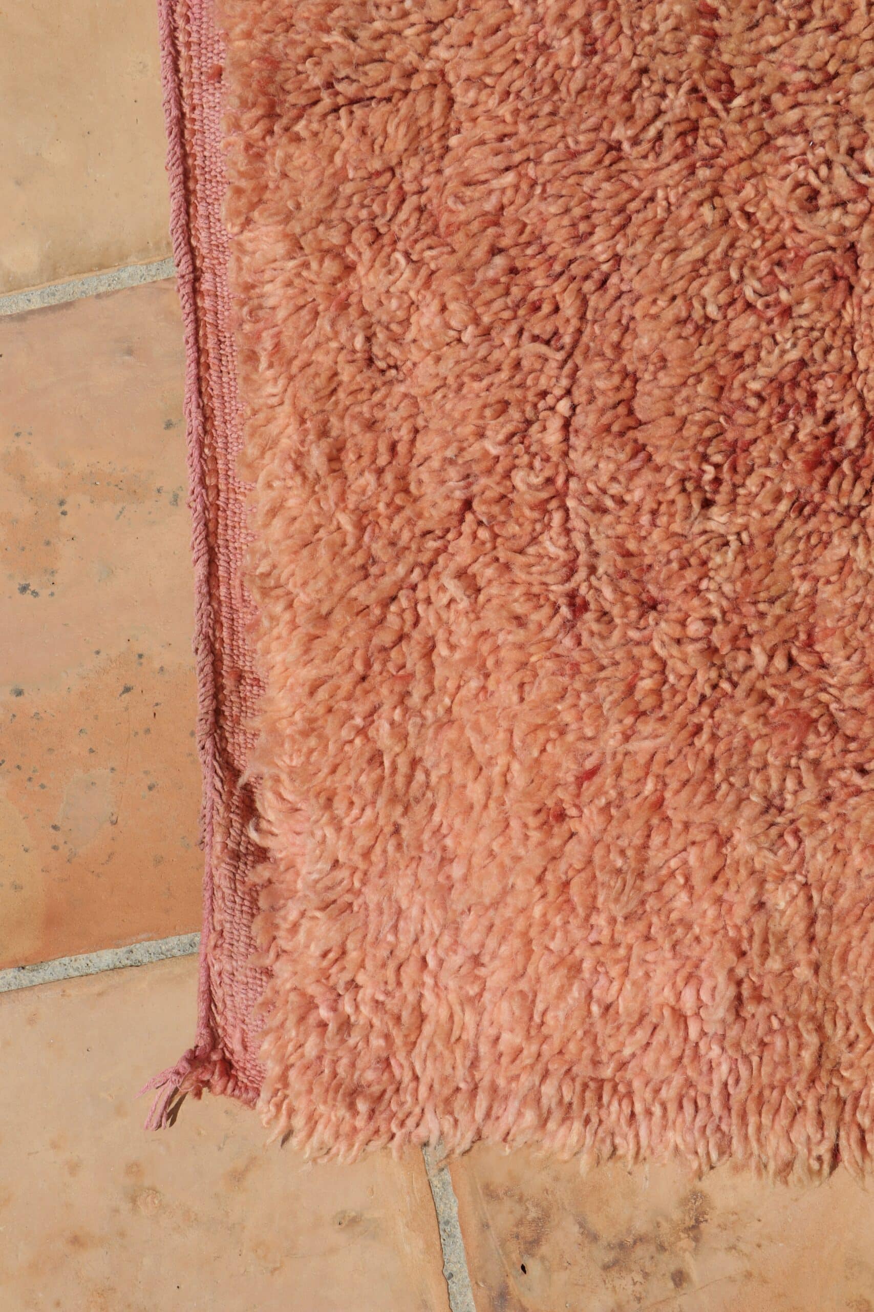Tapis Beni M’rirt ancien n°33 de 313x200cm aux différentes nuances de rose, en laine de mouton teintée naturellement et coton (chaîne de fond que l’on retrouve dans les franges), poids 17,8kg.