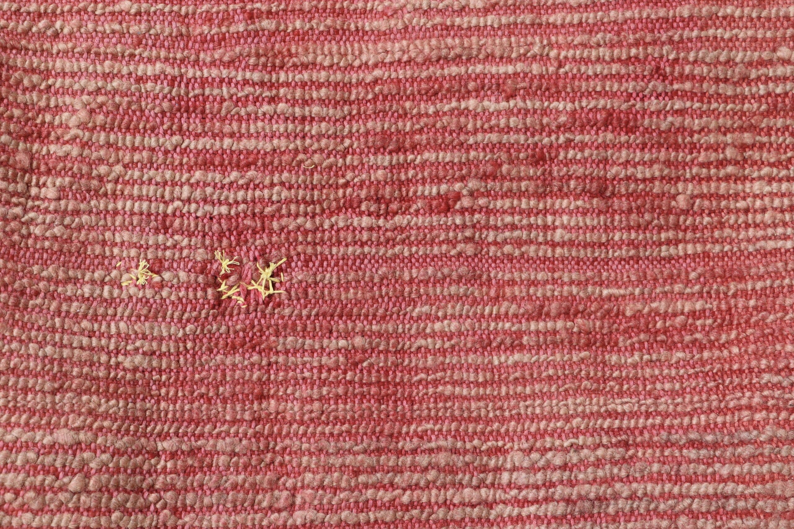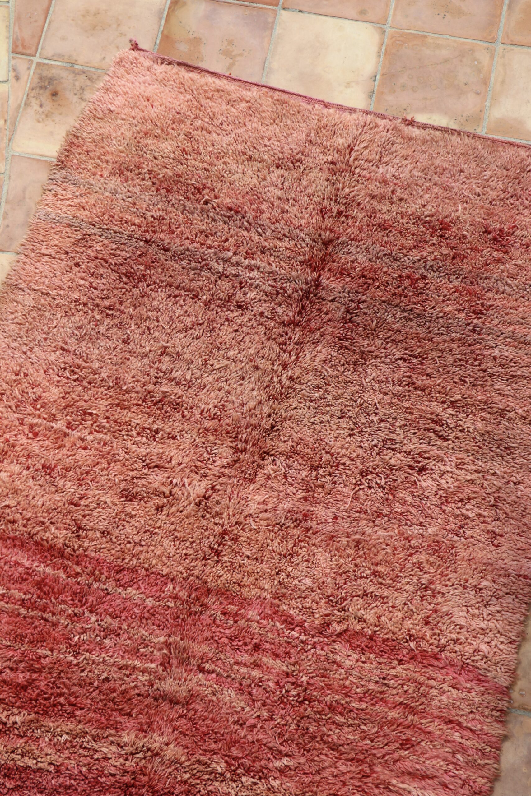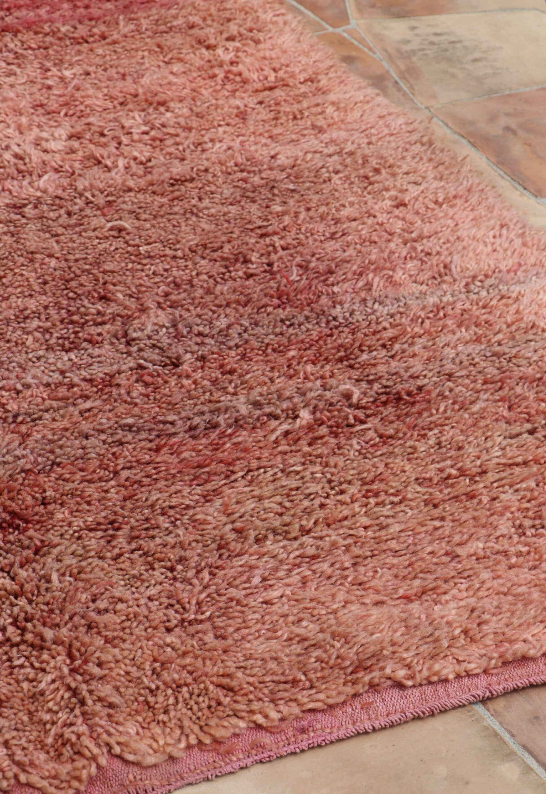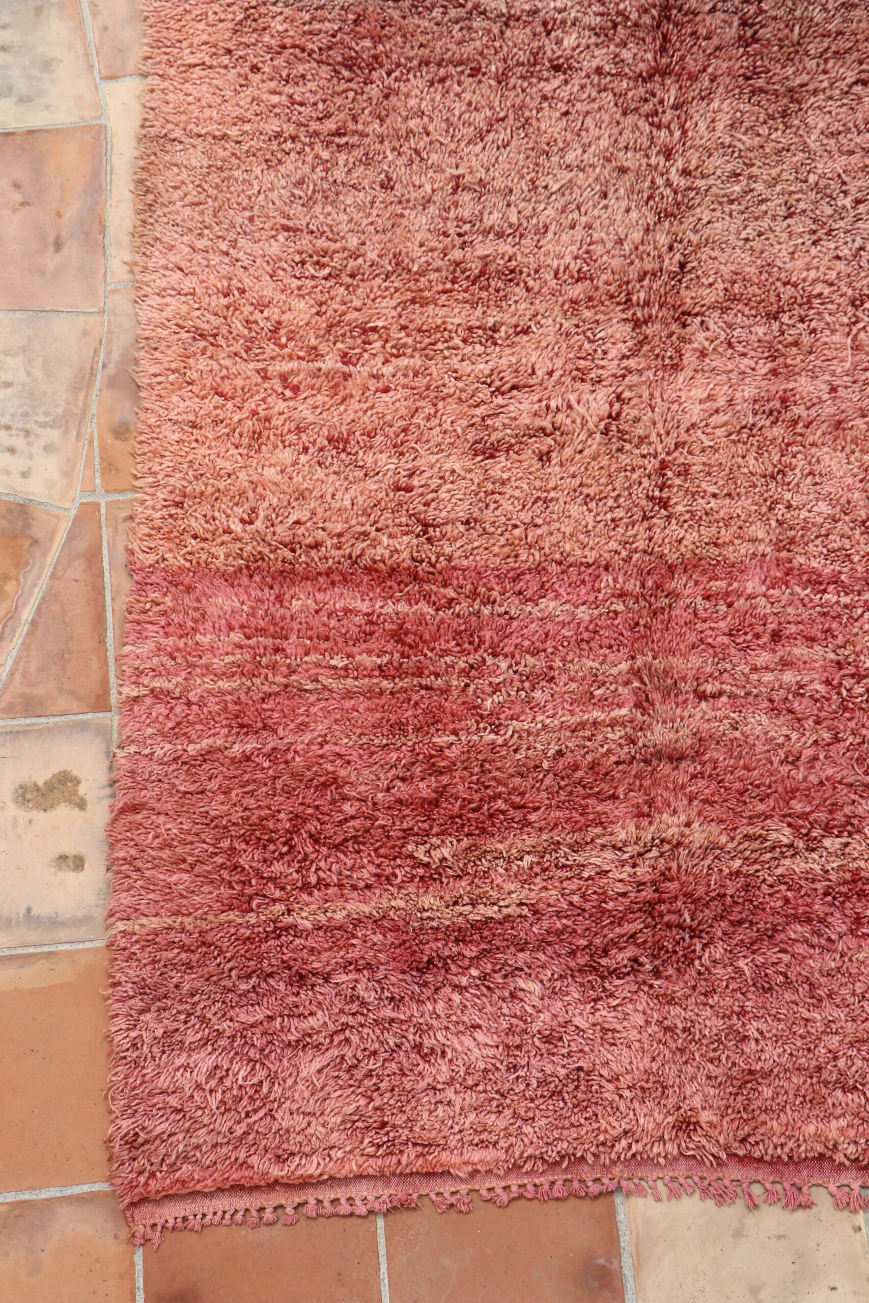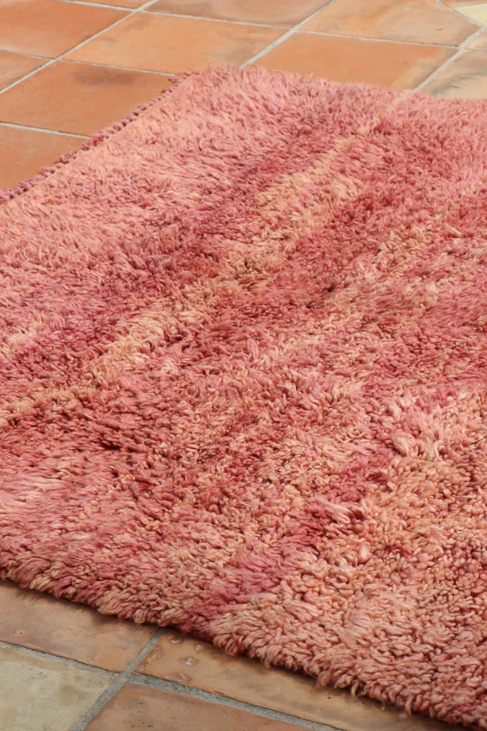 Tapis Beni M’rirt ancien n°33 de 313x200cm aux différentes nuances de rose, en laine de mouton teintée naturellement et coton (chaîne de fond que l’on retrouve dans les franges), poids 17,8kg.