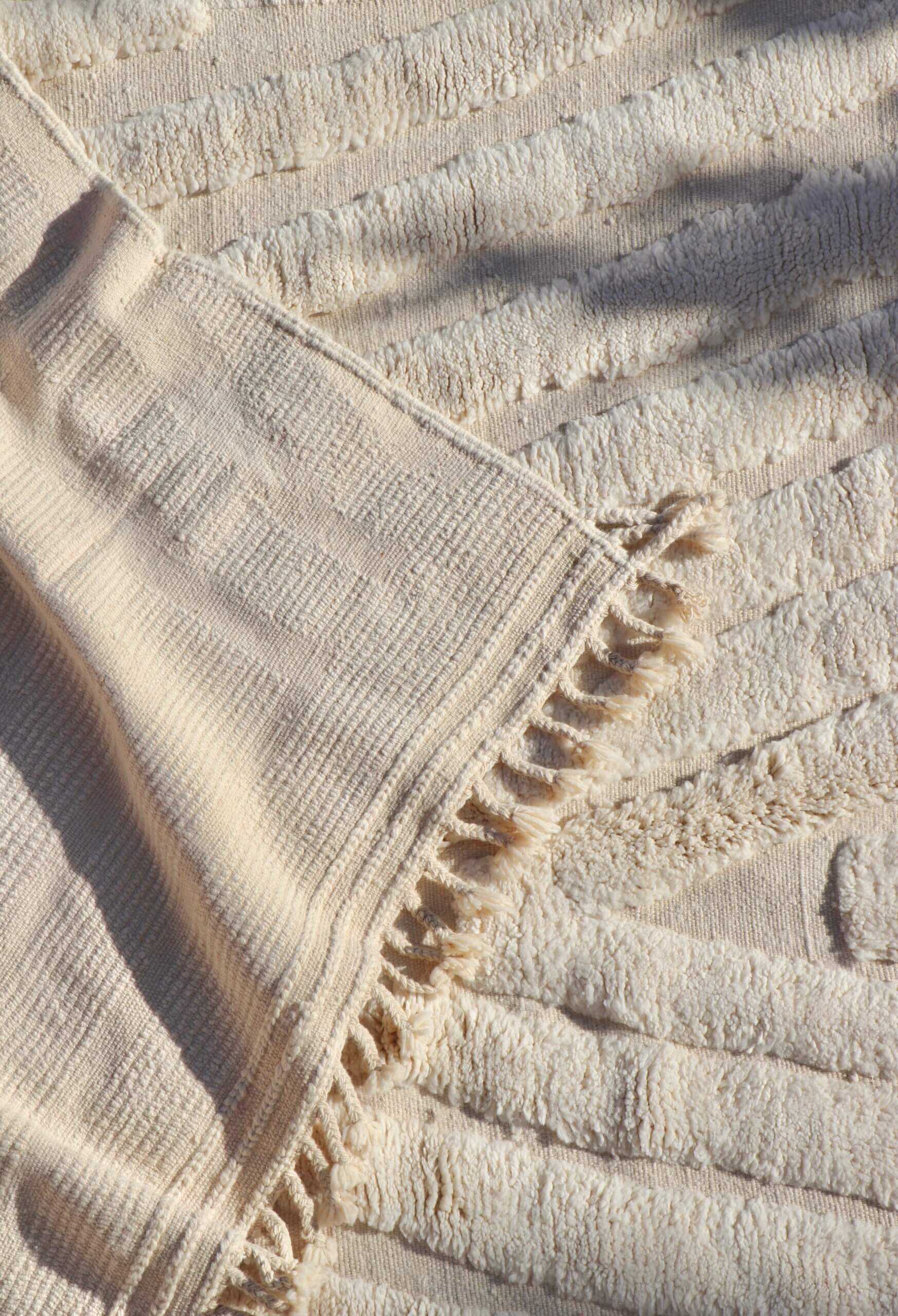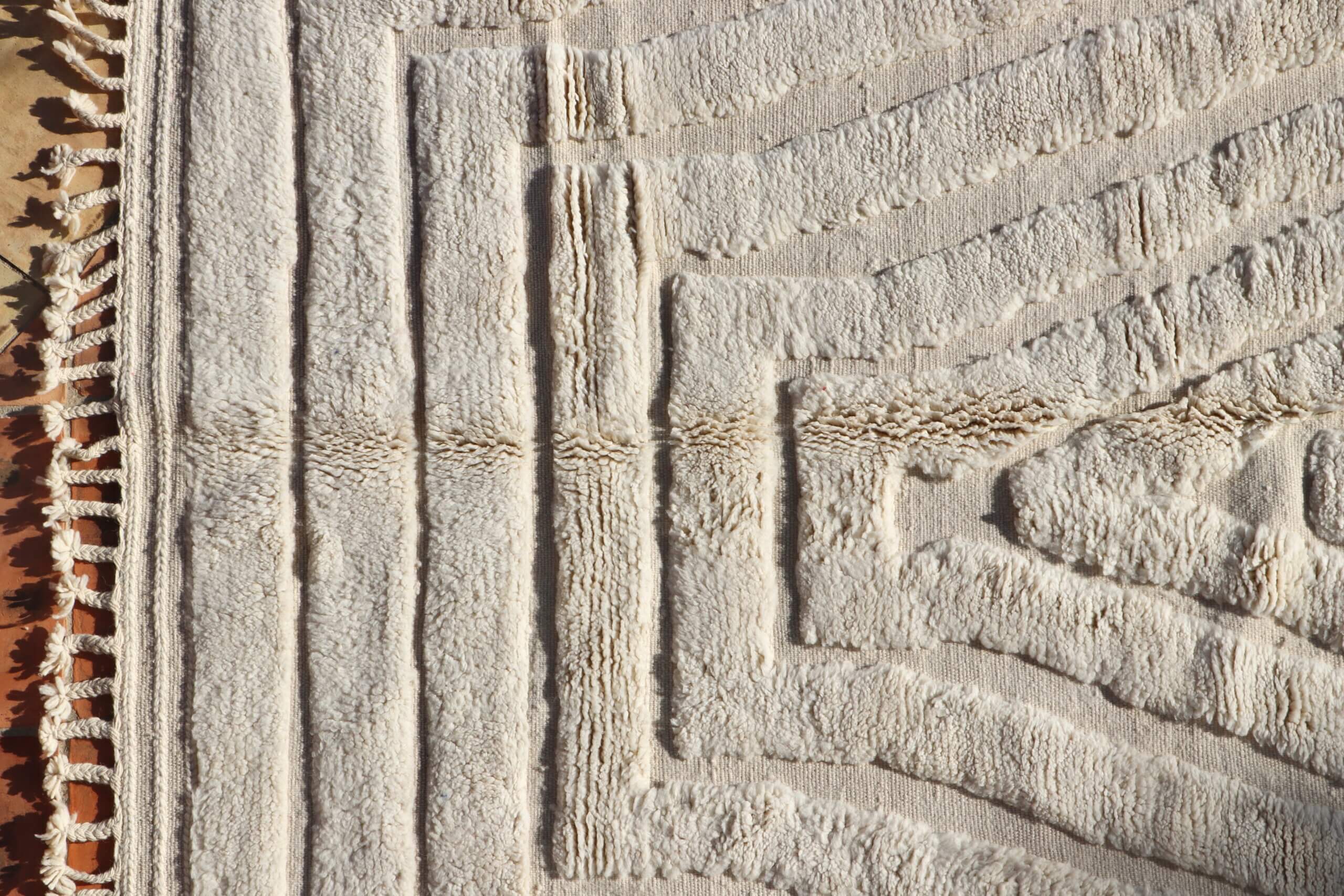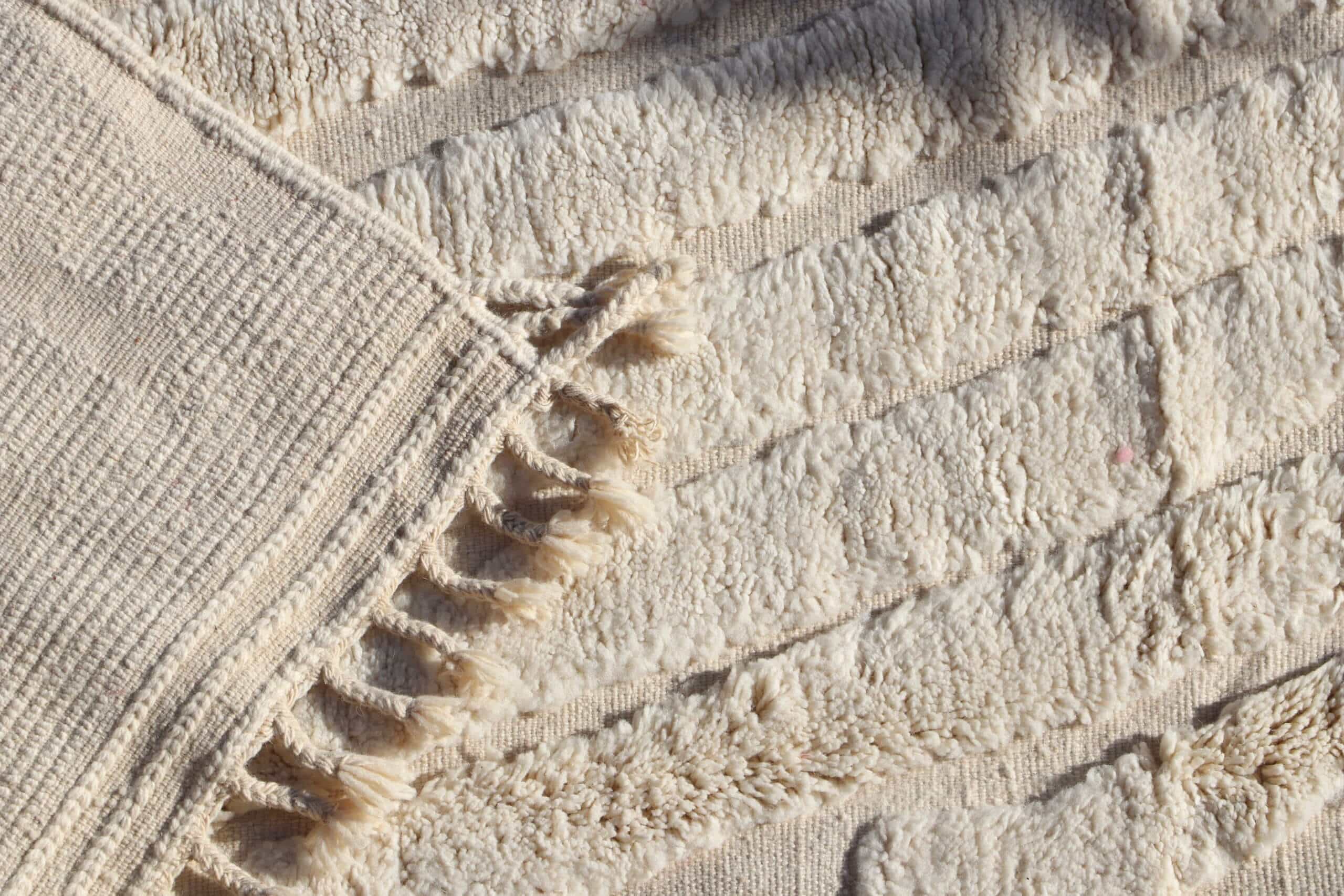 Ce luxueux tapis berbère Beni Ouarain blanc apportera douceur et élégance à votre intérieur. Sa réalisation est 100% fait à la main par de talentueuses tisserandes, tissé sur un métier à tisser traditionnel dans les montagnes du Moyen Atlas au Maroc.