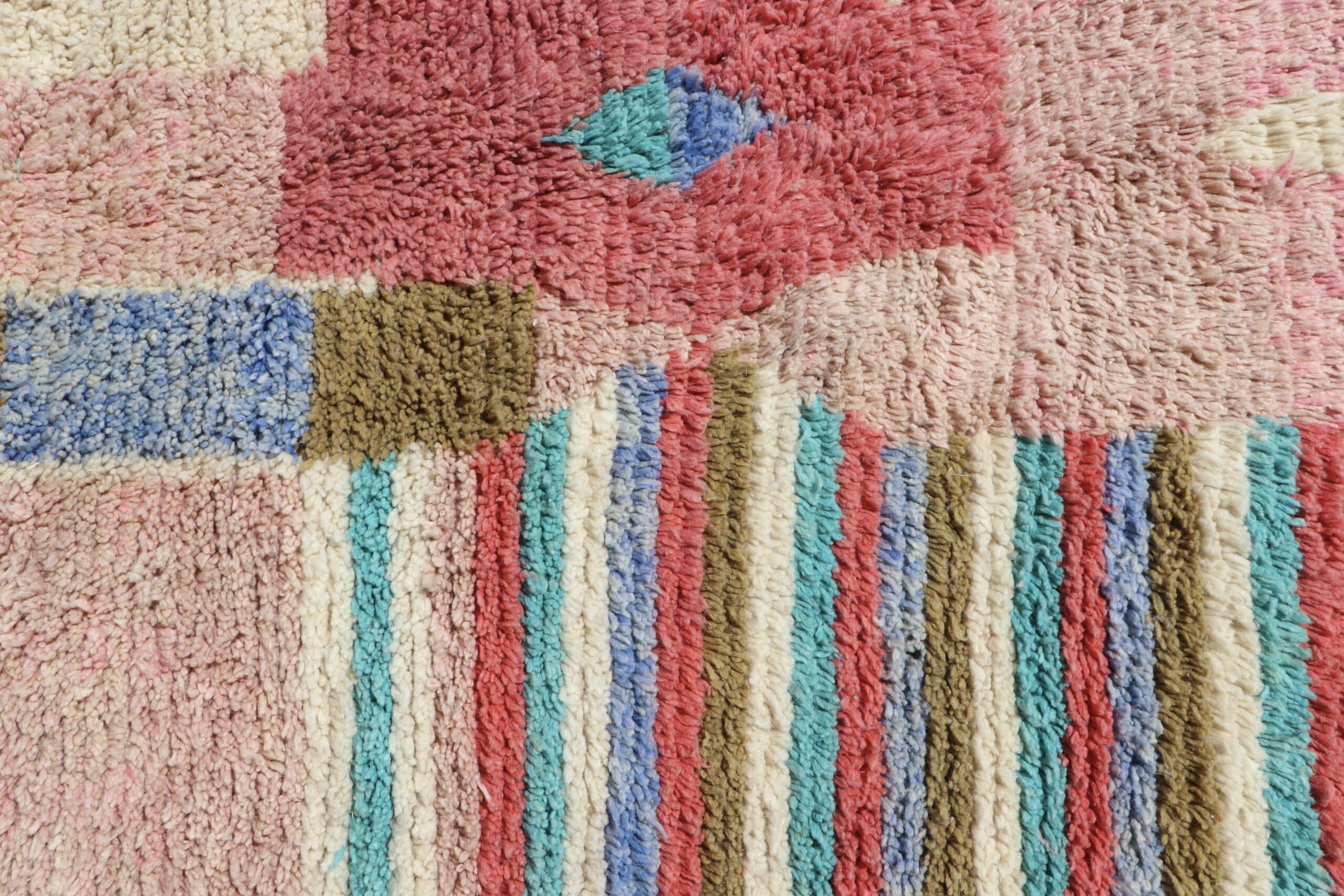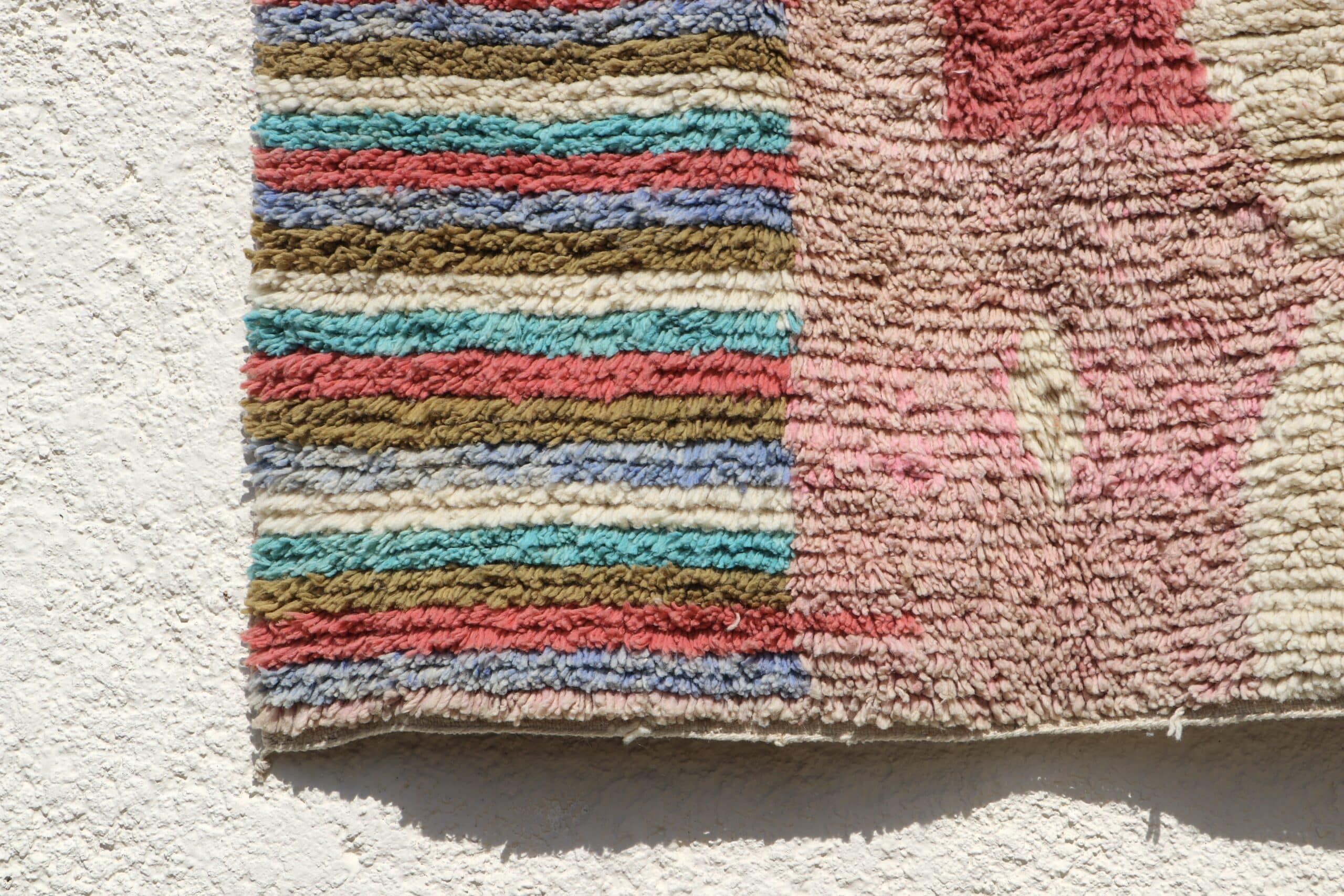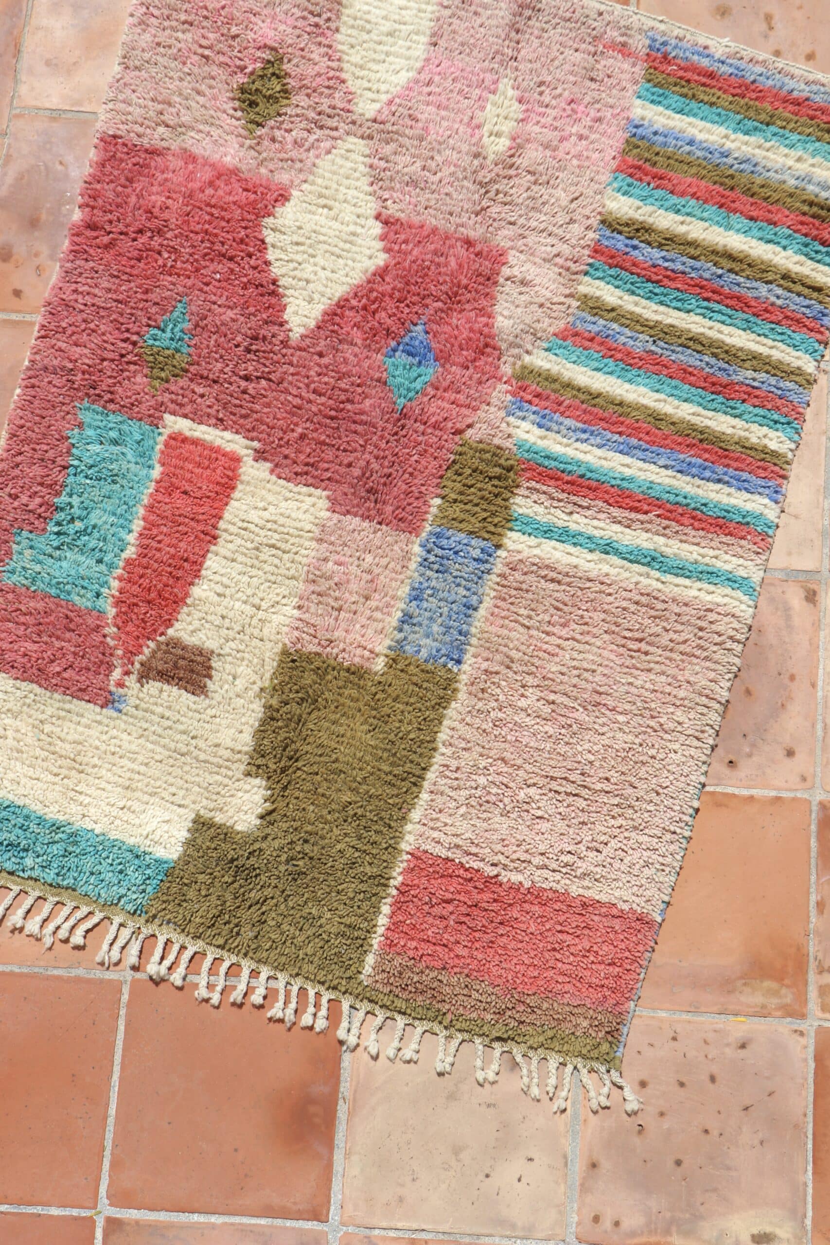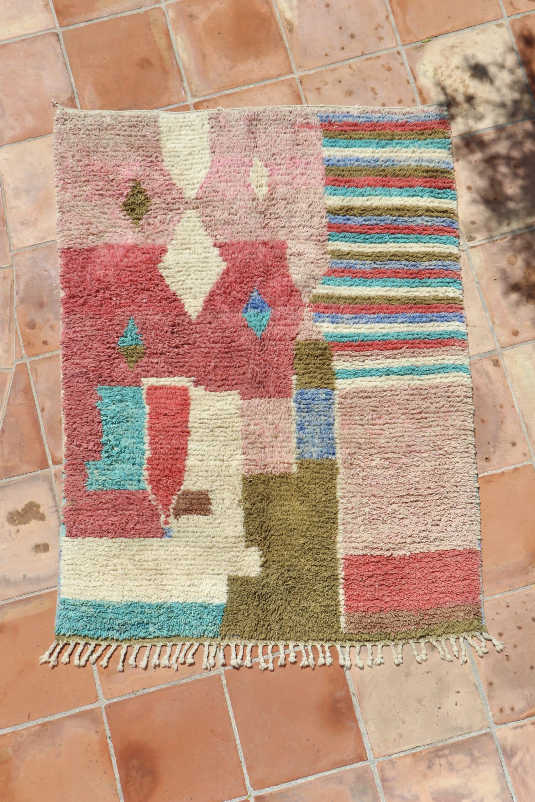 Tapis Boujaad n°27 de 205x150cm à dominance de rose kaki et bleu, 100% laine de mouton teintée naturellement, poids 5,8kg.