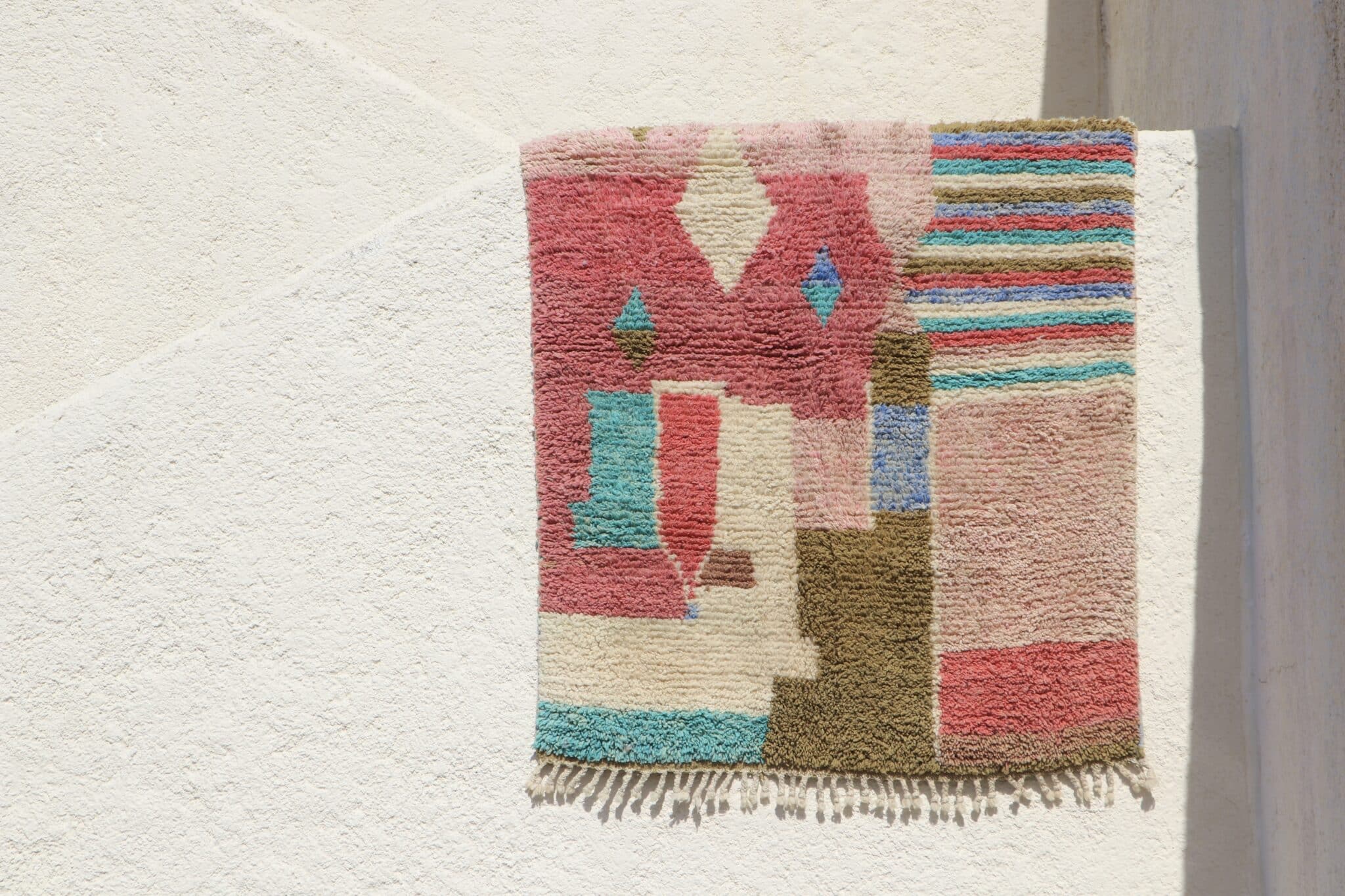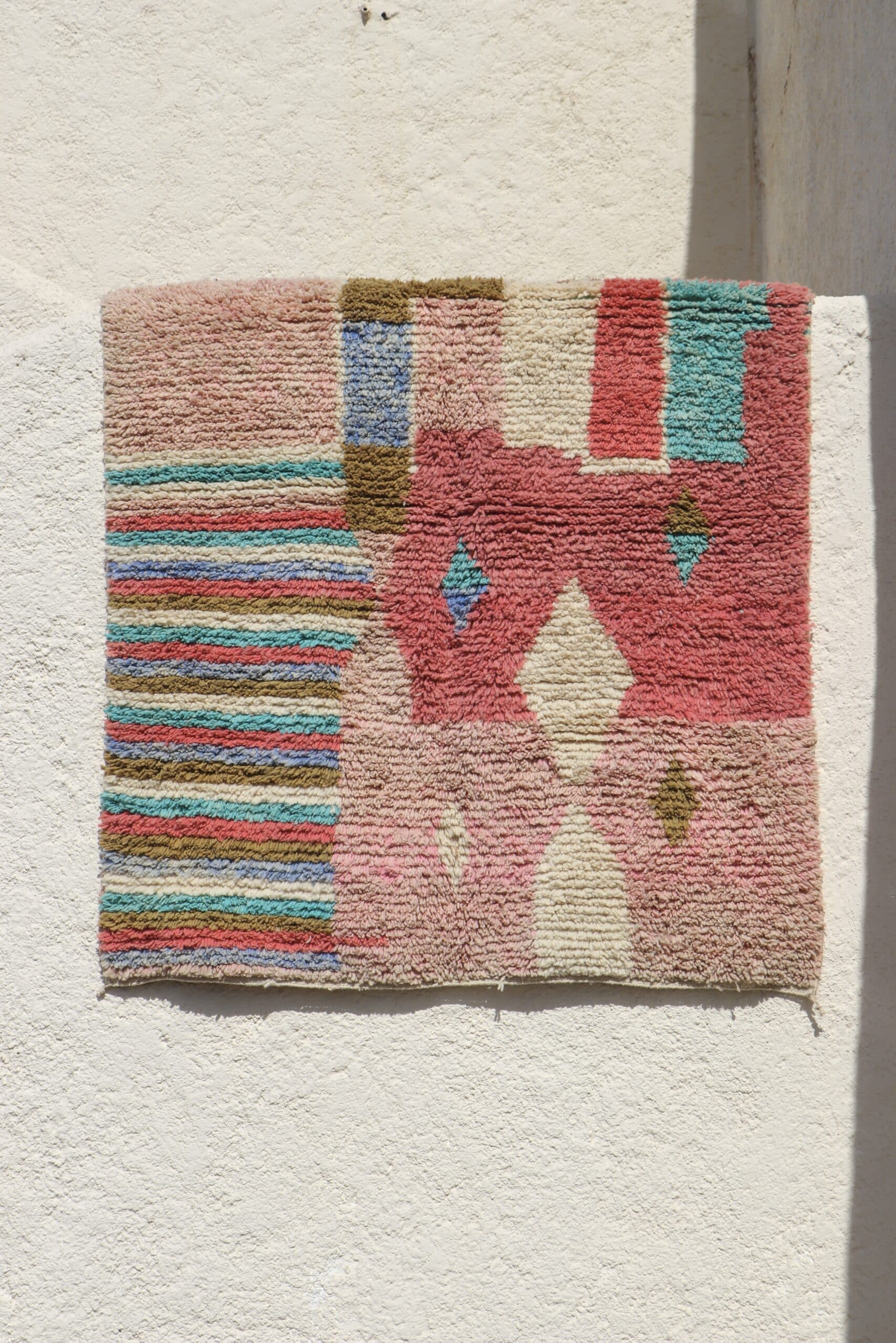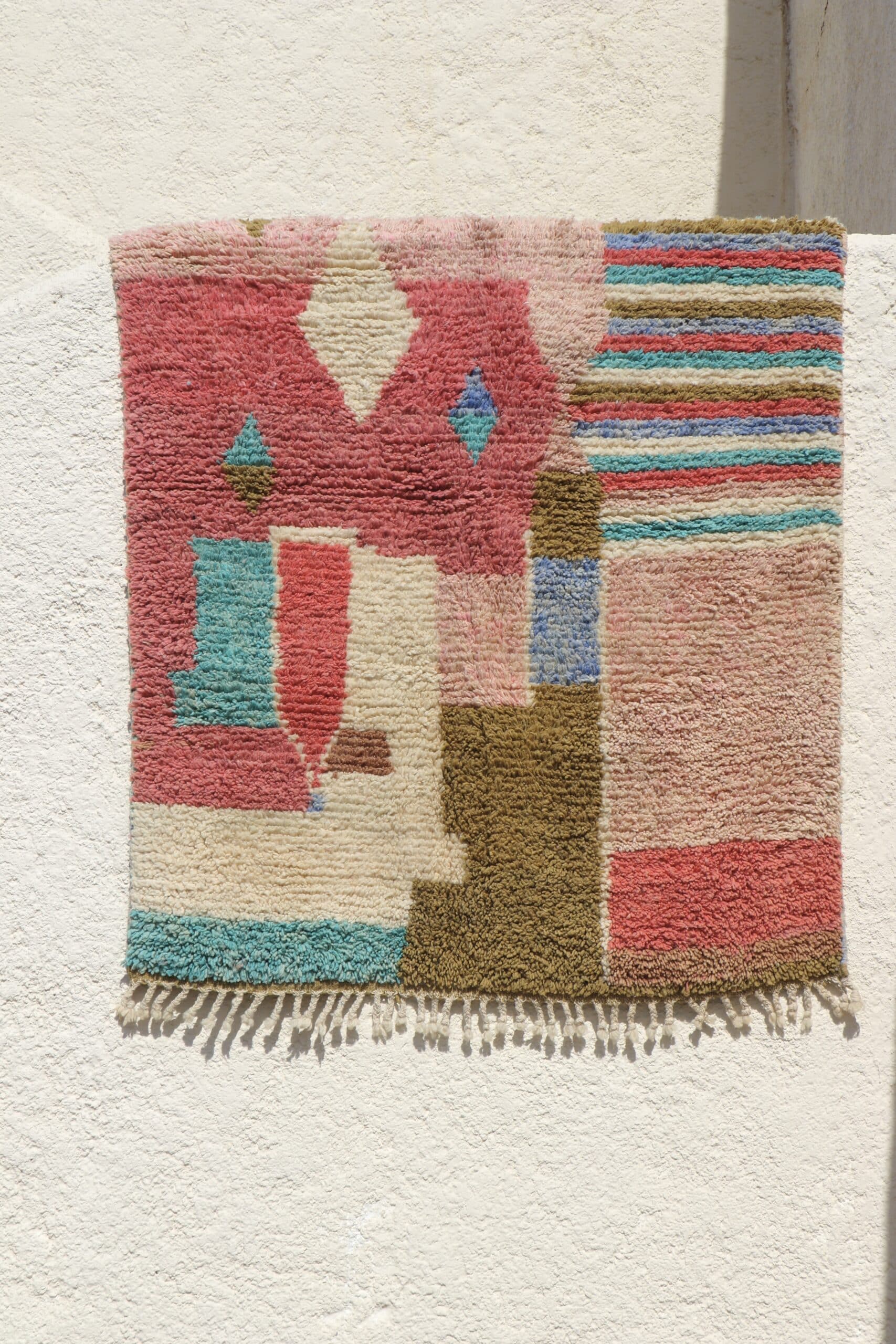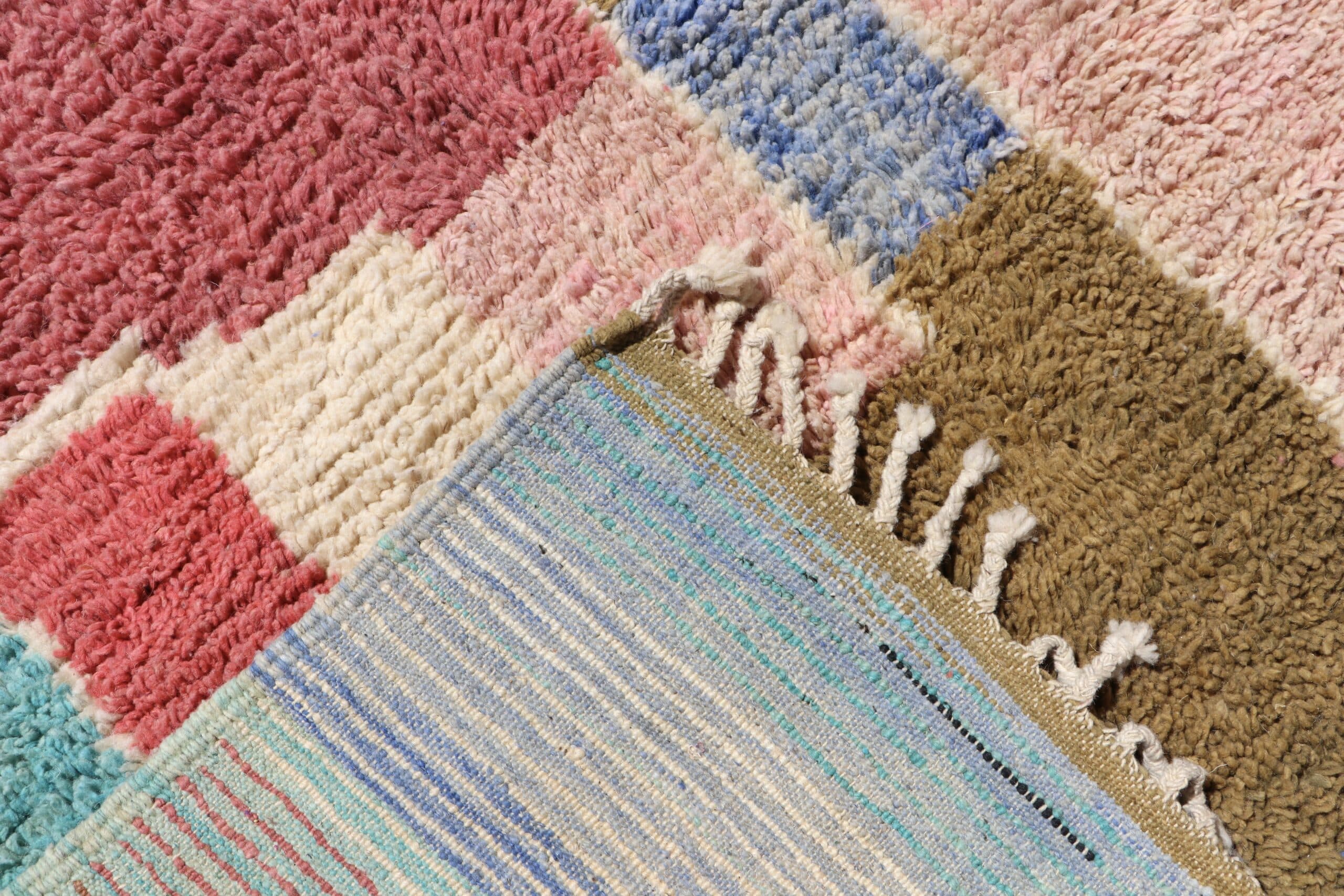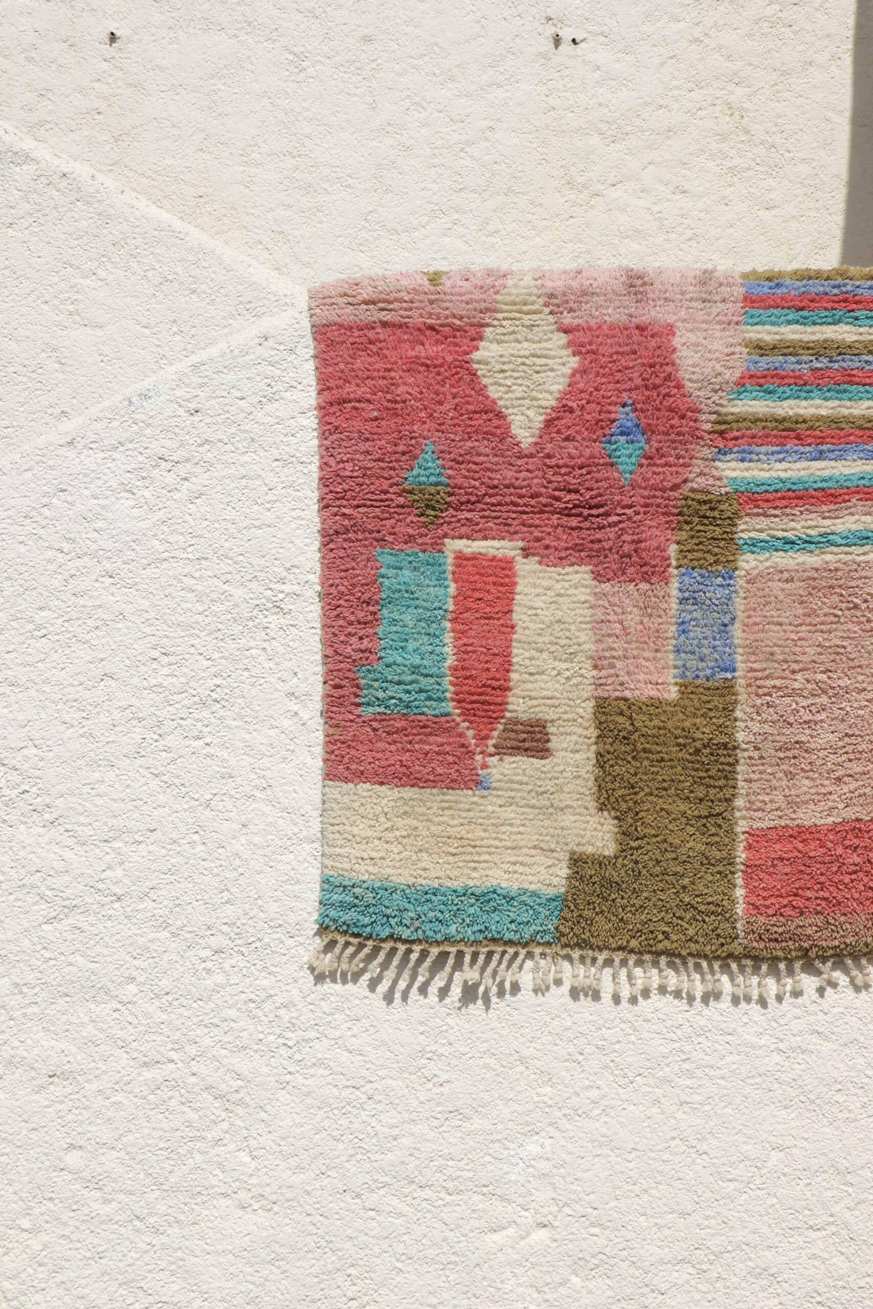 Tapis Boujaad n°27 de 205x150cm à dominance de rose kaki et bleu, 100% laine de mouton teintée naturellement, poids 5,8kg.