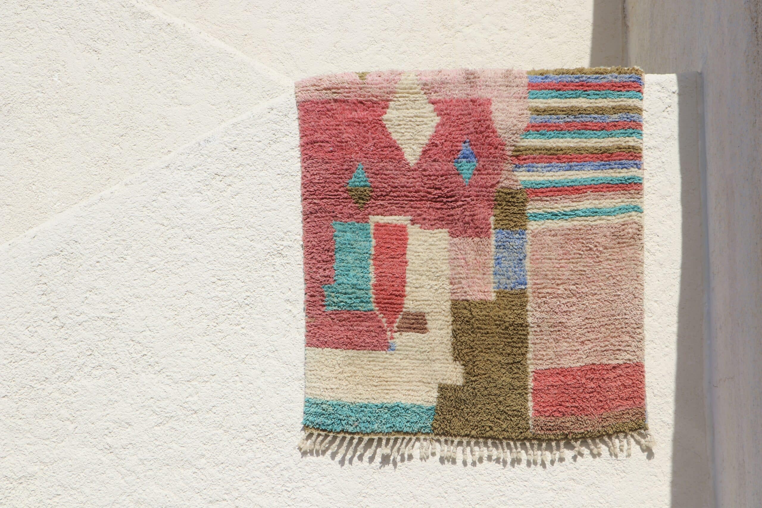 Ce type de tapis a la particularité d’avoir un décor composé de motifs à couleurs vives ou fluos, sur fond de nuances de blanc ou crème. Ils sont fabriqués en laine de mouton, avec pour certains tapis l’utilisation de laine mélangée à du coton ou des fibres synthétiques pour plus de créativité ainsi que pour bénéficier de couleurs qui ne peuvent pas être créées à partir de teintures naturelles, mais aussi lorsque la laine se fait rare ou que certaines familles ne peuvent pas s’en offrir. Les tapis Azilal peuvent être confectionnés avec une chaîne de fond en coton que l’on retrouve dans les franges. Les noeuds de tissage sont moins serrés et tassés que leurs cousins Beni Ouarain ou M’rirt mais le moelleux et la douceur de la laine reste un pur bonheur.