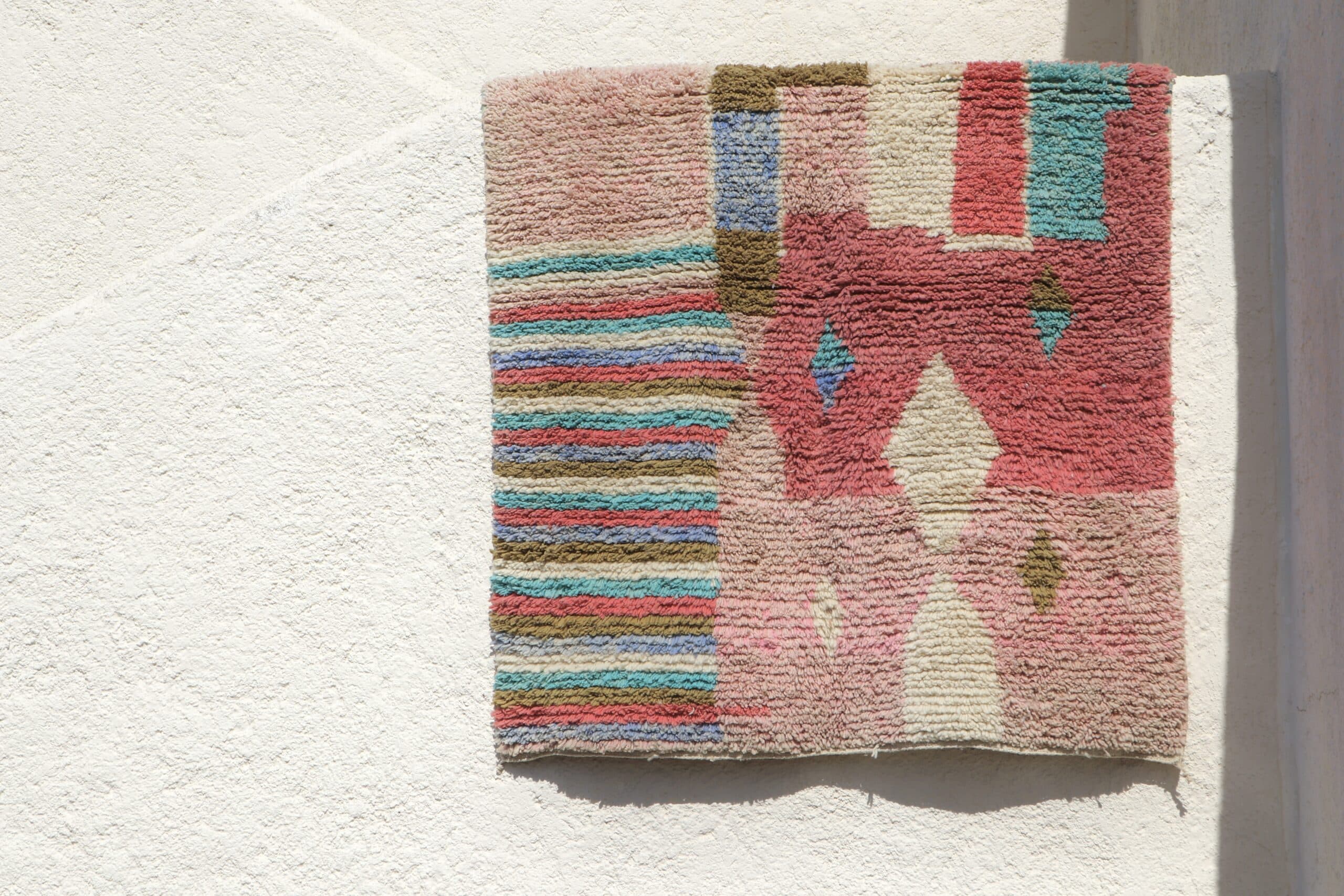 Ce tapis Boujaad à la laine épaisse et aux couleurs douces donnera un rythme apaisant à votre intérieur. C’est un tapis moyen format que l’on imagine bien dans une chambre d’enfant, un espace lecture, ou une pièce dédiée à la relaxation en connexion avec la nature…