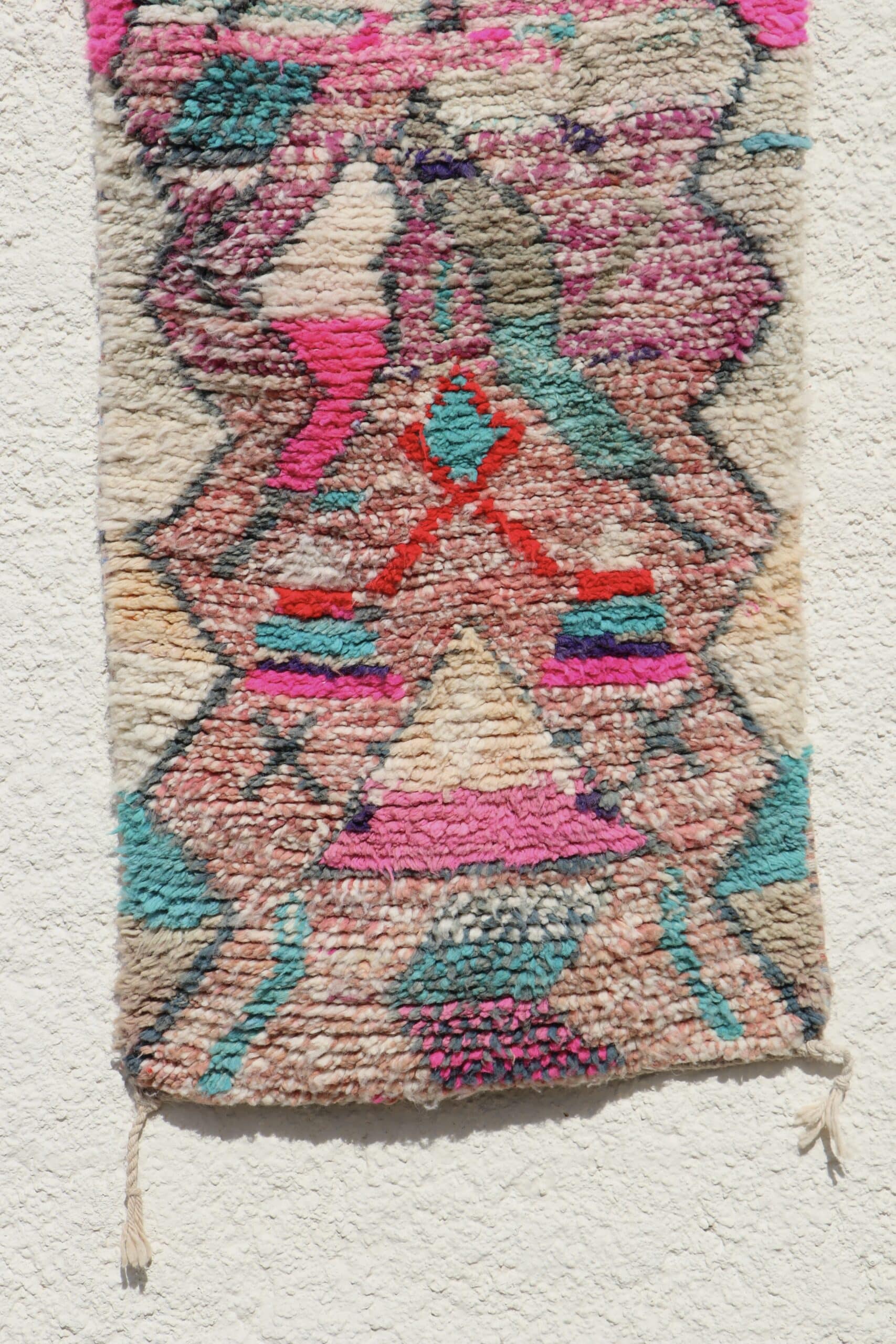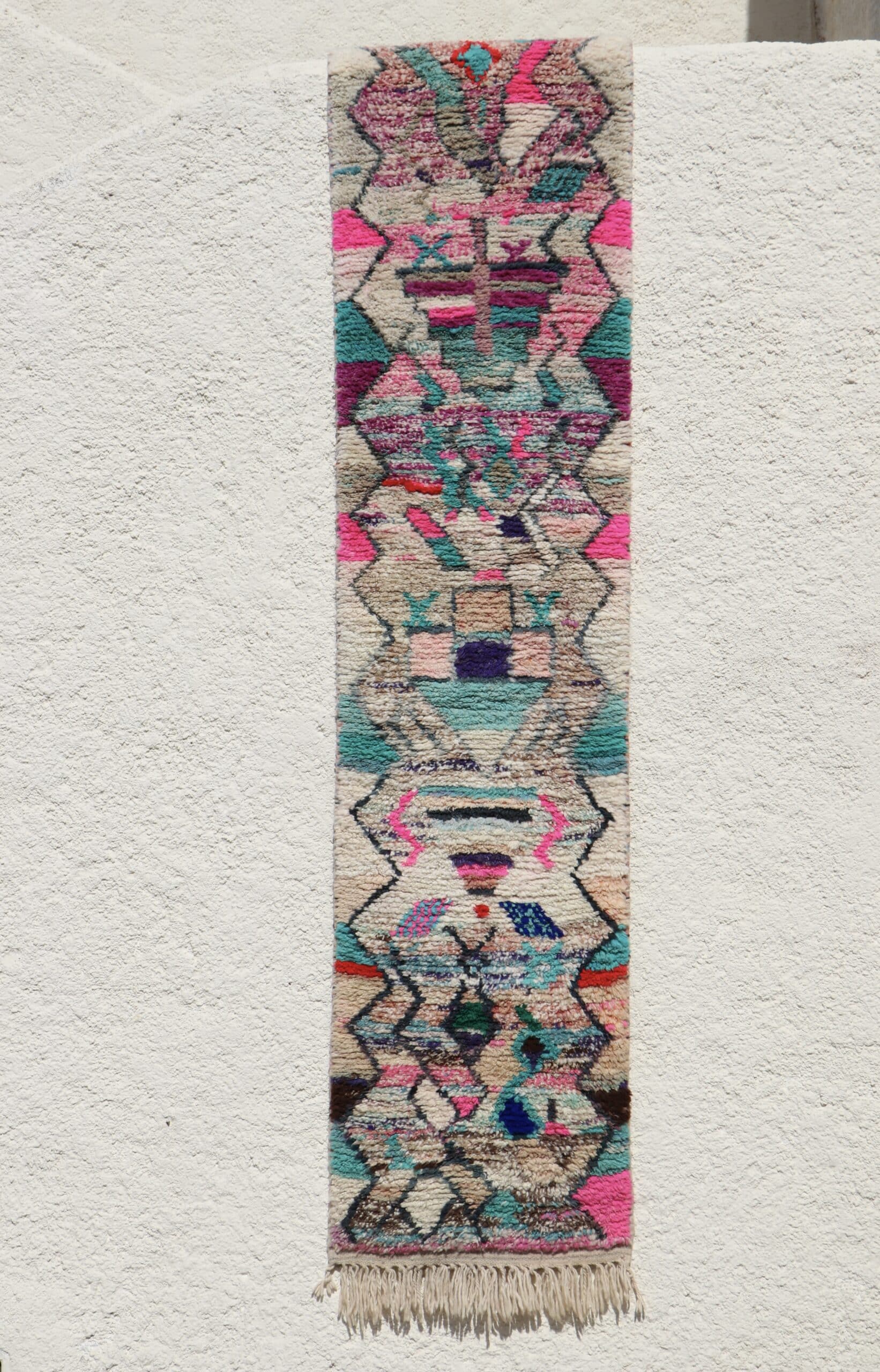 Tapis de couloir Boujaad n°28 de 340x70cm à dominance de bleu et de rose , 100% laine de mouton, poids 6kg.