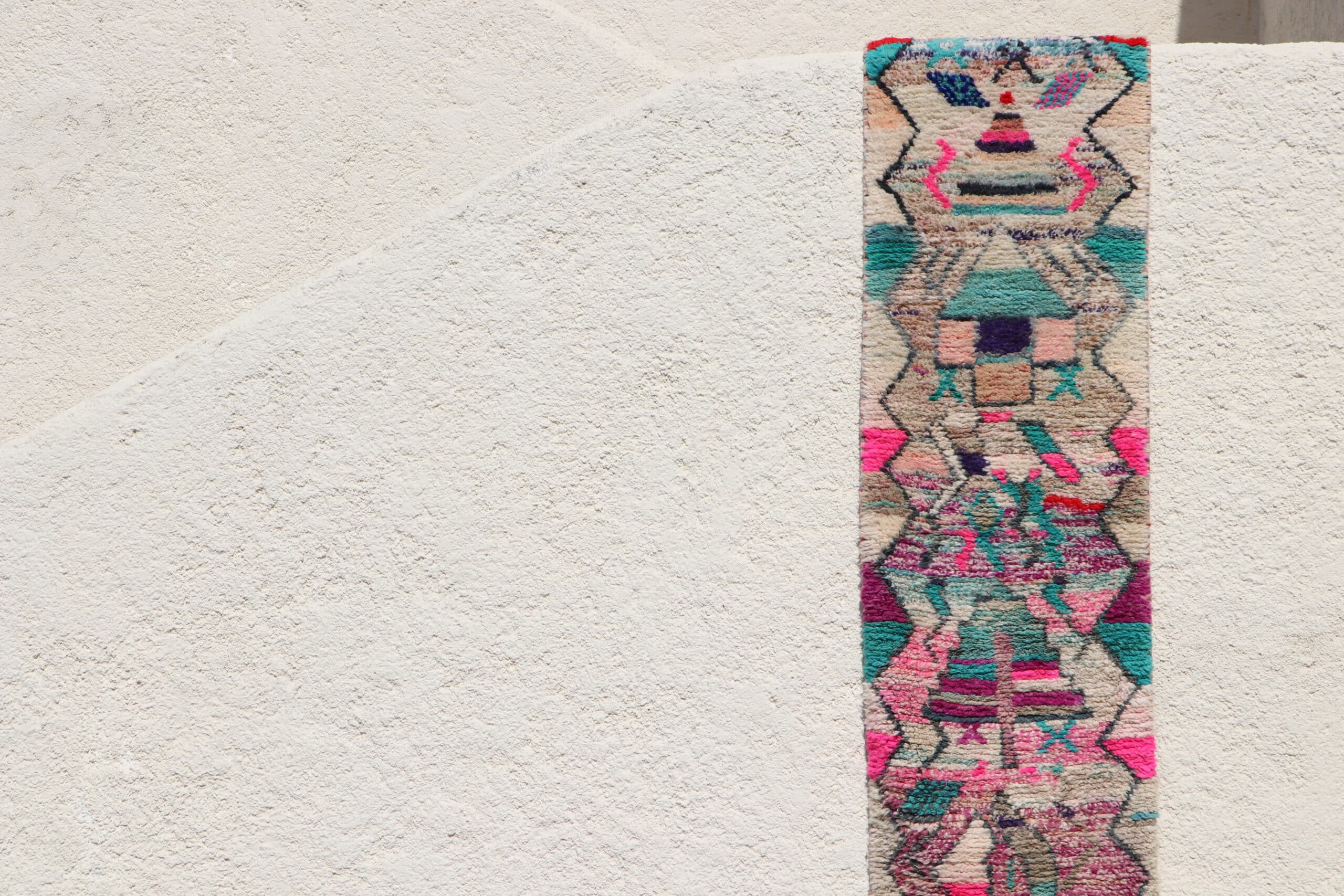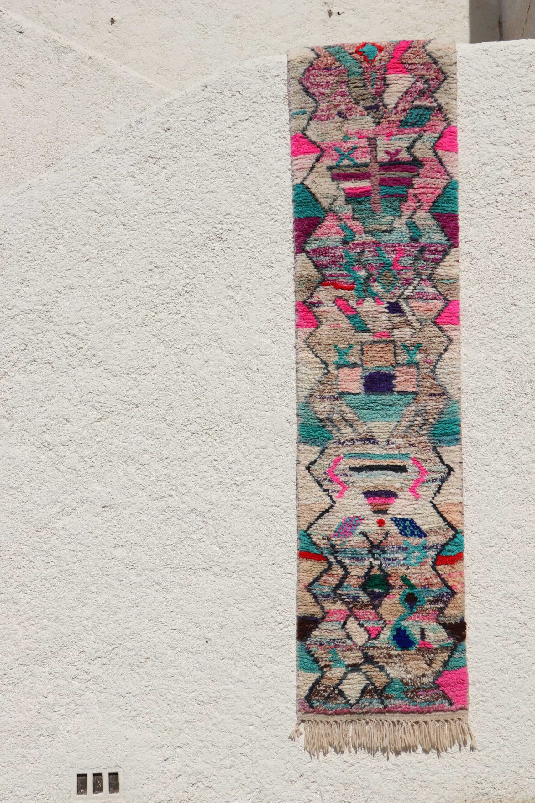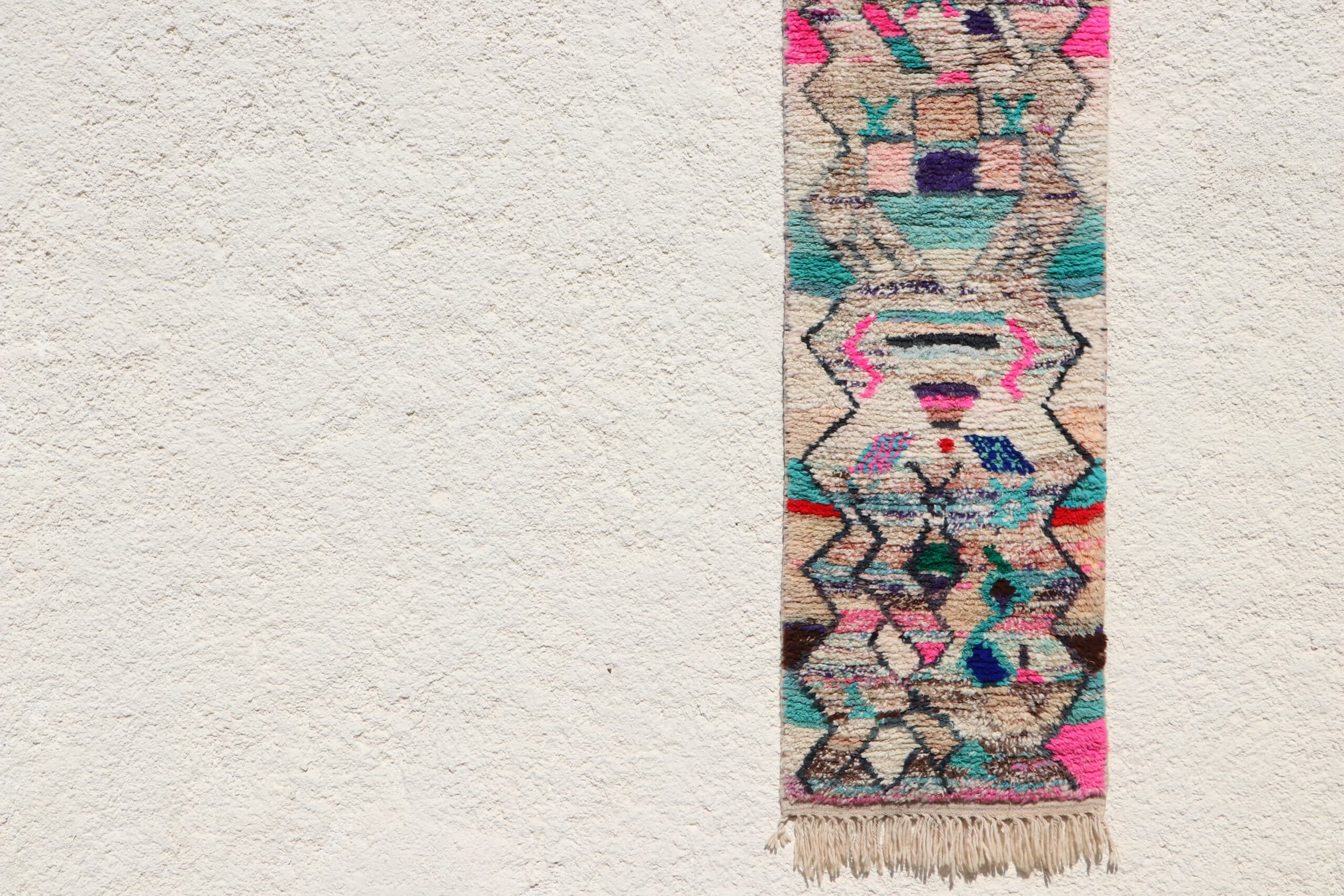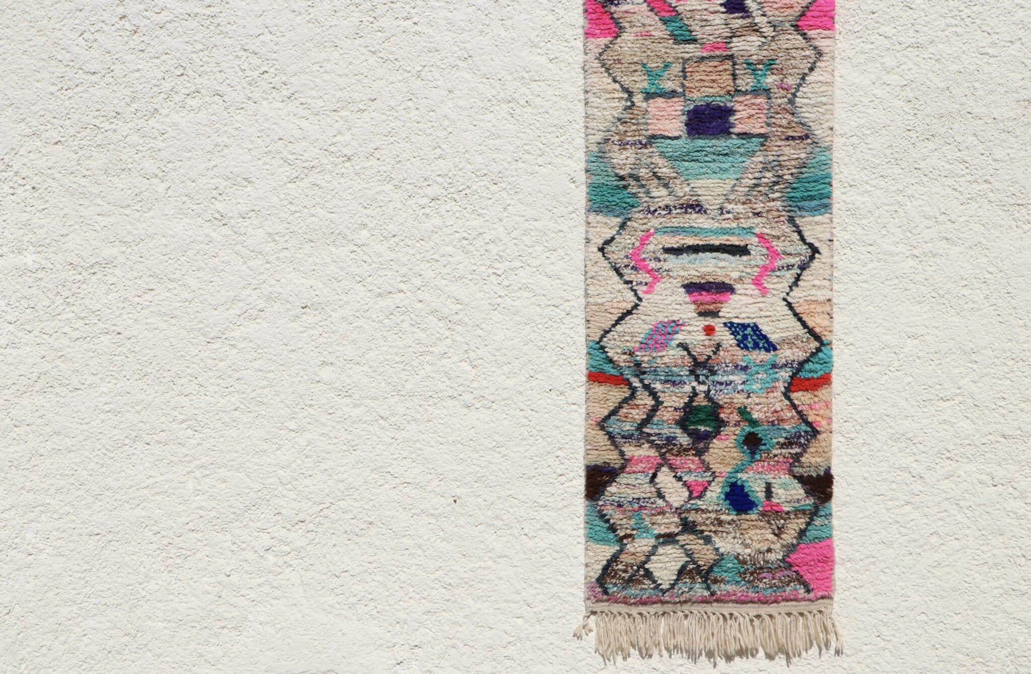 Illuminez votre couloir avec ce tapis Boujaad à la laine douce et épaisse. Son accumulation de motifs et symboles géométriques lui donne une dynamique colorée pour un couloir qui manque de lumière et de fantaisie. Côté décoration murale, les tapis de couloirs peuvent être sublimés comme élément majeur dans un escalier ou dans les pièces dotées d’une grande hauteur sous plafond.