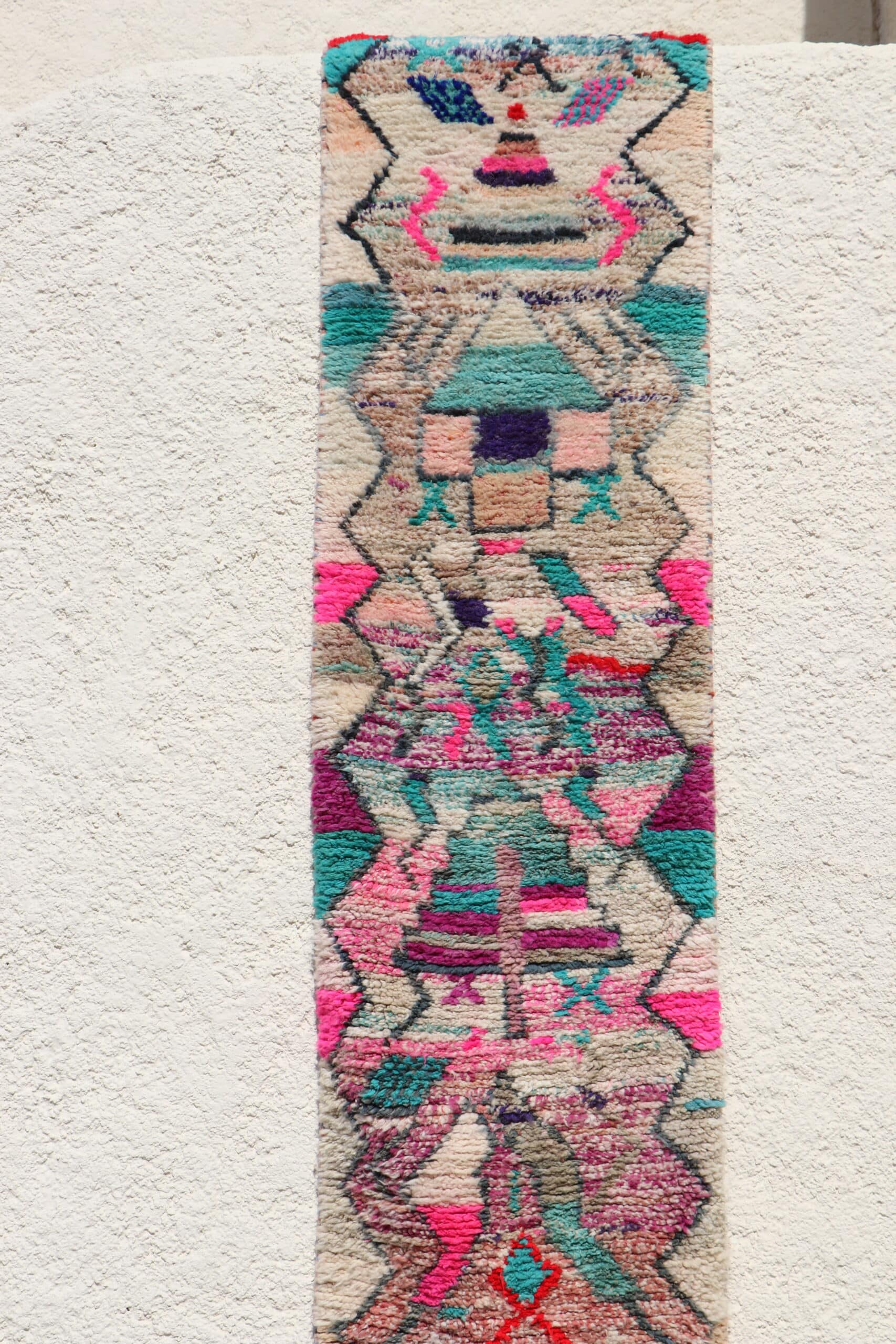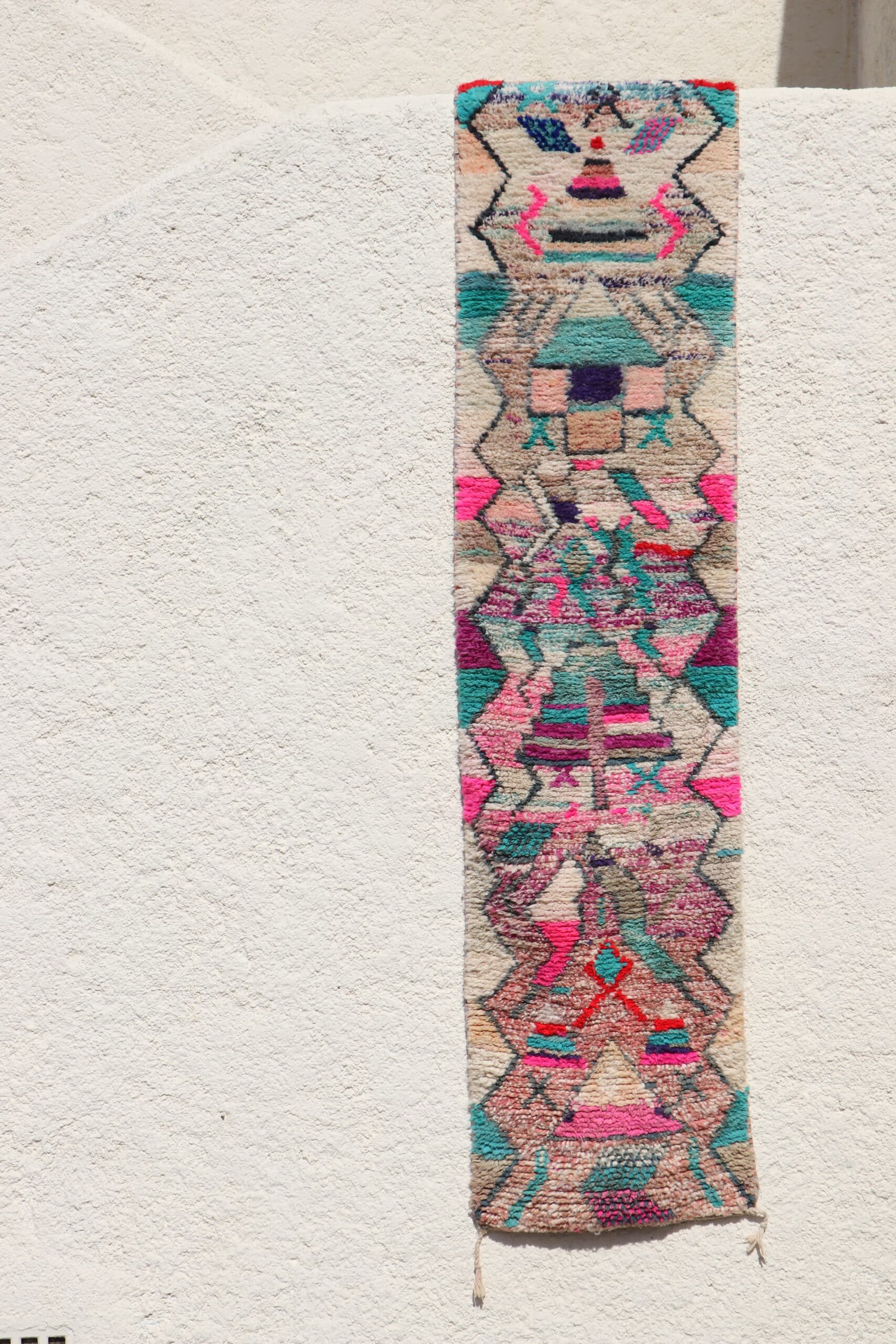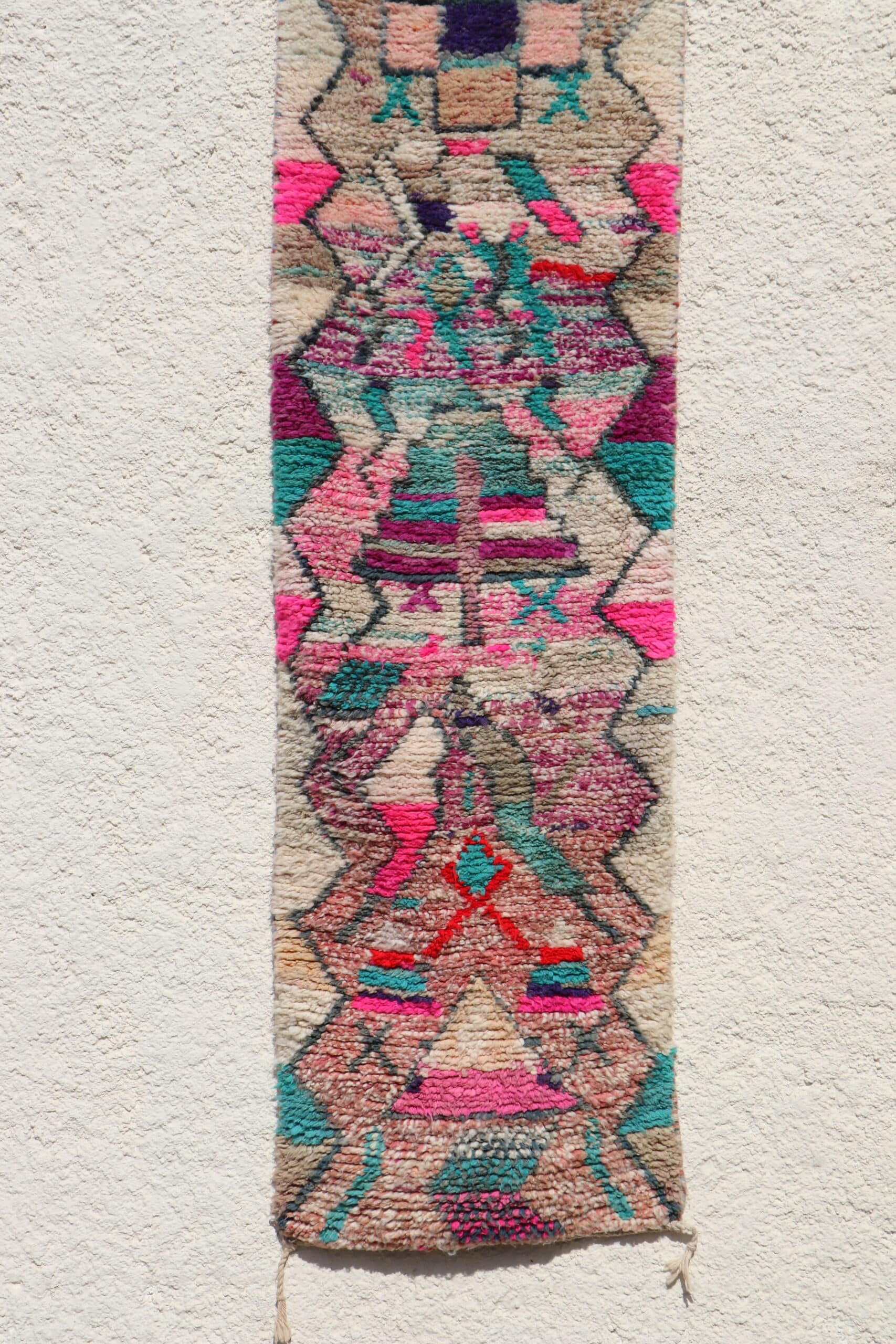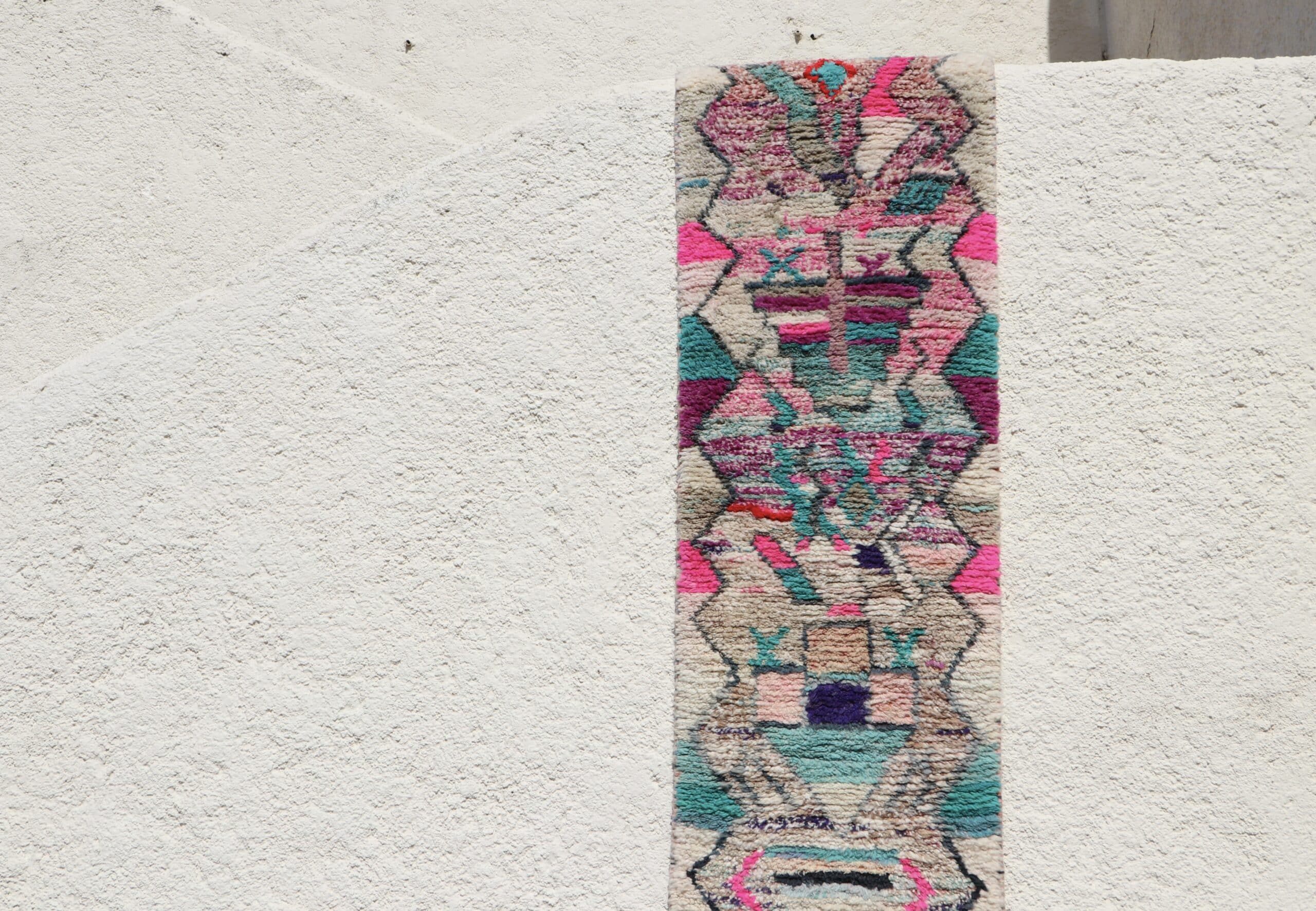 Illuminez votre couloir avec ce tapis Boujaad à la laine douce et épaisse. Son accumulation de motifs et symboles géométriques lui donne une dynamique colorée pour un couloir qui manque de lumière et de fantaisie. Côté décoration murale, les tapis de couloirs peuvent être sublimés comme élément majeur dans un escalier ou dans les pièces dotées d’une grande hauteur sous plafond.